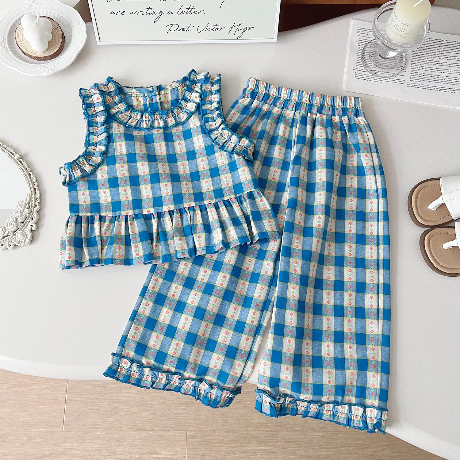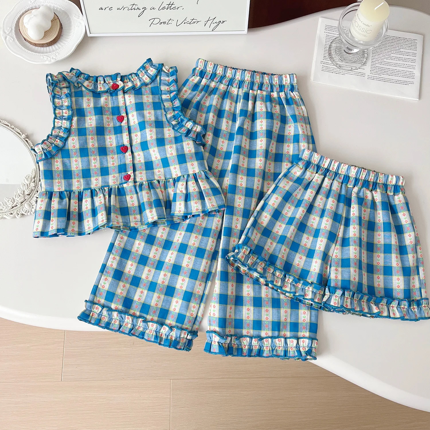 Conjuntos de 3 piezas de ropa de verano para niño niña, moda coreana a cuadros sin mangas, Tops azules para bebé, pantalones cortos y pantalones, ropa de Boutique para niños B072