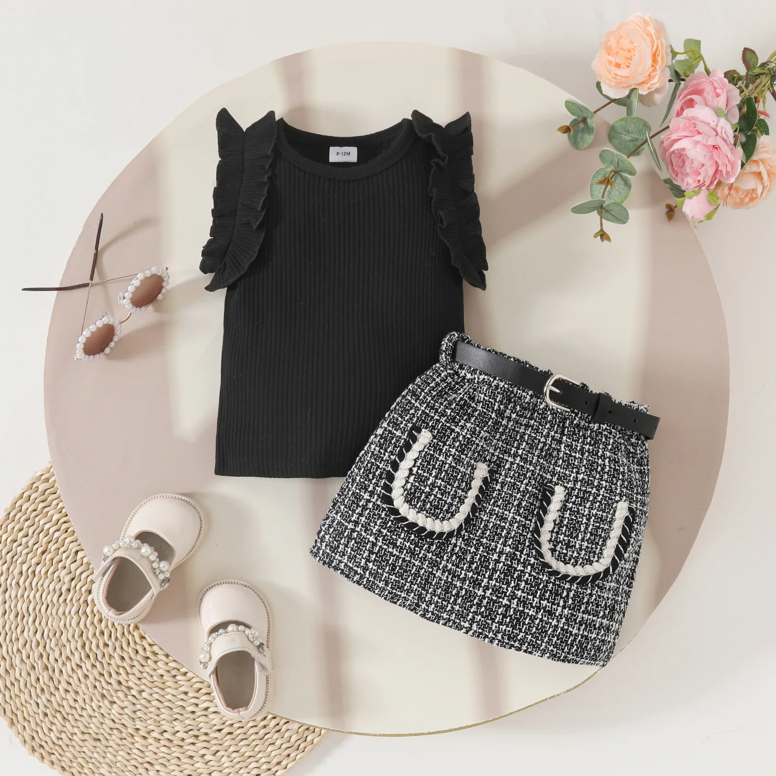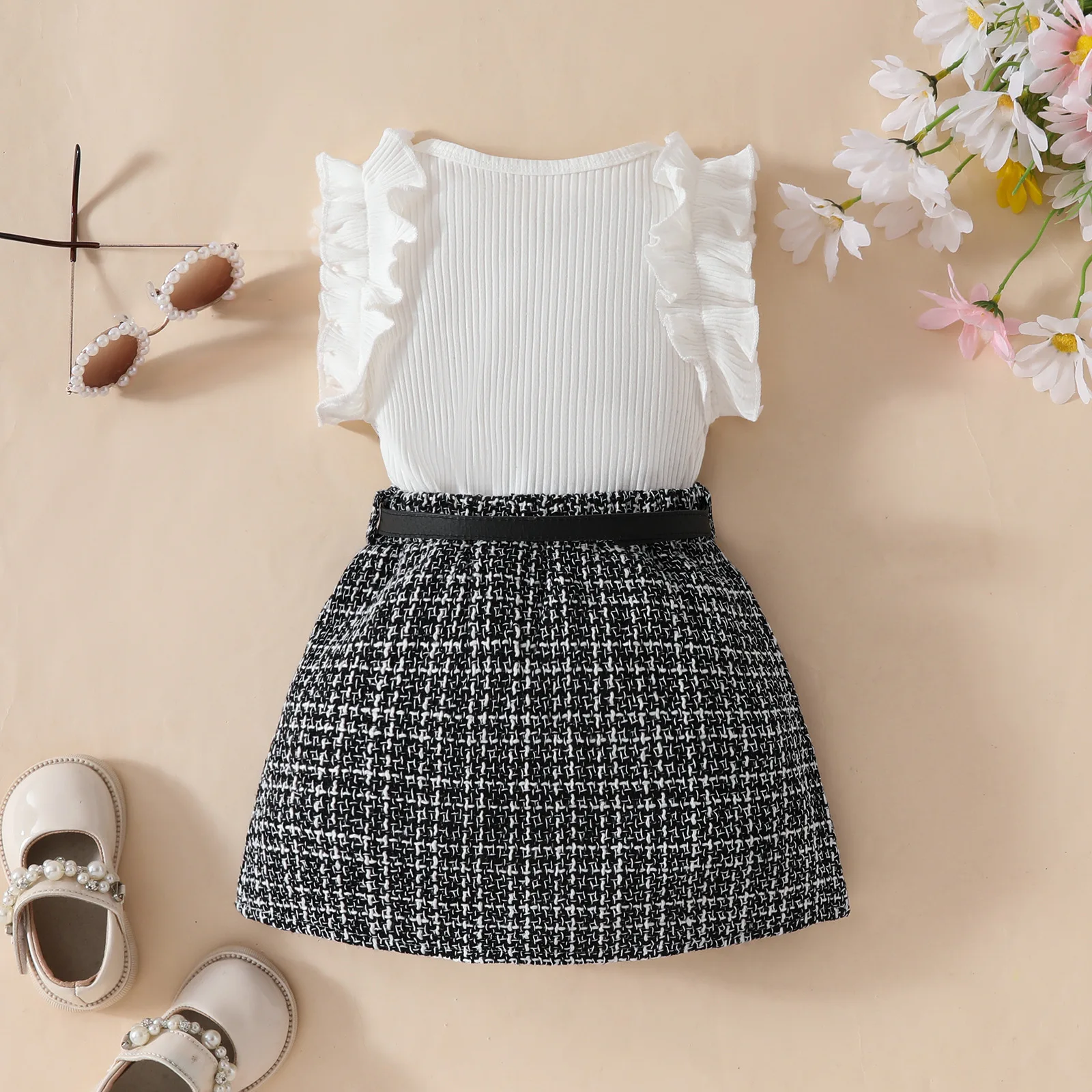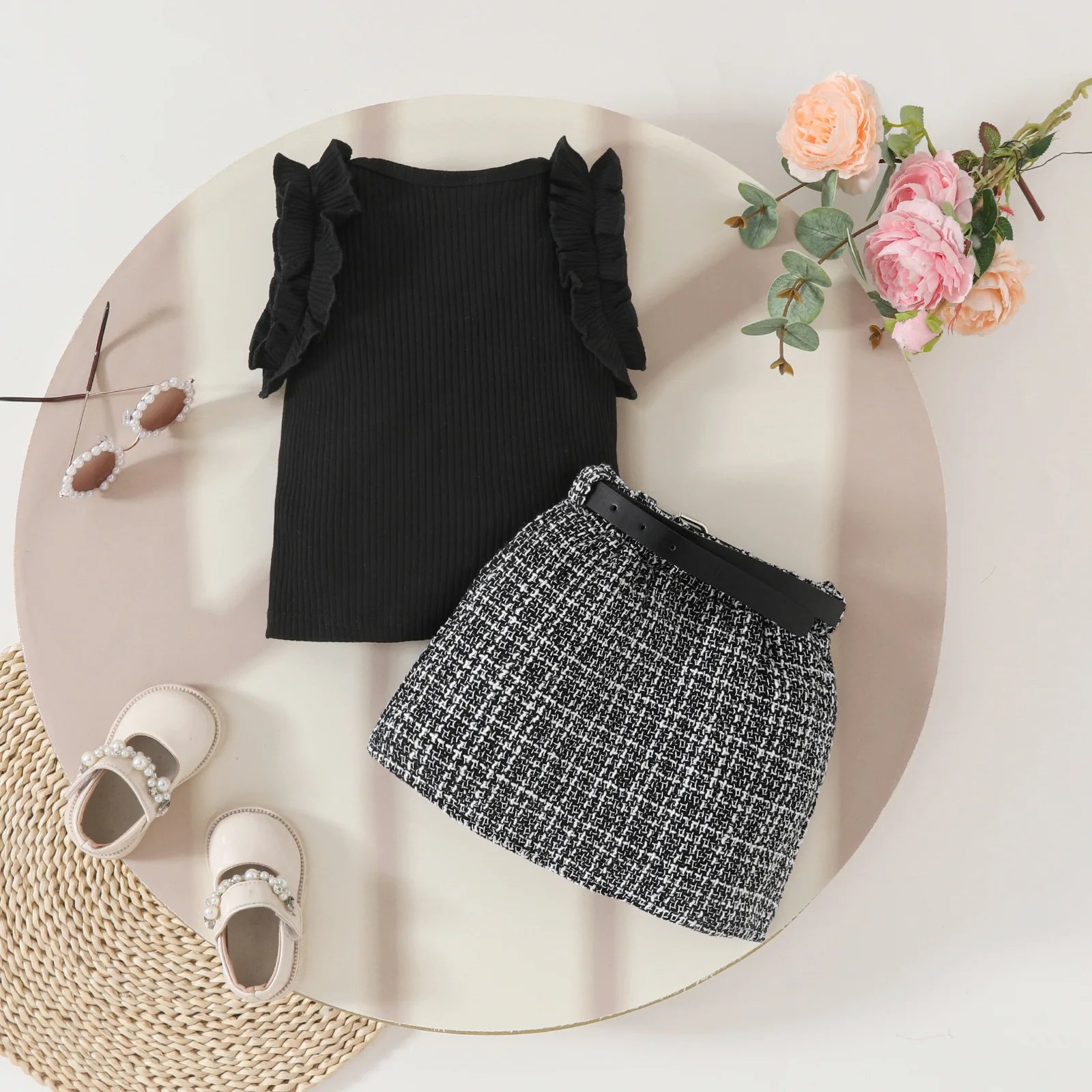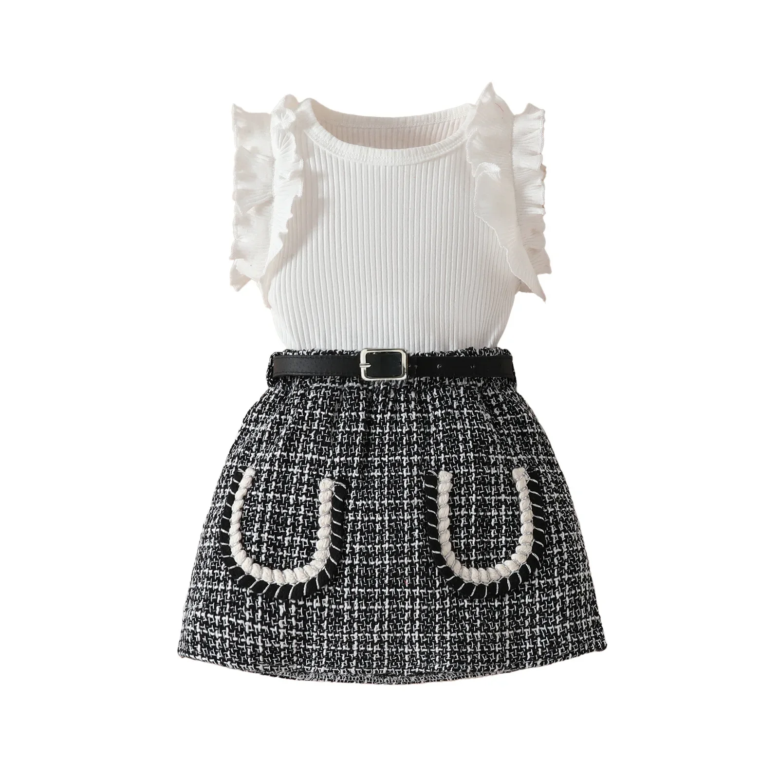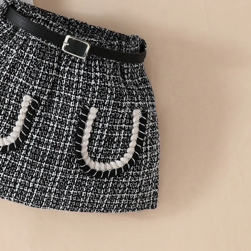 Conjuntos de 3 piezas de ropa de verano para niño niña, moda coreana, Tops negros sin mangas para bebé, falda a cuadros y cinturón, ropa de Boutique para niños BC2229