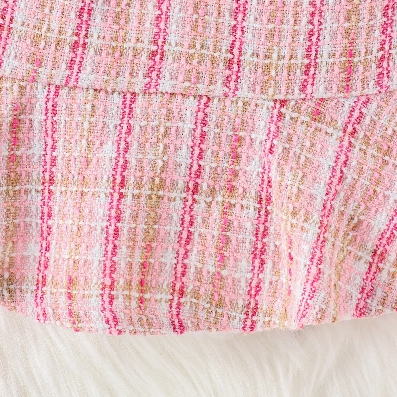 Conjuntos de 4 piezas de ropa de otoño para niñas, moda coreana, abrigo de Tweed rosa de princesa a cuadros, Tops, falda y bolsa, ropa de Boutique para bebés BC525