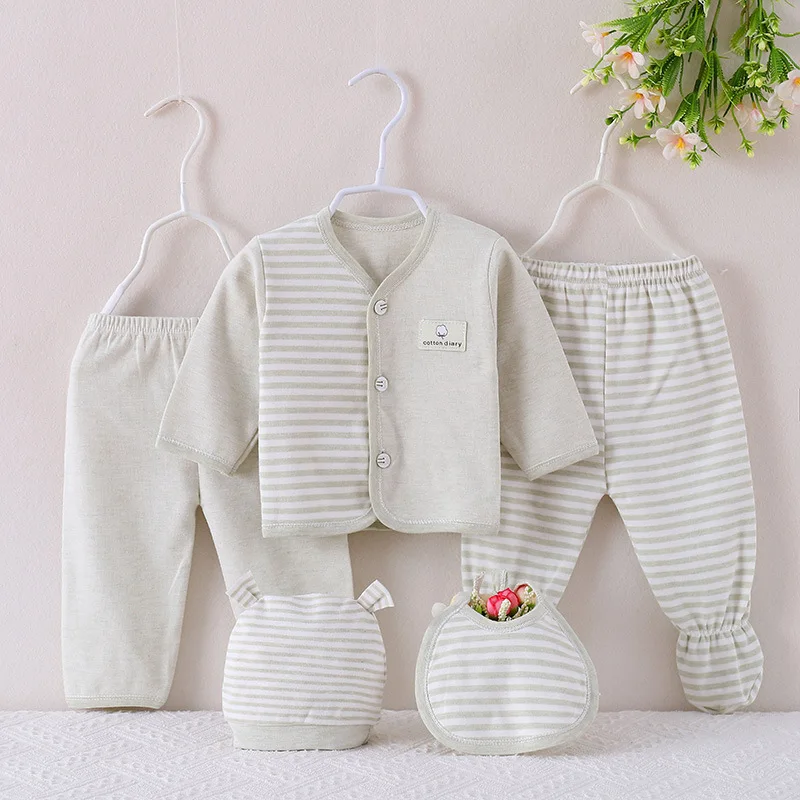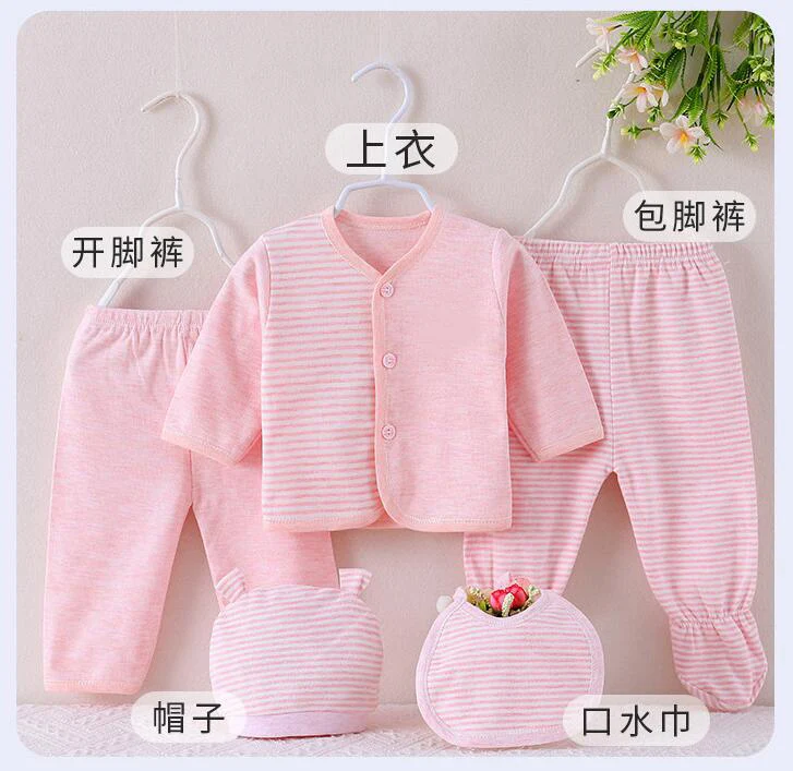 Conjuntos de 5 piezas de primavera y otoño para niños y niñas, Tops informales de algodón de manga larga a rayas, pantalones, sombrero y Baberos, ropa para bebés recién nacidos BC509