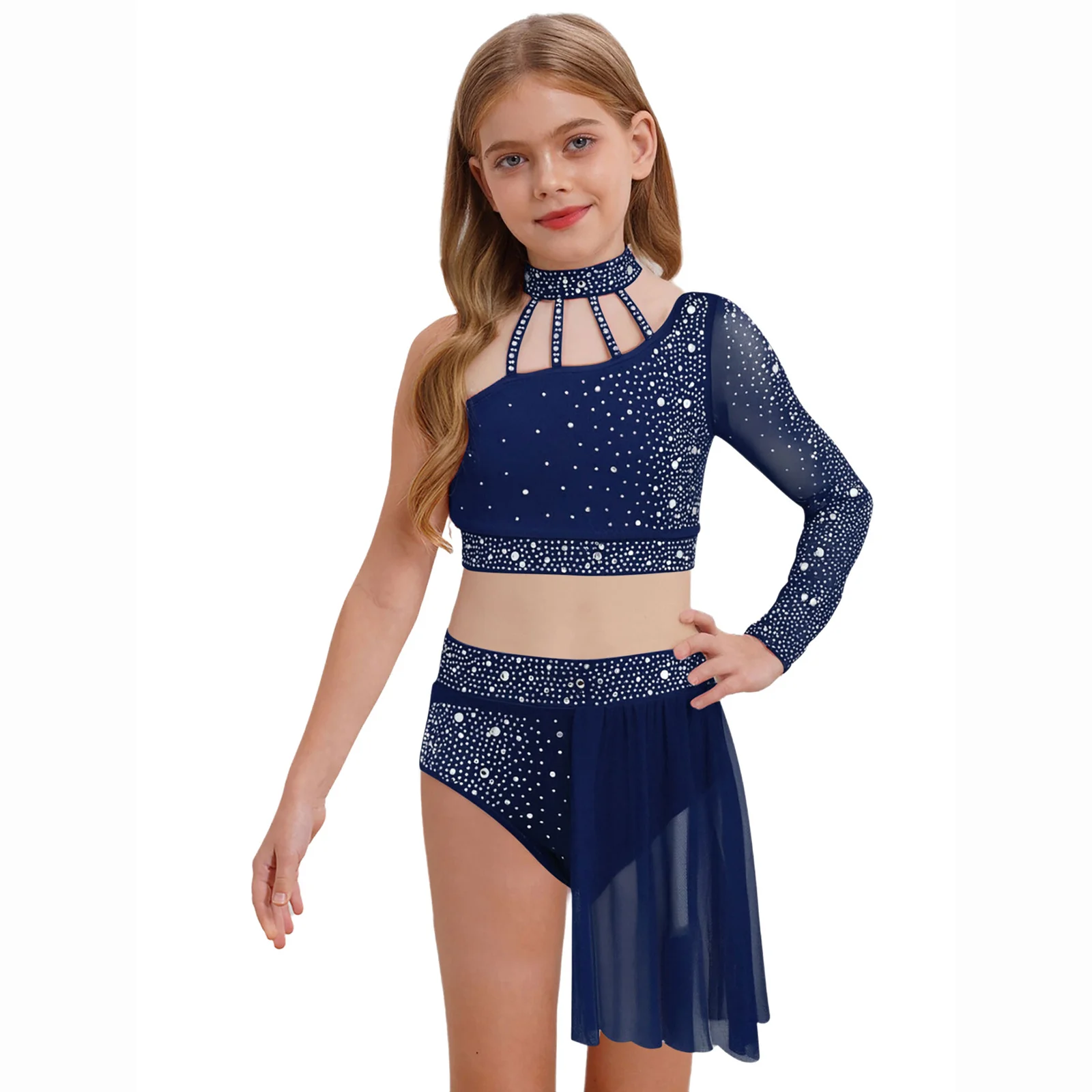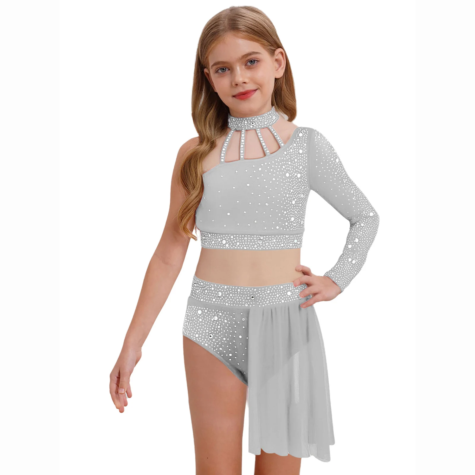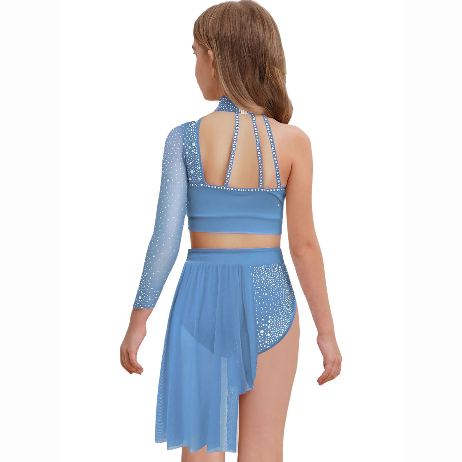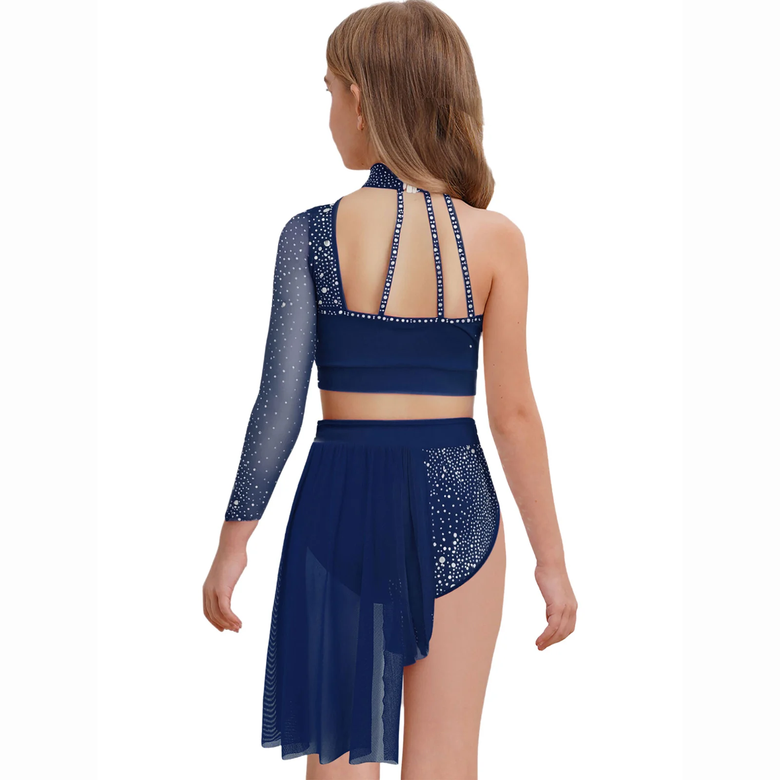 Top corto de un hombro con diseño de tiras y manga larga de malla transparente, elegante y único, hace que su hijo se destaque entre la multitud.