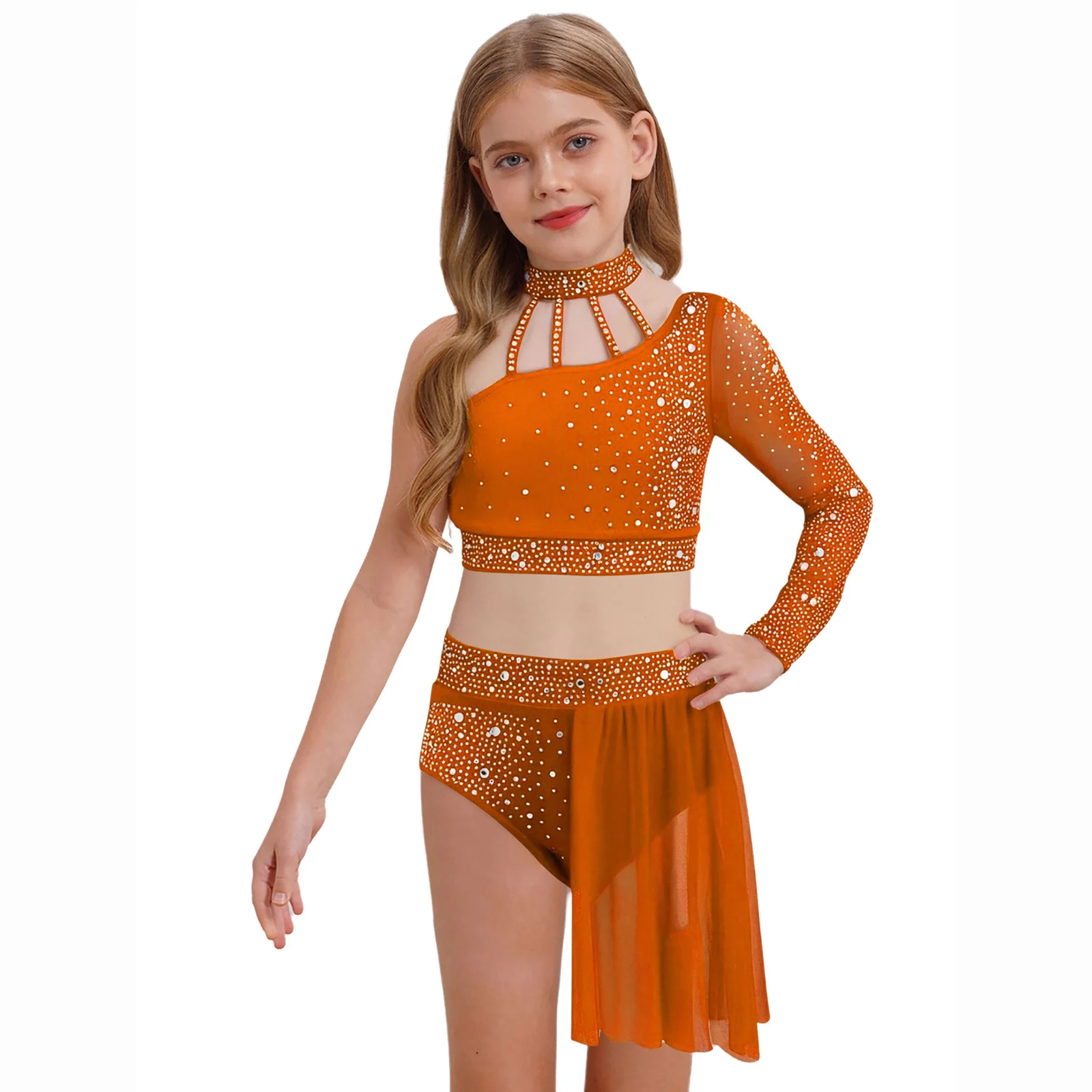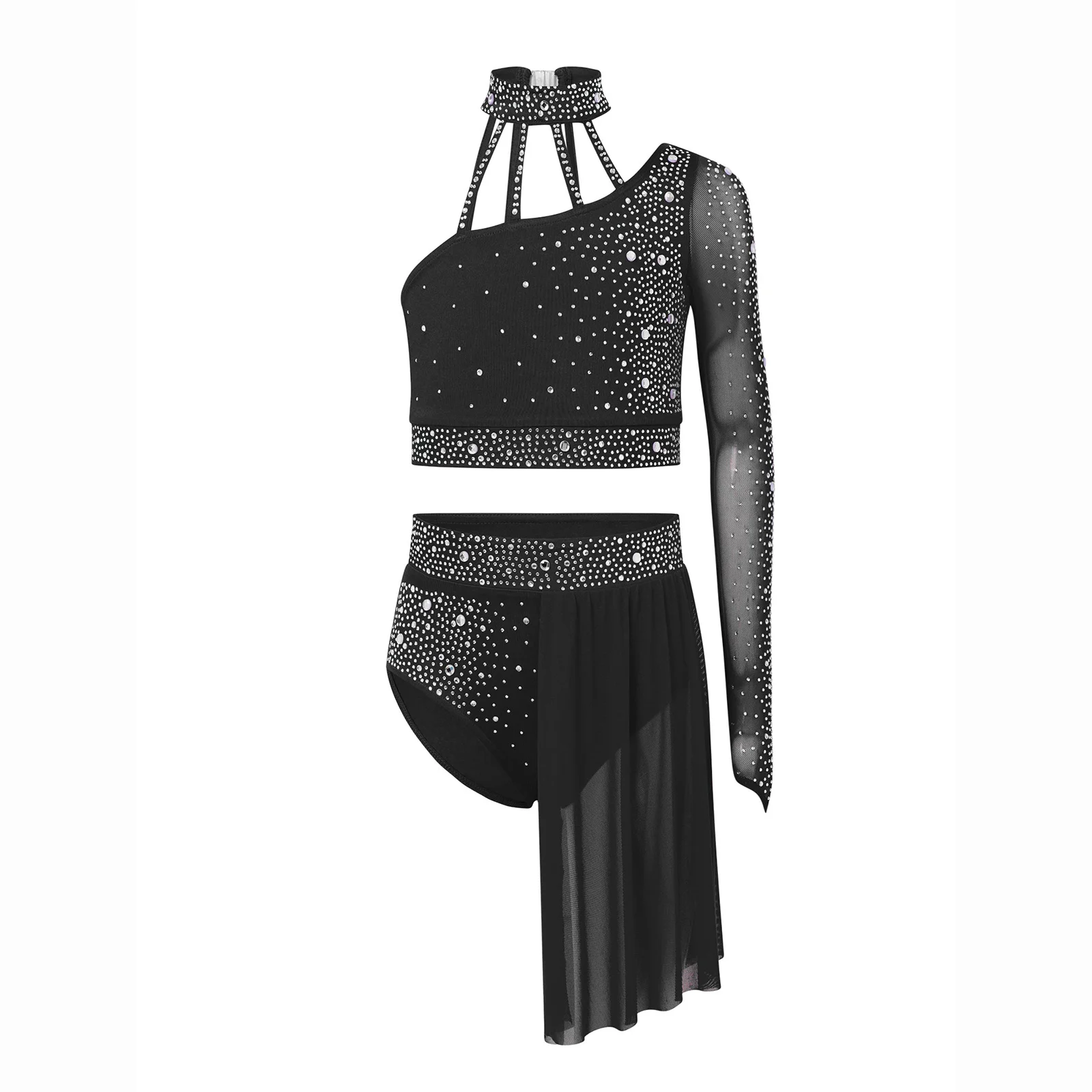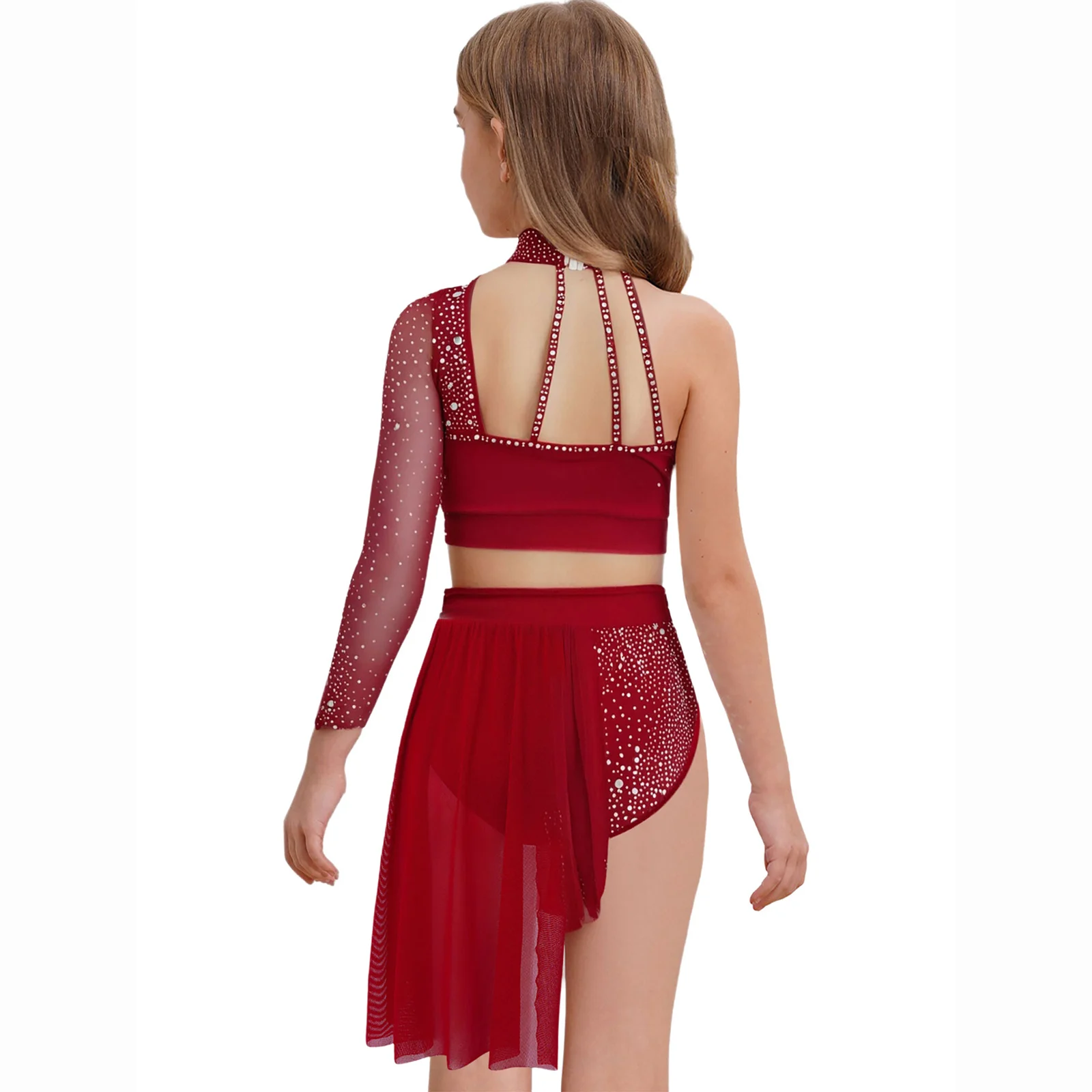 Top corto de un hombro con diseño de tiras y manga larga de malla transparente, elegante y único, hace que su hijo se destaque entre la multitud.