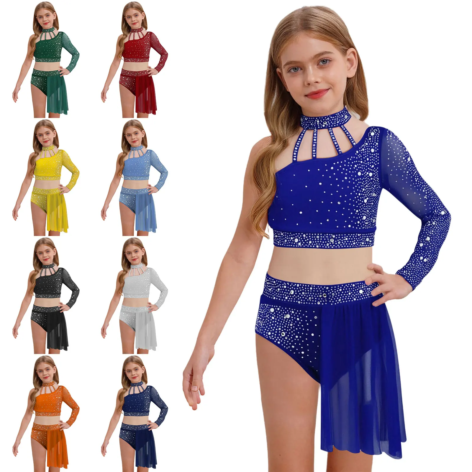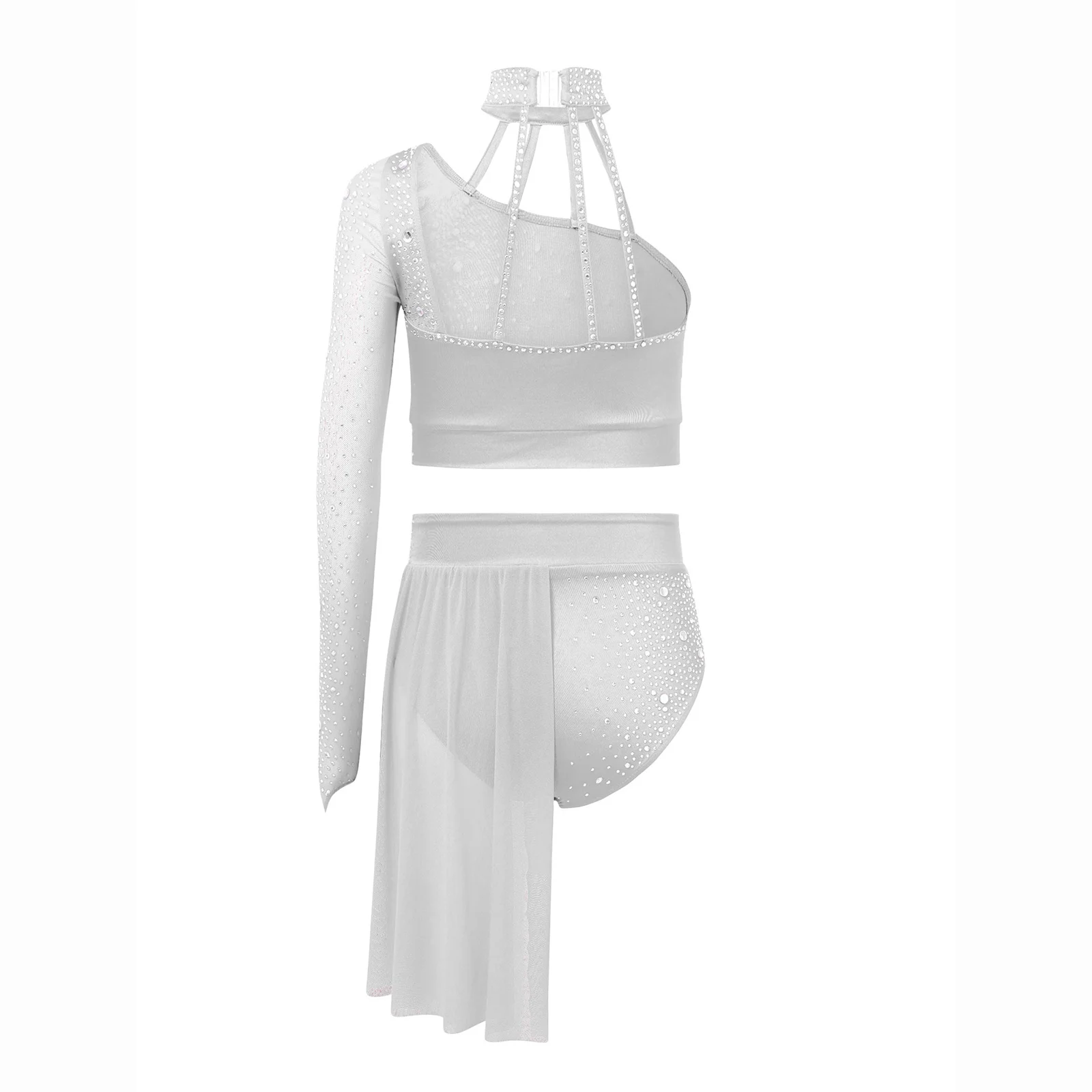 Traje de actuación de danza lírica para niñas con pedrería que brillan bajo la luz para alegrar cualquier actuación.