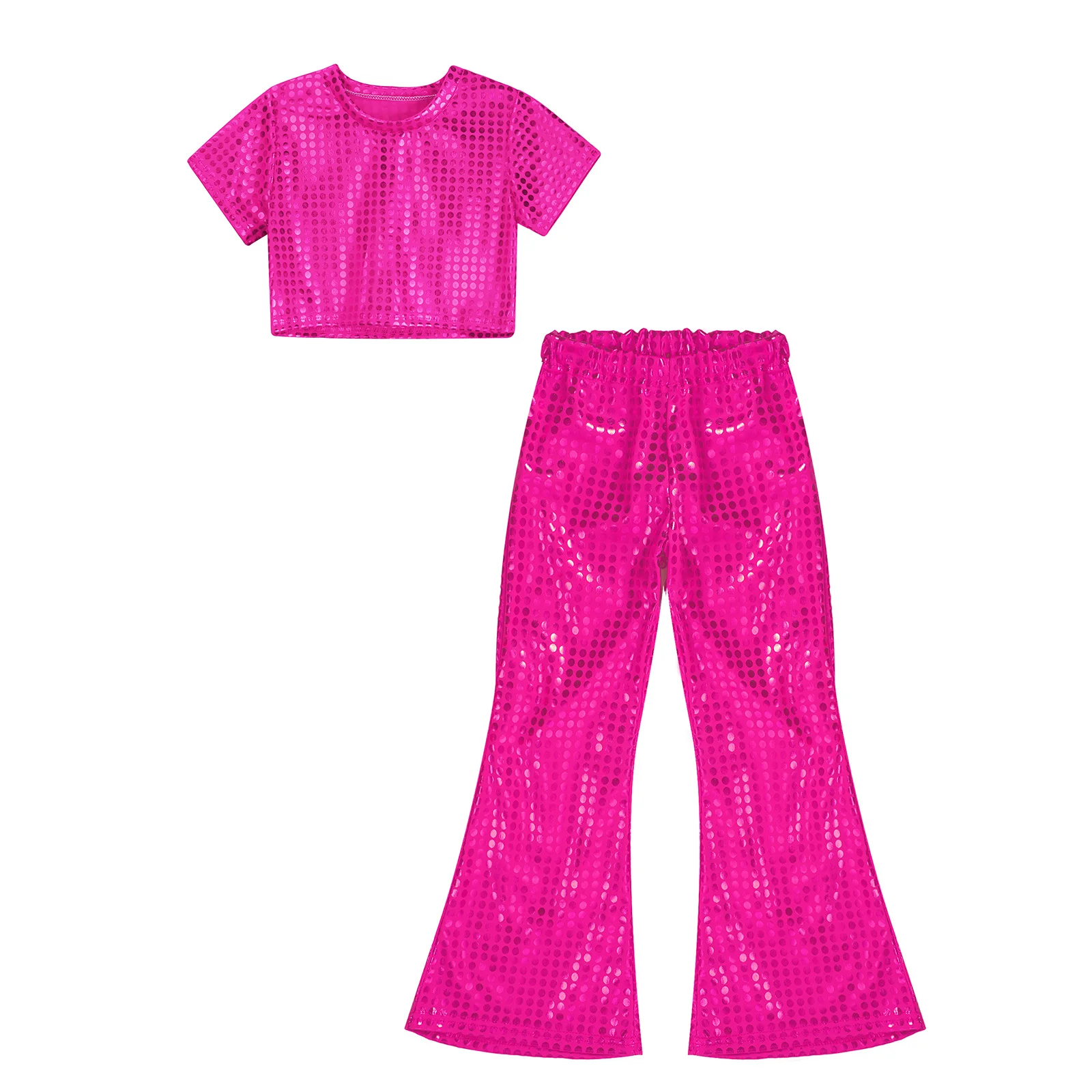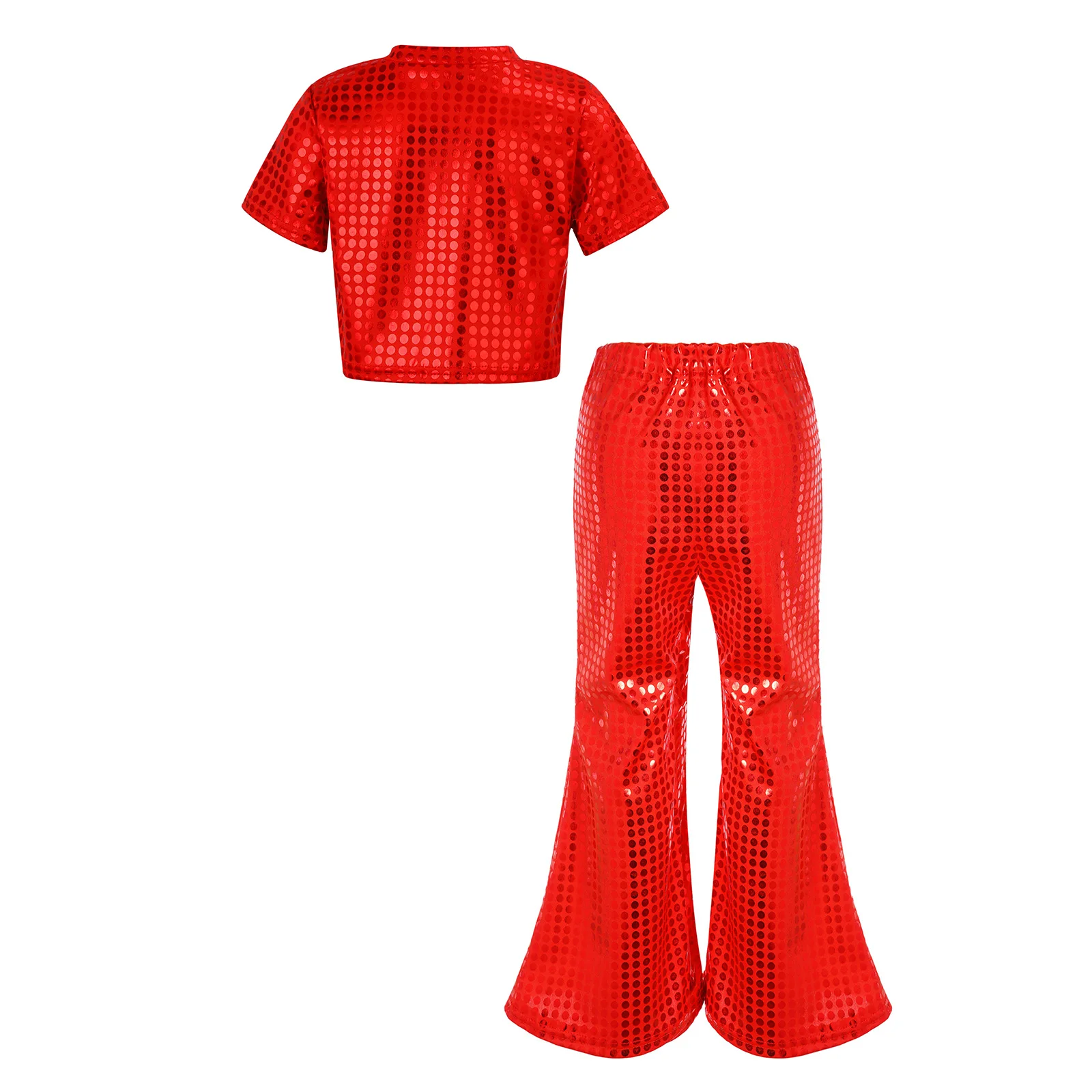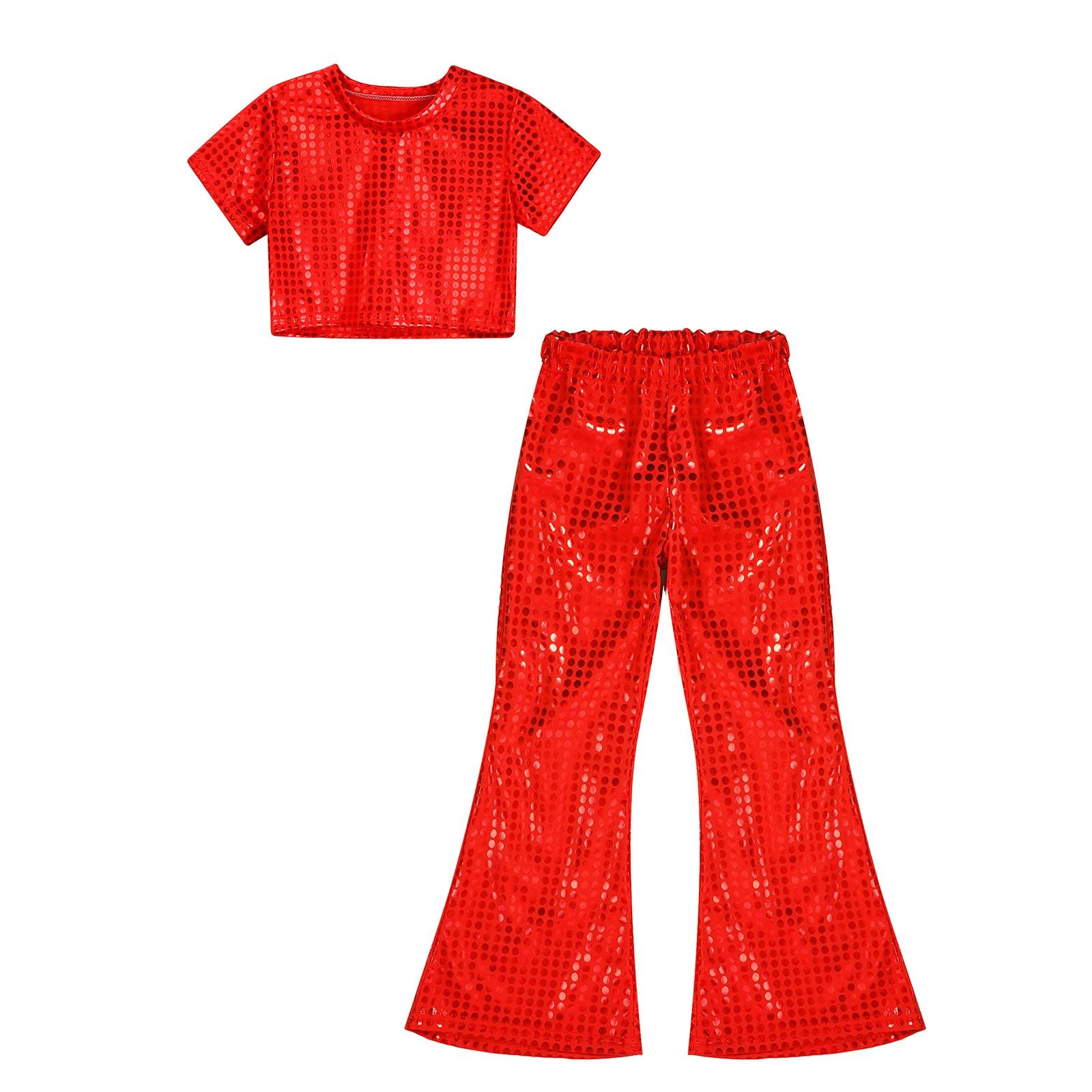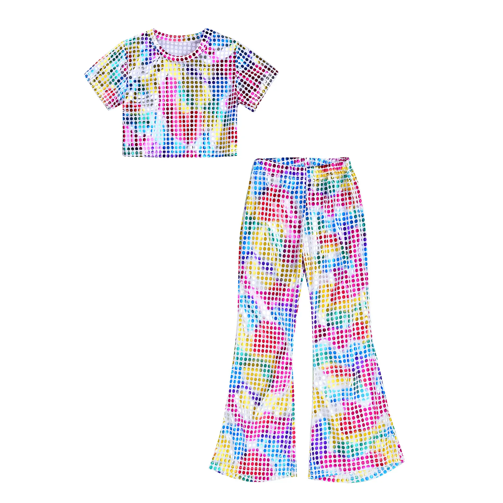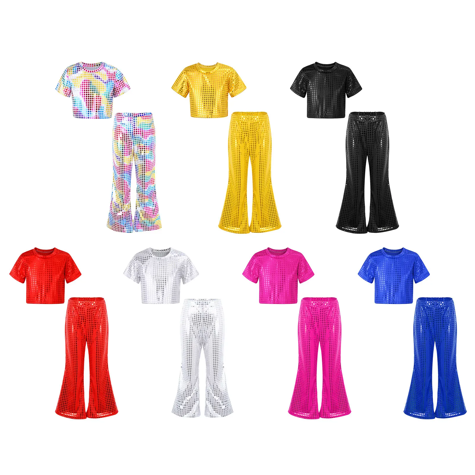 Comprar Conjuntos de baile de Jazz latino para niñas, traje de baile corto, Top corto con pantalones acampanados para trajes, fiesta de baile, puesta en escena