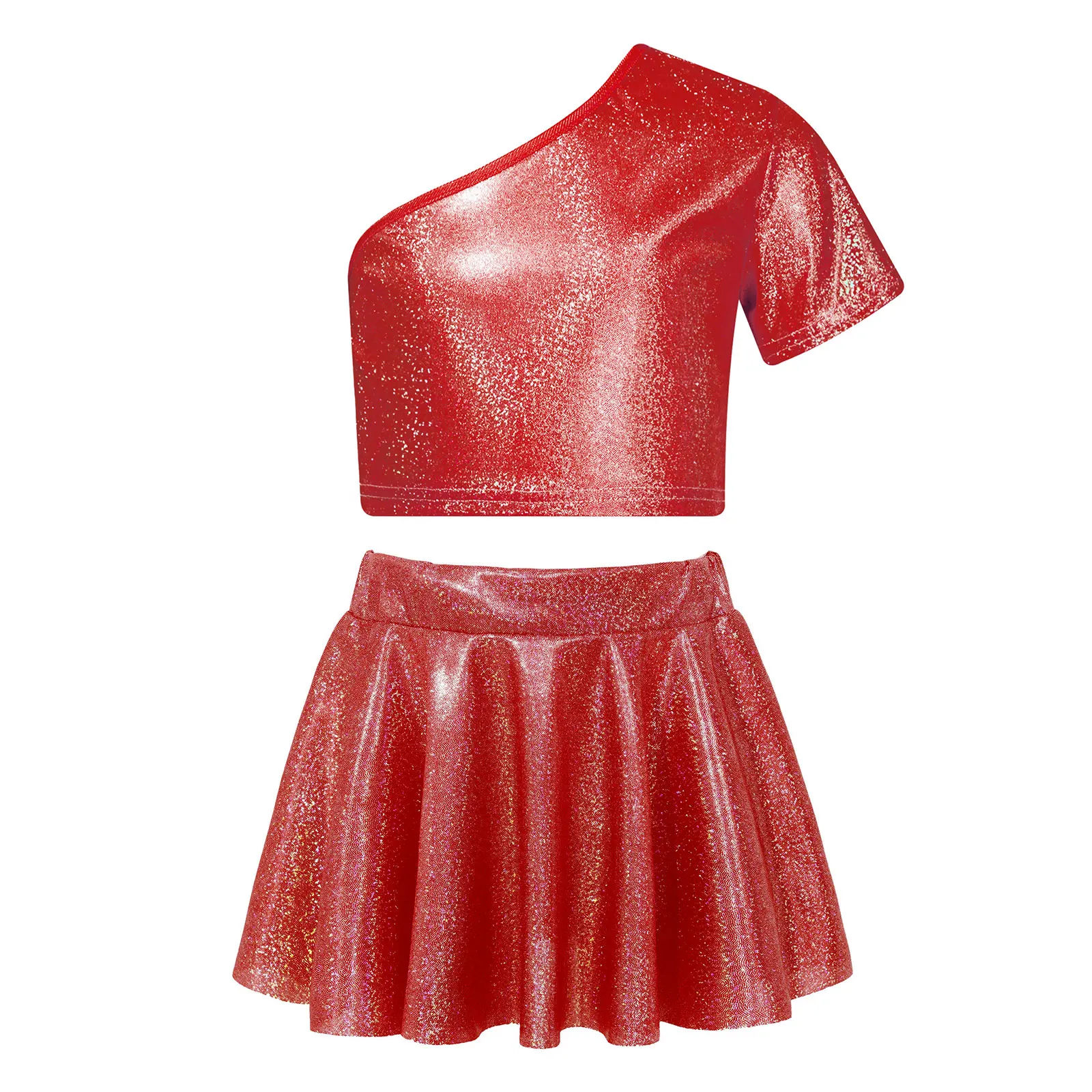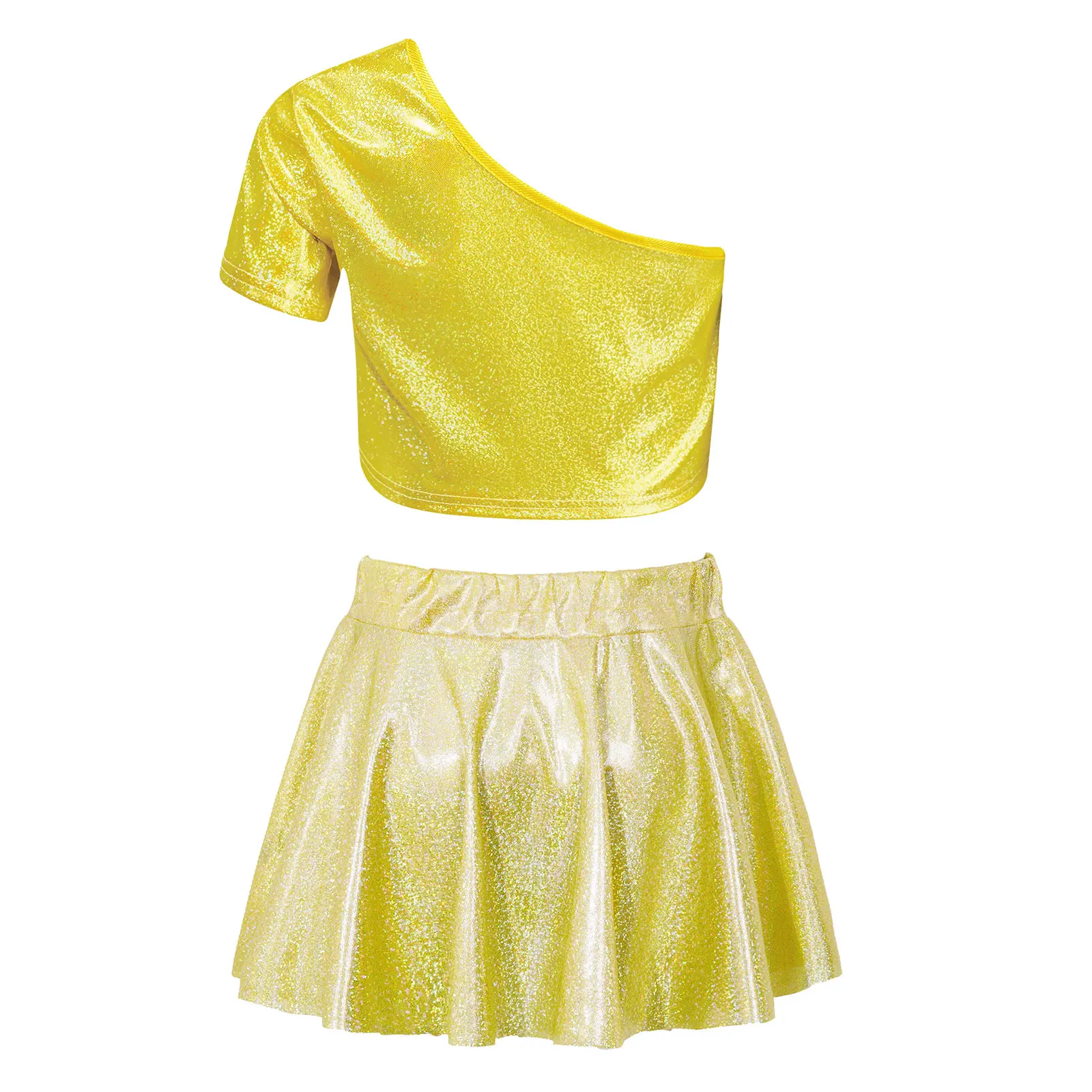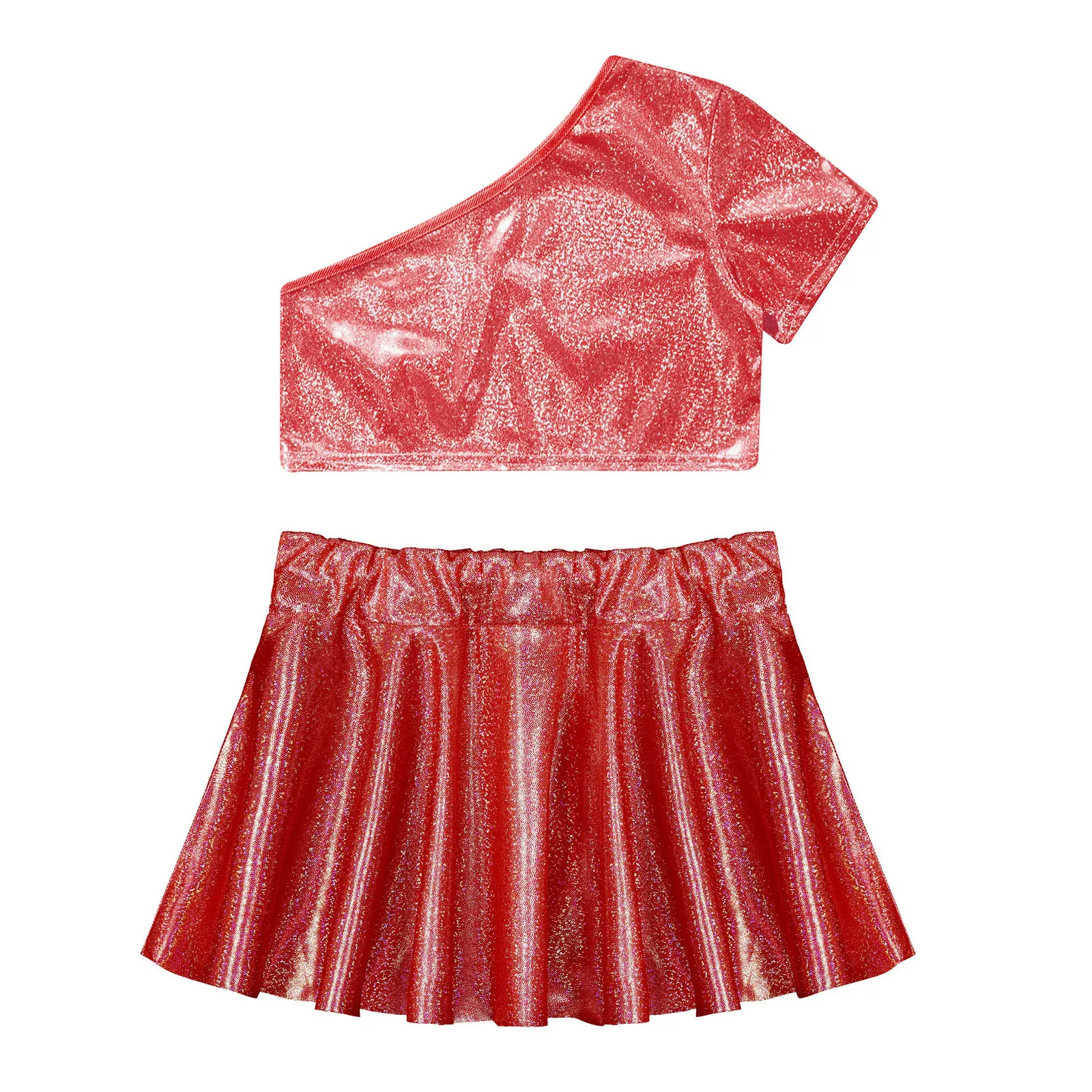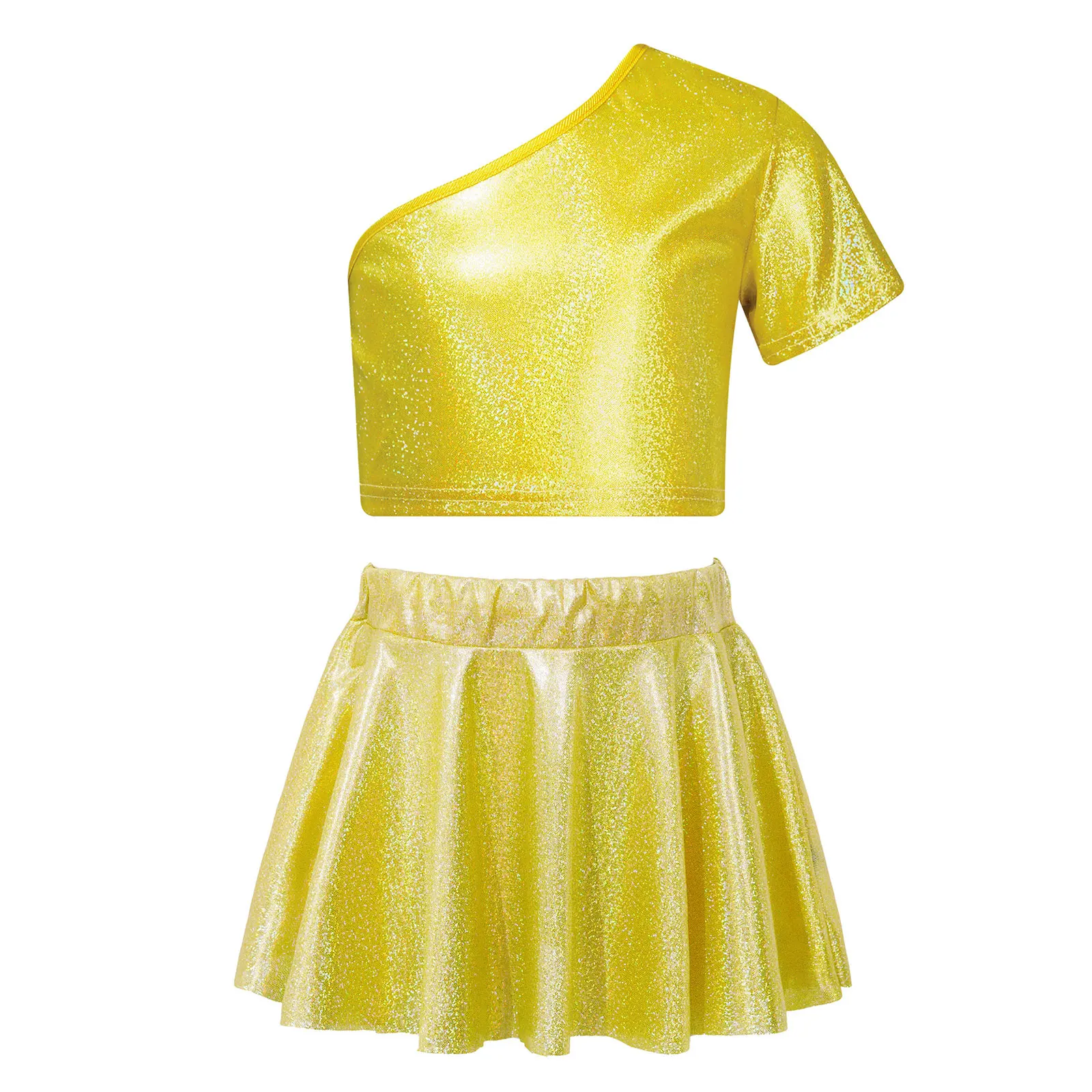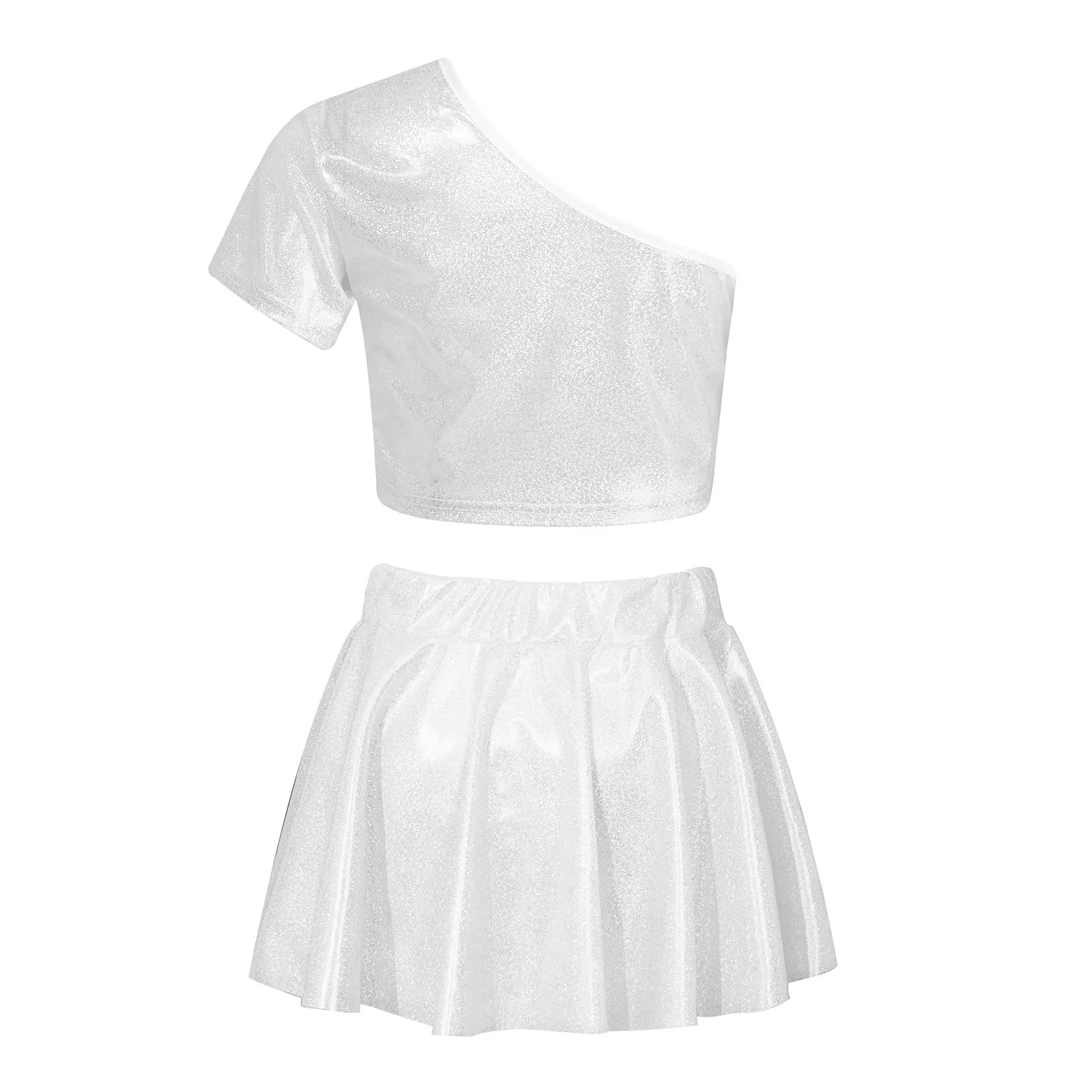 El top corto con diseño de un solo hombro luce elegante y distintivo.La falda a juego con cinturilla elástica para un mejor ajuste.