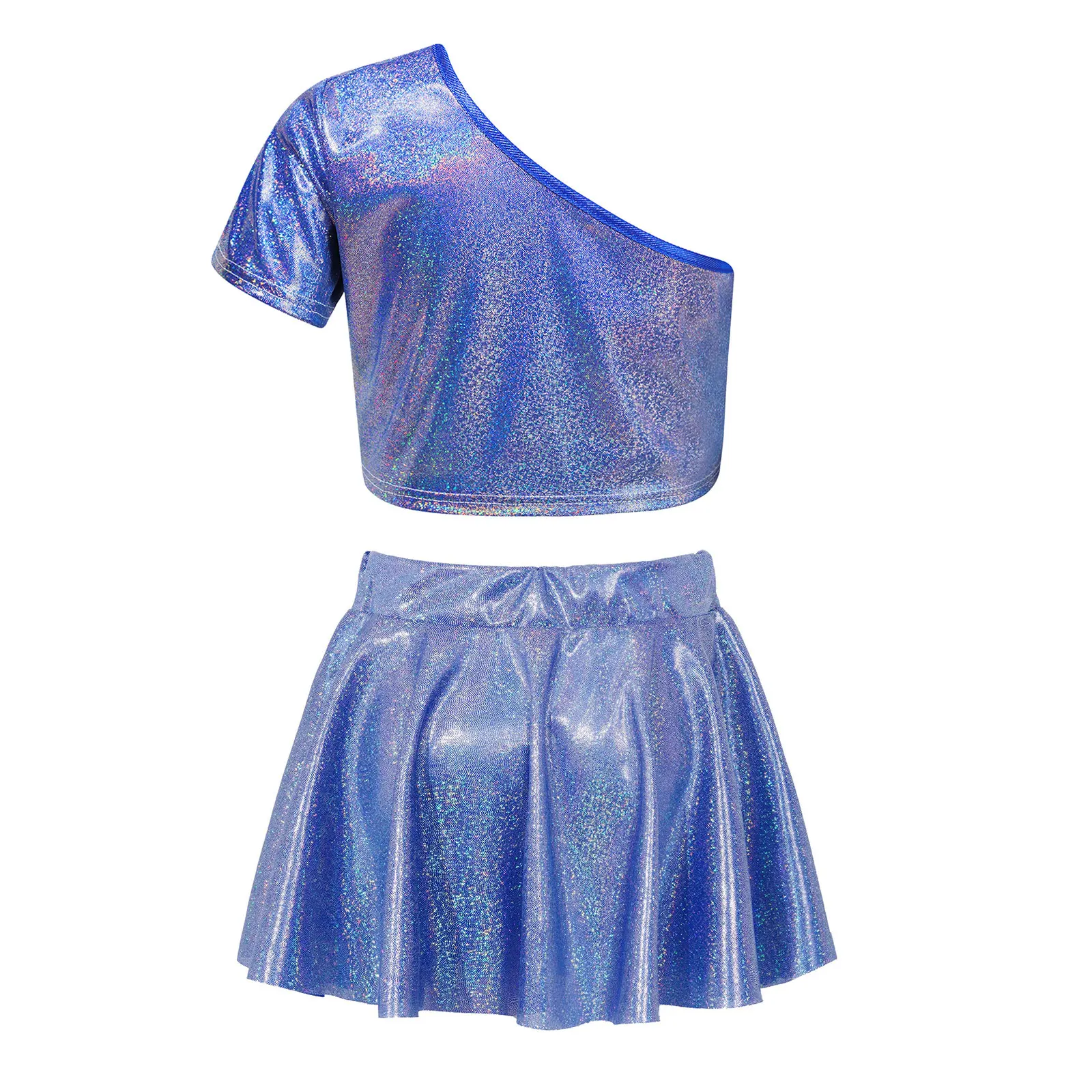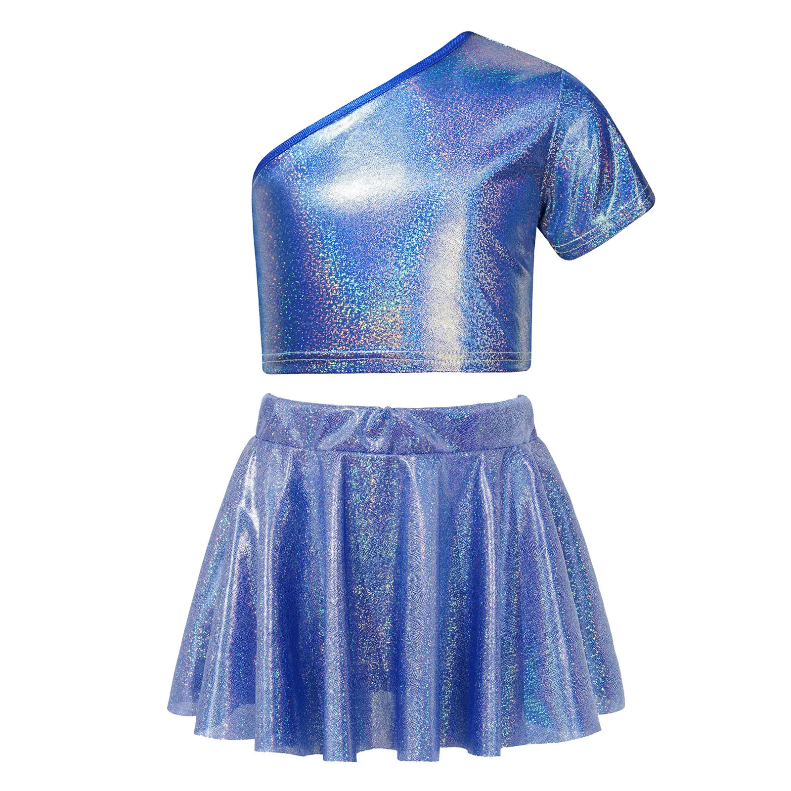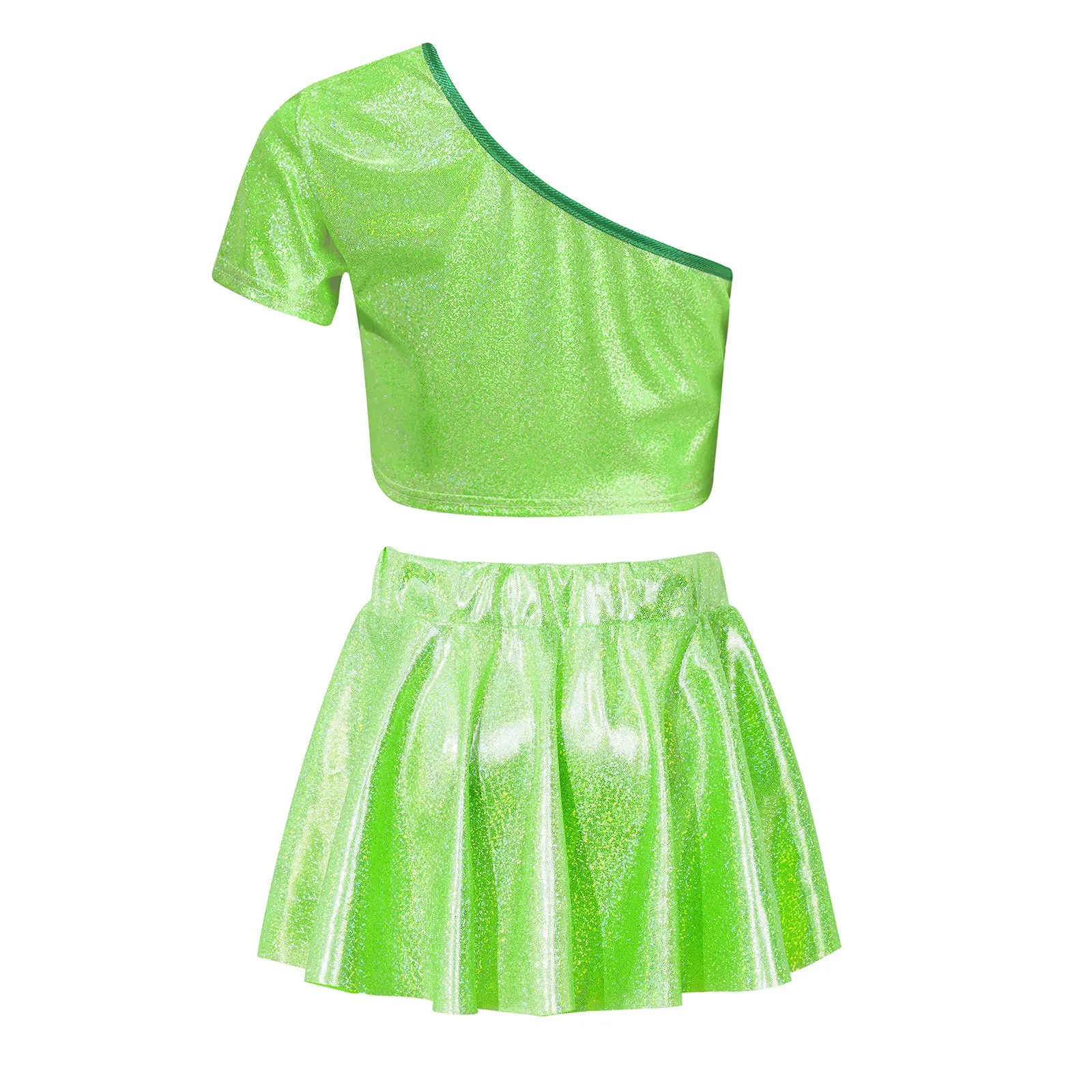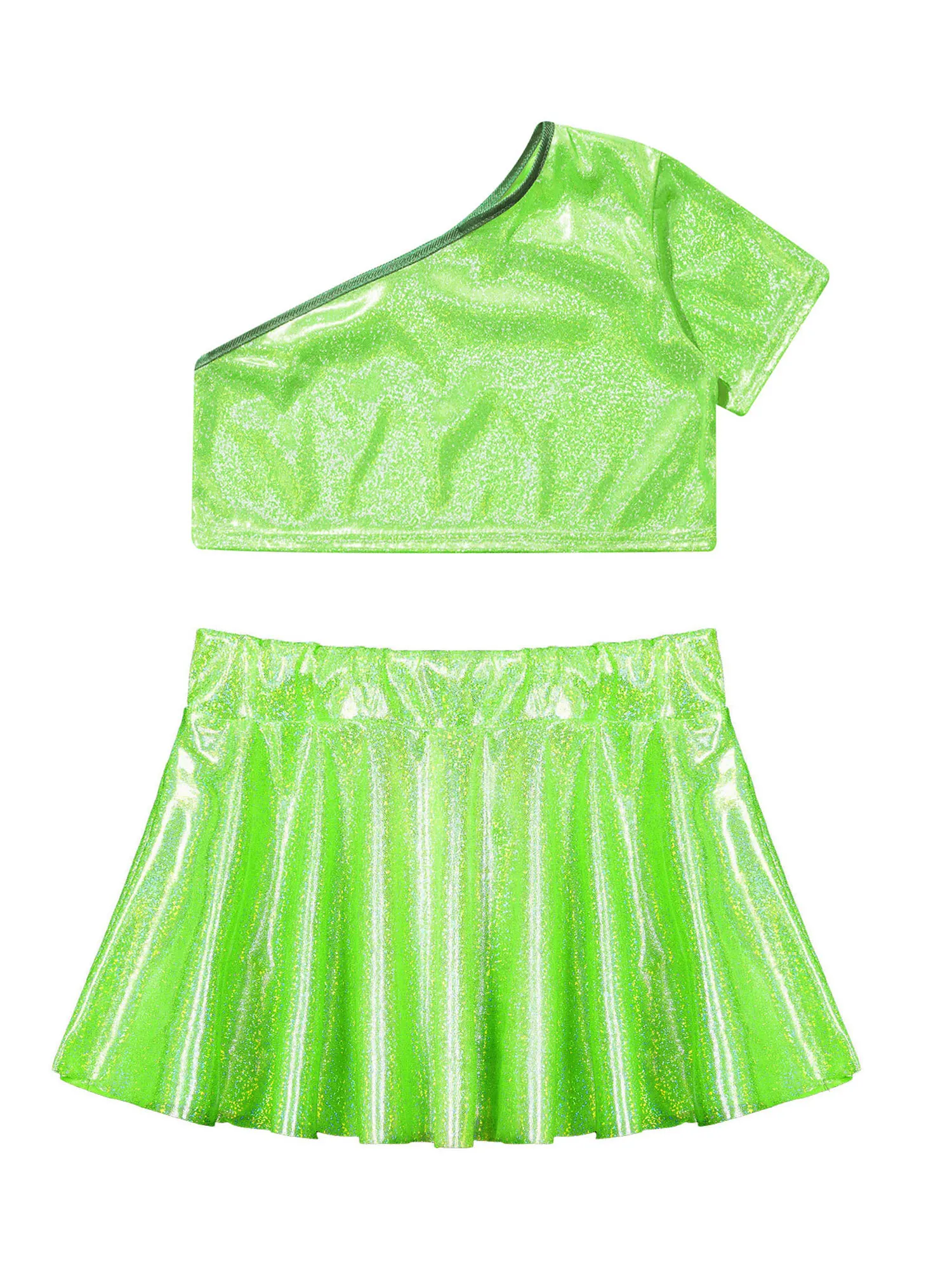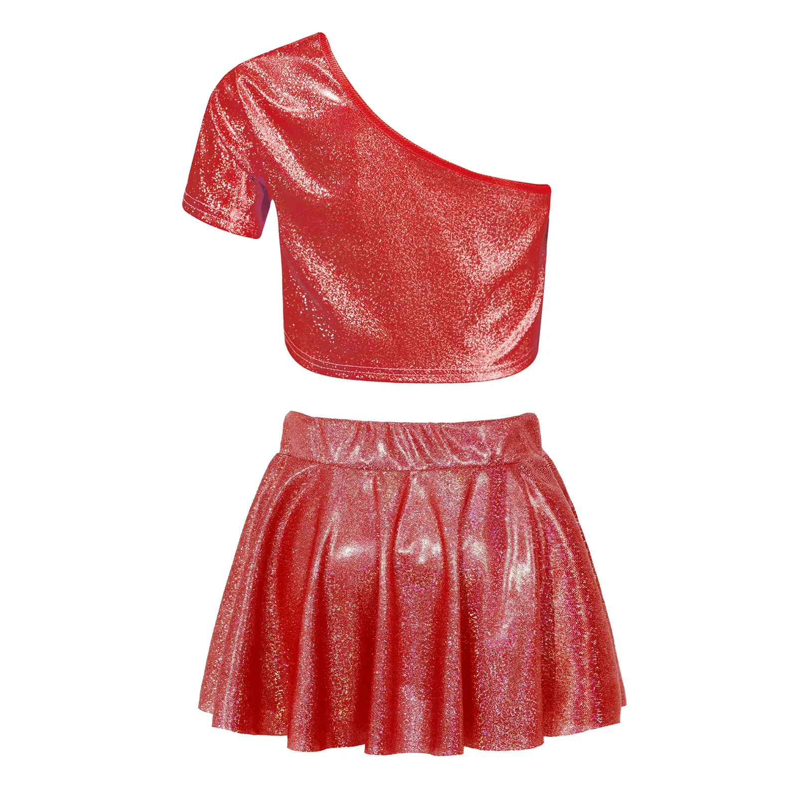 El top corto con diseño de un solo hombro luce elegante y distintivo.La falda a juego con cinturilla elástica para un mejor ajuste.