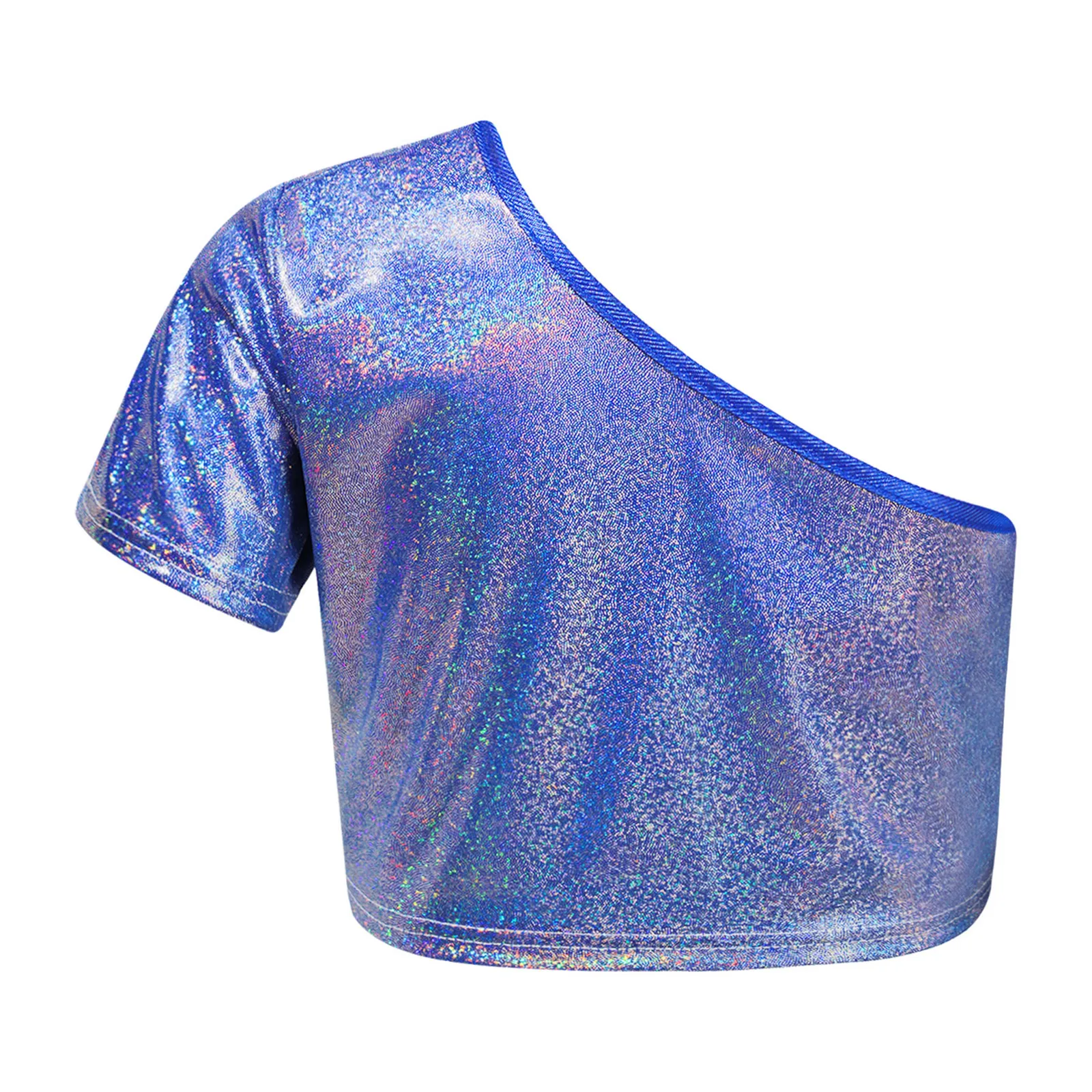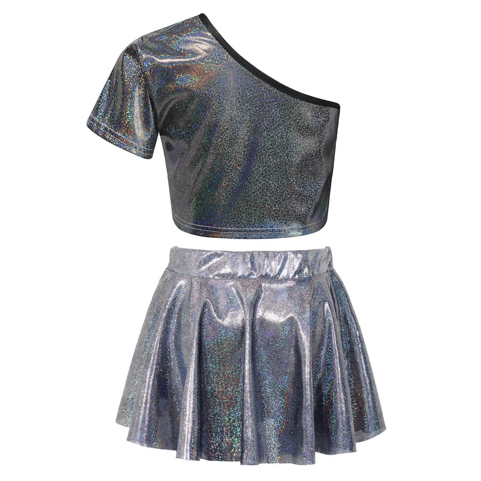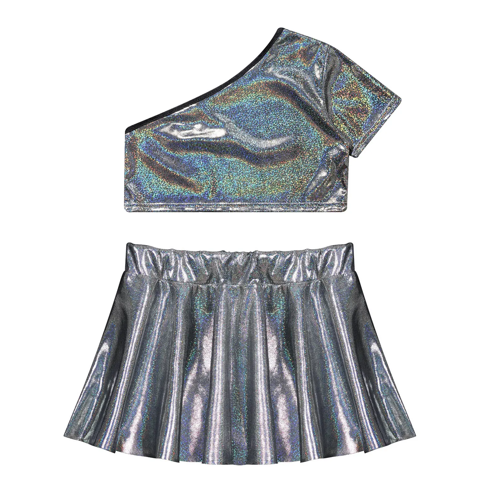 El traje de baile para niña con superficie metálica que brilla bajo la luz garantiza que sus hijos llamen la atención en el escenario.