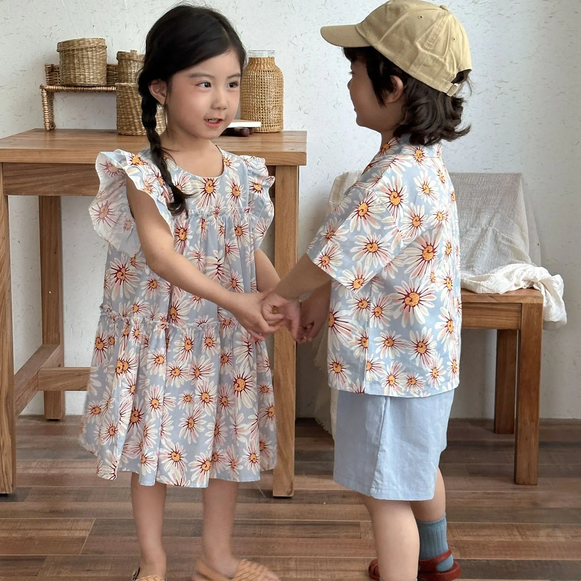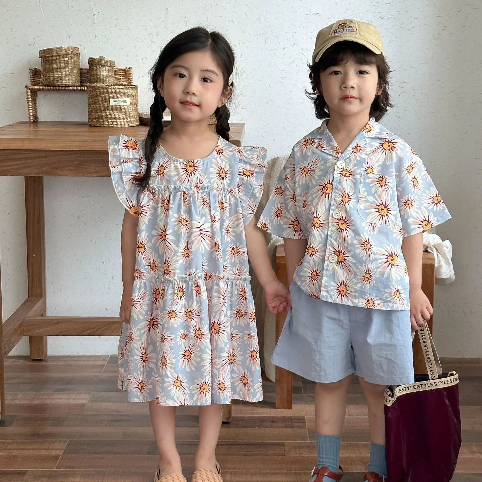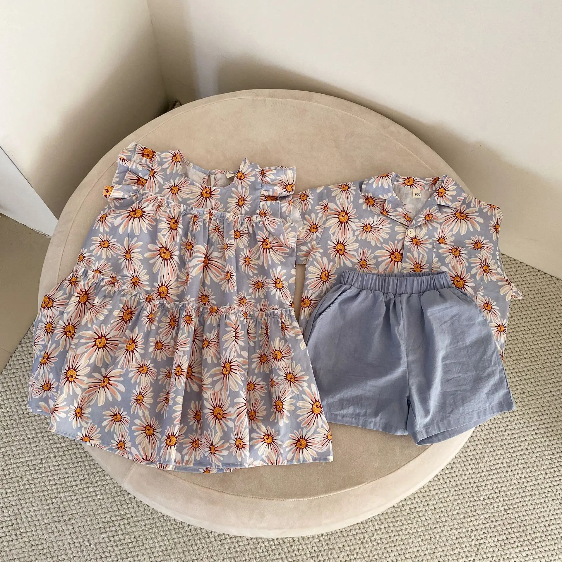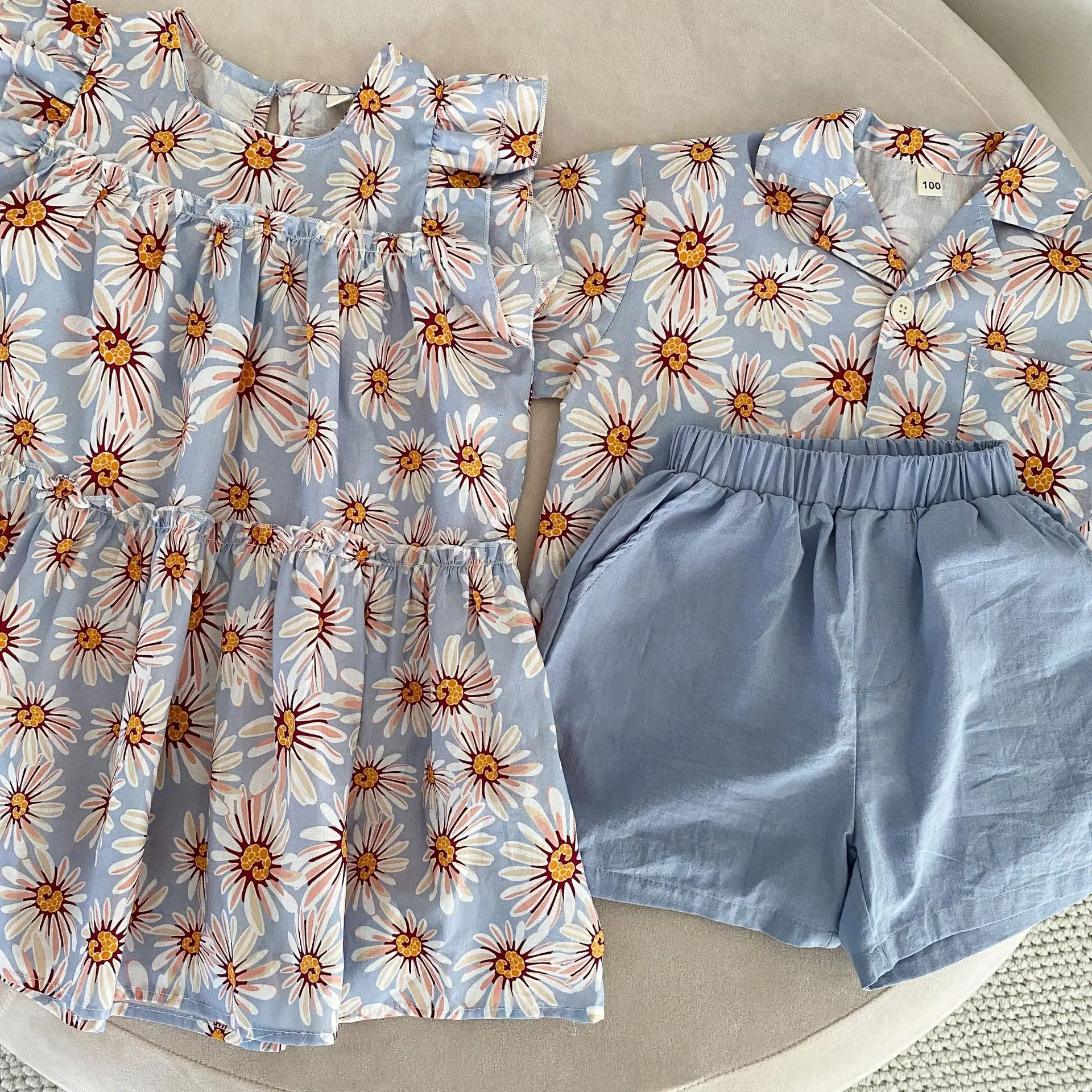 Comprar Conjuntos a juego de verano para niños y niñas, camisa cómoda de algodón, pantalones cortos, vestido Floral acampanado sin mangas, traje para hermanos