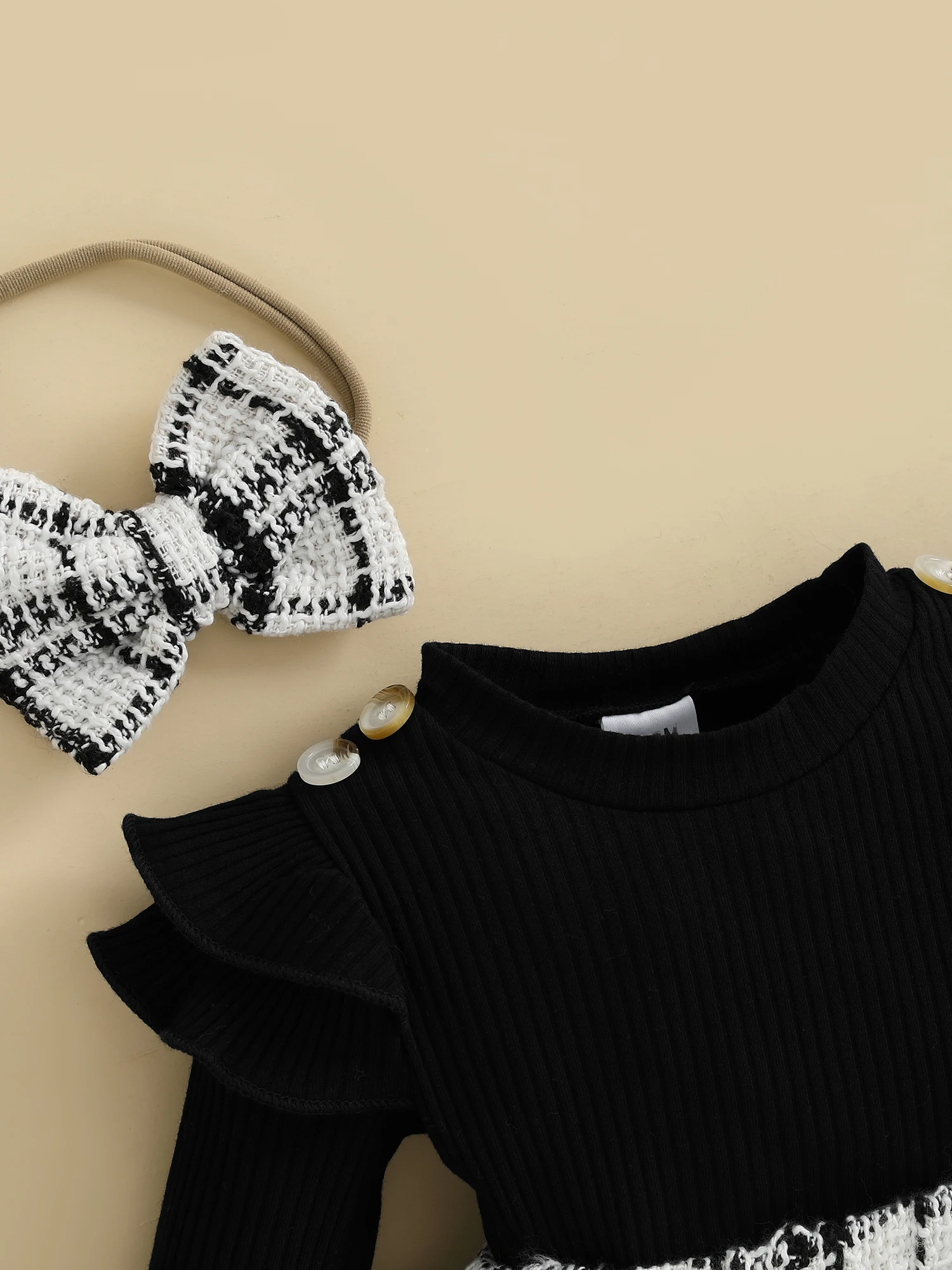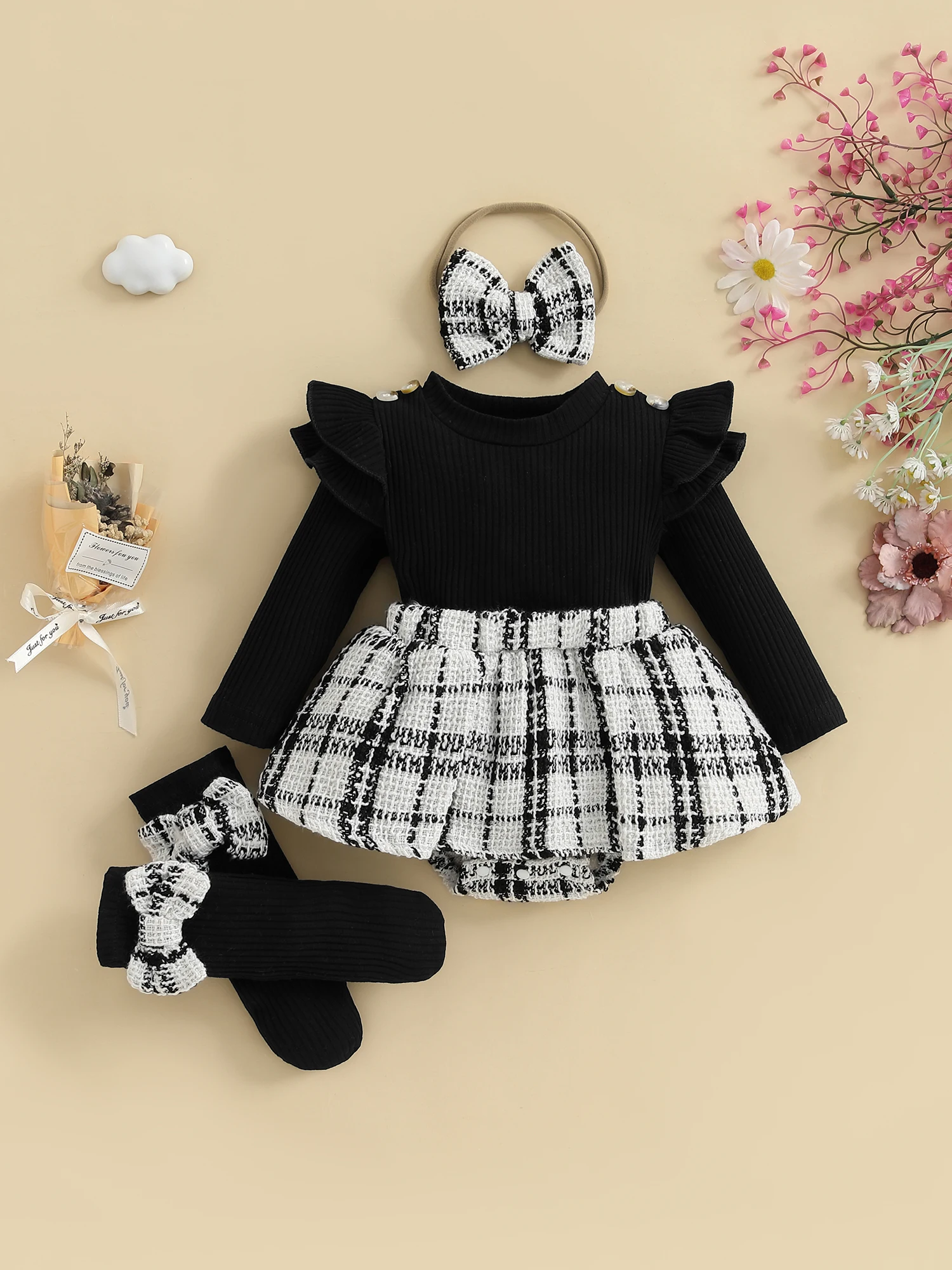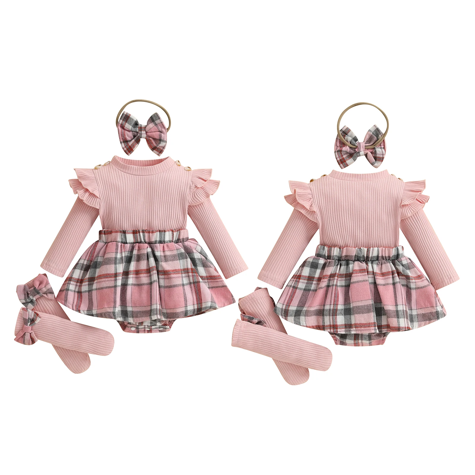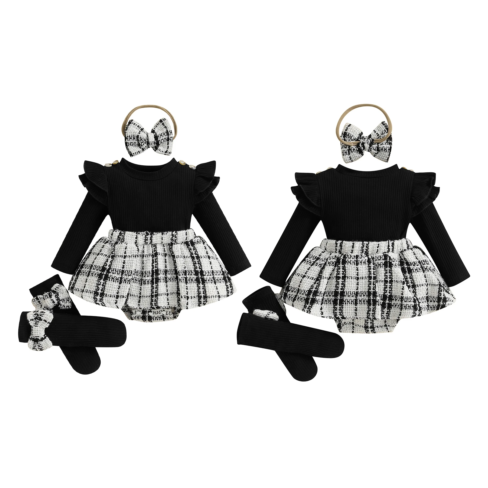 Trajes de otoño para niña, falda con estampado a cuadros de manga larga, mono con diadema, conjunto de calcetines, ropa infantil