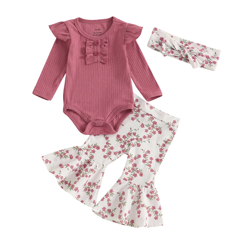Comprar Conjuntos de pantalones de 3 piezas para niñas pequeñas, pelele acanalado de manga larga con cuello redondo, pantalones acampanados florales, conjuntos de diadema