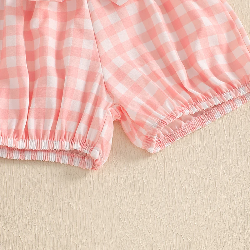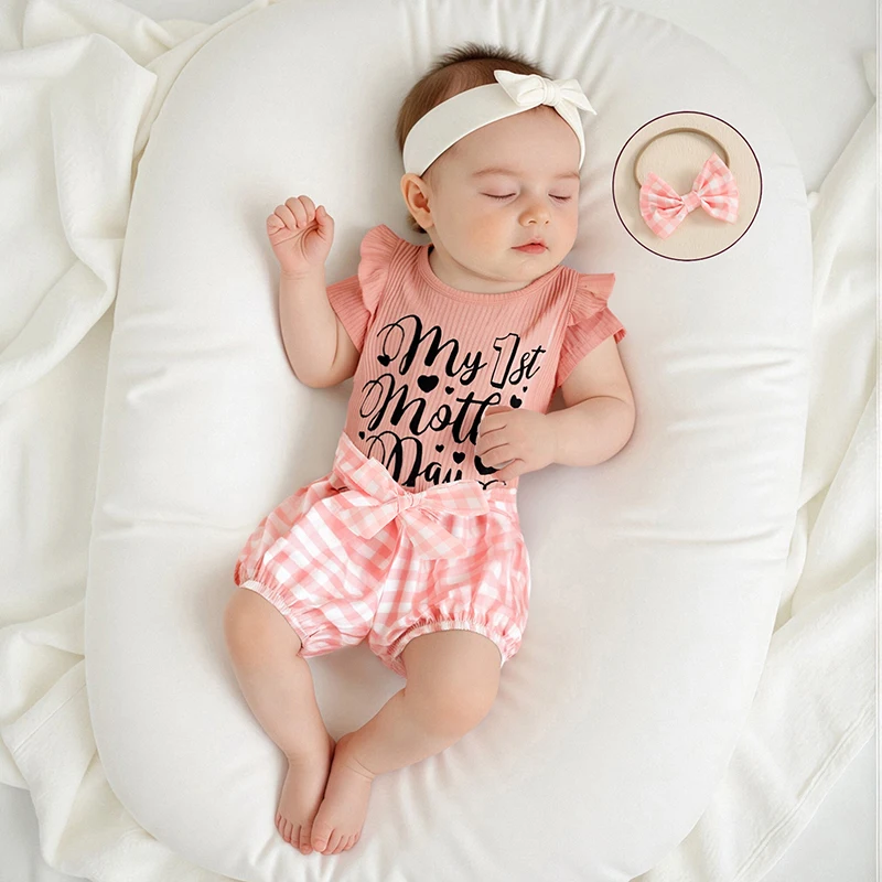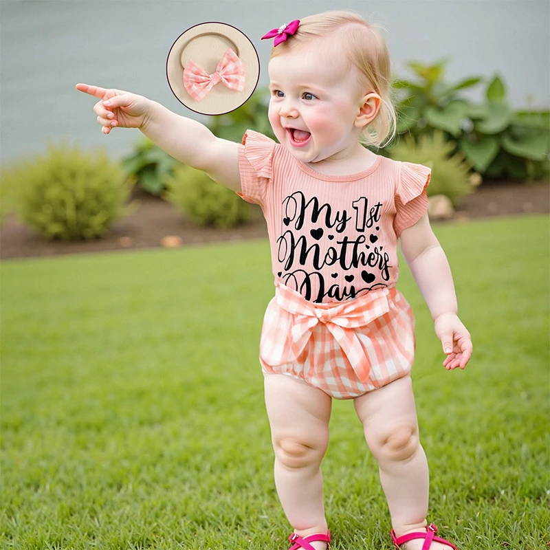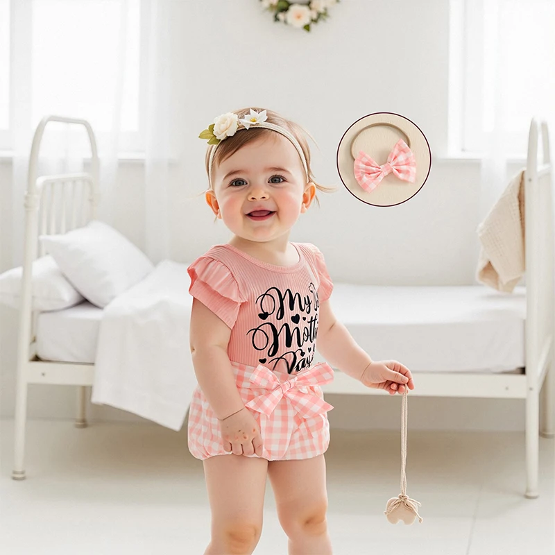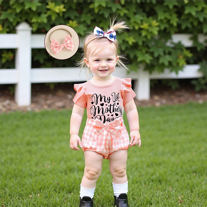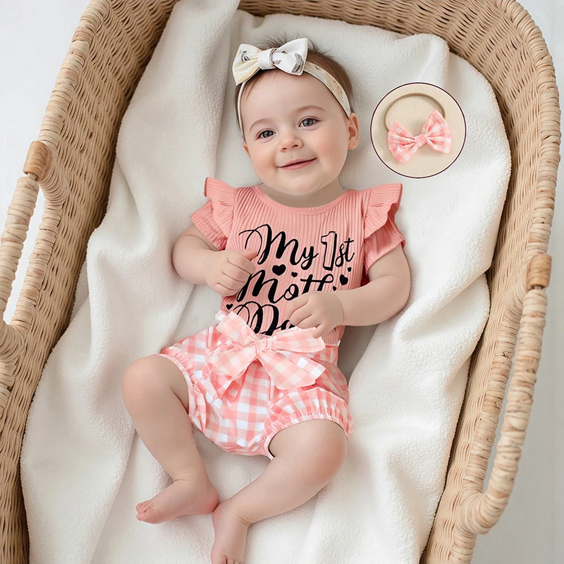 Conjuntos de pantalones cortos de verano para niñas con estampado de letras, mameluco a cuadros/pantalones cortos con estampado de lazo, conjuntos de diadema