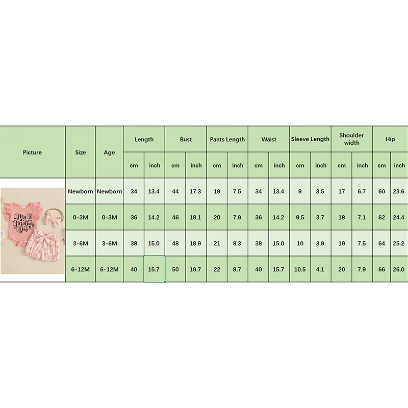 Tamaño (pulgadas) NB Longitud de la camiseta: 13,39 Busto: 17.32 Manga: 3,54 Hombro: 6,69 Longitud de los pantalones: 7,48 Cintura: 13,39 Cadera: 23,62 Edad recomendada: Recién nacido 0-3M Longitud de la camiseta: 14,17 Busto: 18,11 Manga: 3,74 Hombro: 7,09 Longitud de los pantalones: 7,87 Cintura: 14,17 Cadera: 24,41 Edad recomendada: 0-3 meses 3-6M Longitud de la camiseta: 14,96 Busto: 18,9 Manga: 3,94 Hombro: 7,48 Longitud de los pantalones: 8,27 Cintura: 14,96 Cadera: 25,2 Edad recomendada: 3-6 meses 6-12M Longitud de la camiseta: 15,75 Busto: 19,68 Manga: 4.13 Hombro: 7,87 Longitud de los pantalones: 8,66 Cintura: 15,75 Cadera: 25,98 Edad recomendada: 6-12 meses
