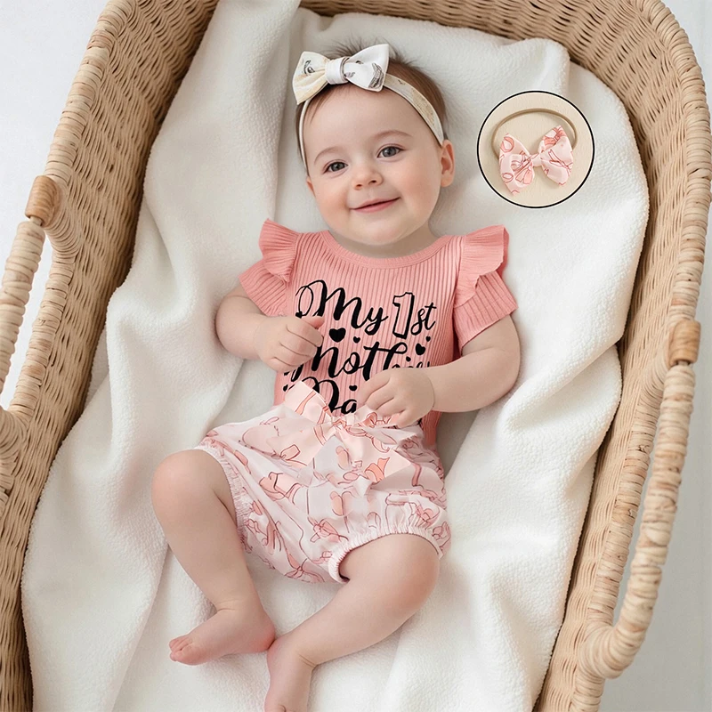 Conjuntos de pantalones cortos de verano para niñas recién nacidas, mameluco con estampado de letras, pantalones cortos con estampado de lazo y diadema