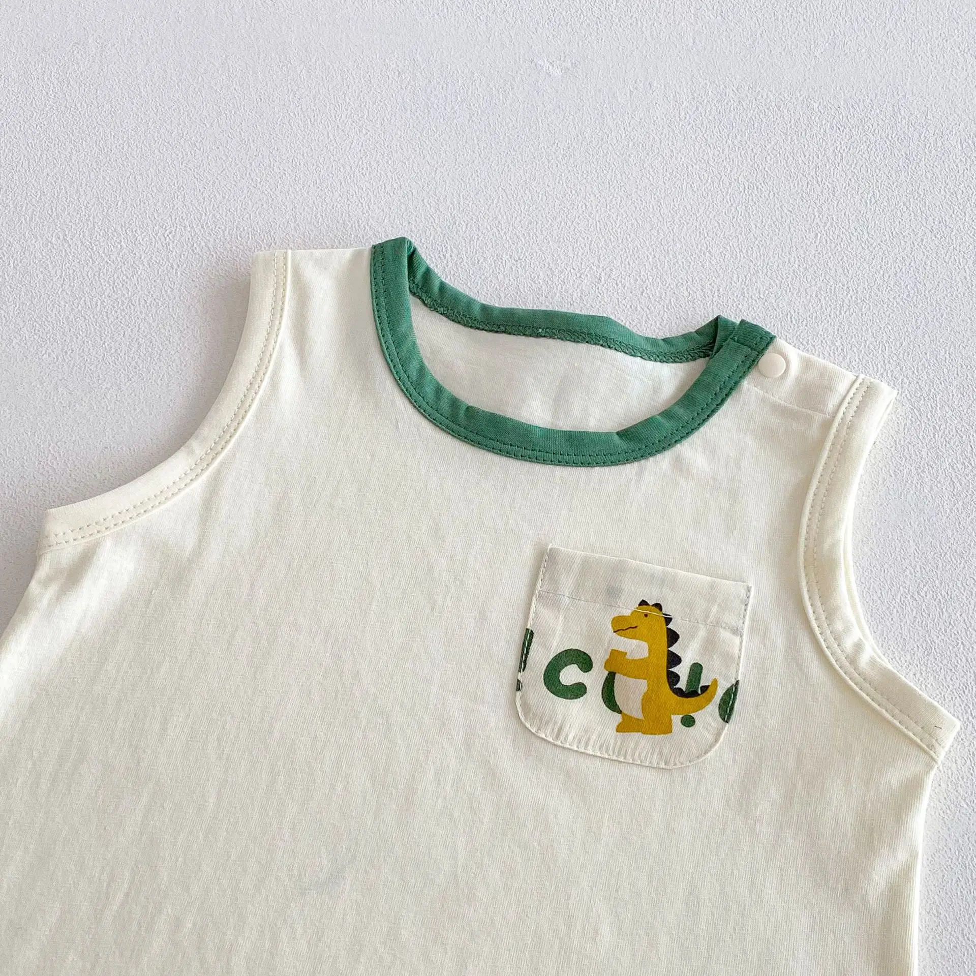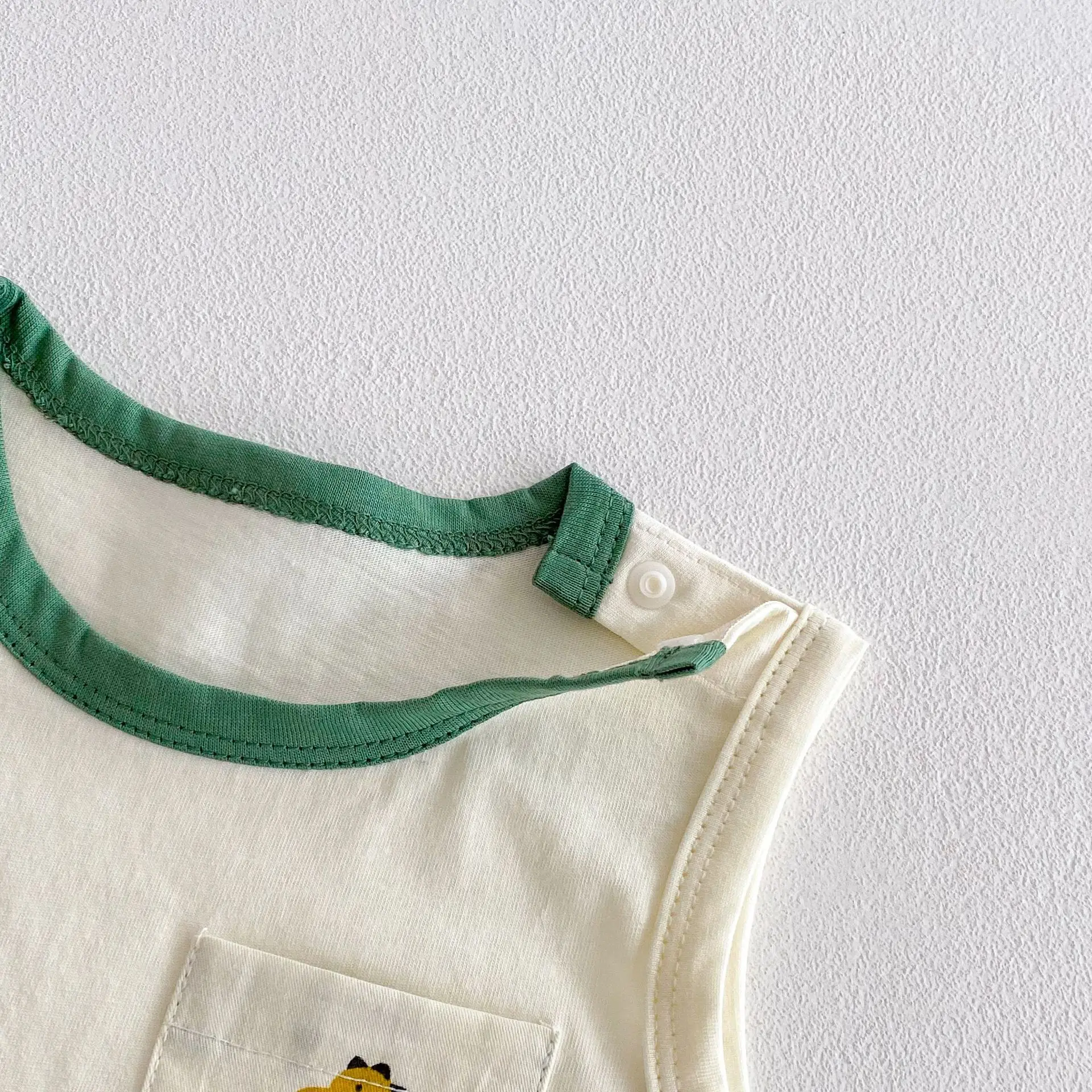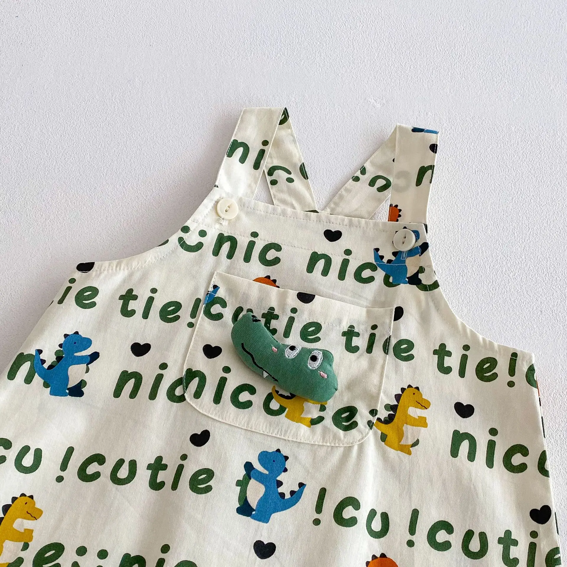 1.**Elegante estampado de dinosaurios**:El mono presenta un estampado completo de dinosaurios coloridos como los amarillos, azules y naranjas, junto con texto verde y corazones negros, lo que lo hace muy atractivo para los niños.2.**Linda decoración 3D**: Un cocodrilo verde tridimensional, como decoración en el bolsillo del mono, agrega un toque divertido y único.3.**Tela suave y cómoda**: Tanto la camisa sin mangas como el mono parecen estar hechos de tela suave, adecuada para mantener a los niños cómodos en verano.4.**Práctico diseño de botones**: Botones en las correas del mono y en la parte inferior para facilitar su uso y cambio de pañales (si es necesario para niños más pequeños).5. **Conjunto a juego**: La camiseta sin mangas con cuello verde recortado y un bolsillo estampado de dinosaurio combina perfectamente con el mono, creando un look coordinado y moderno.