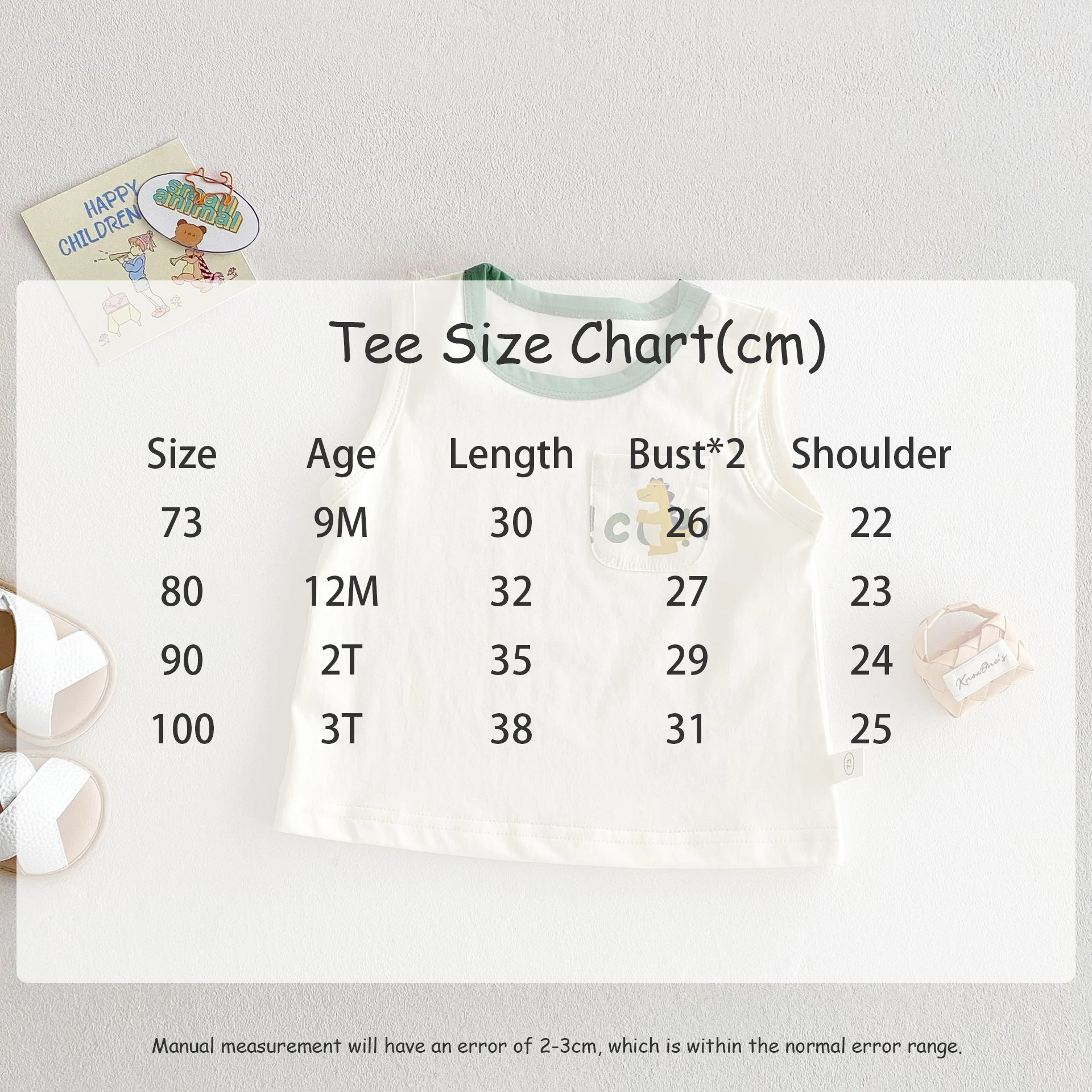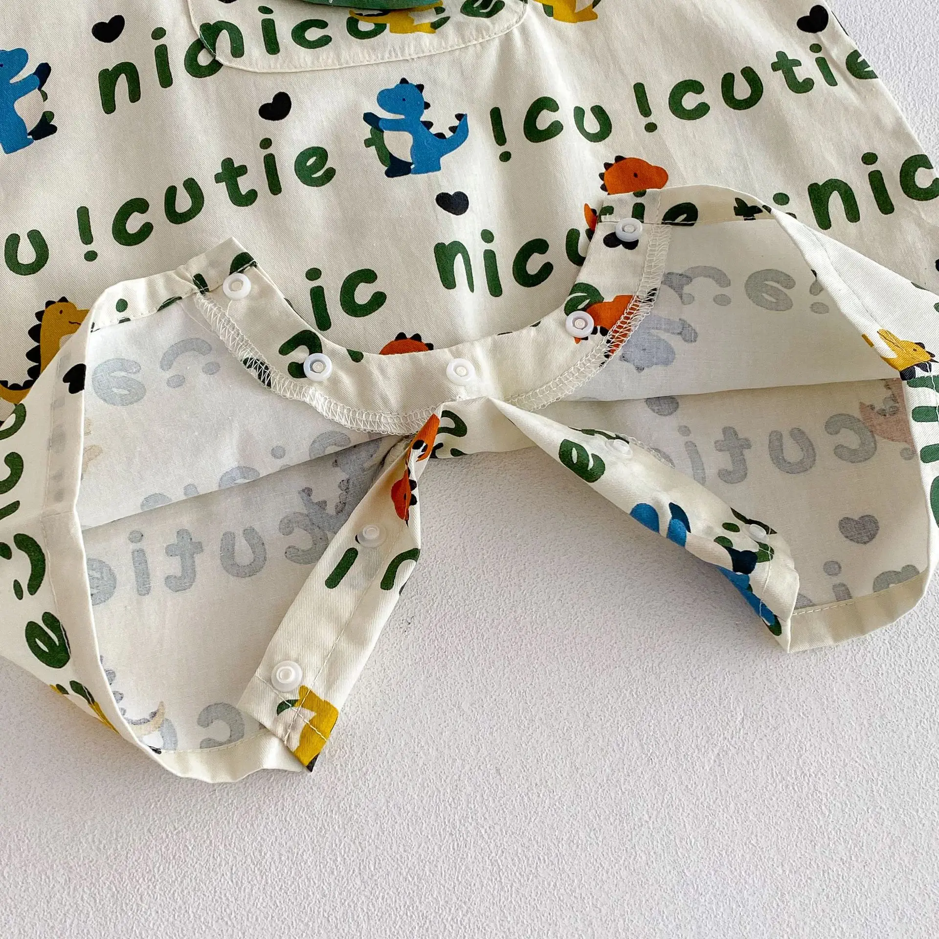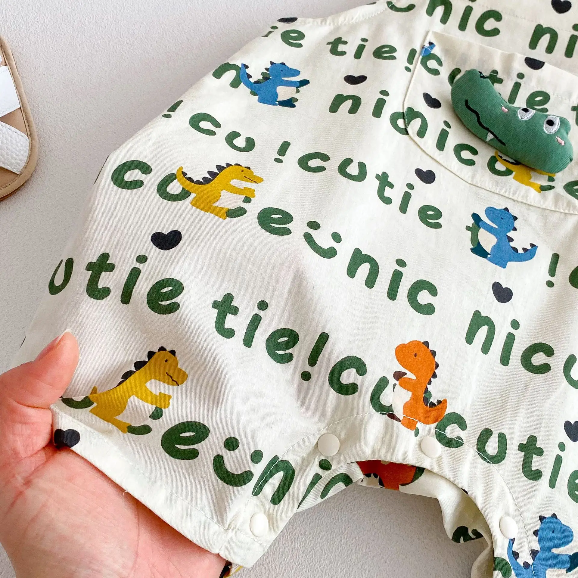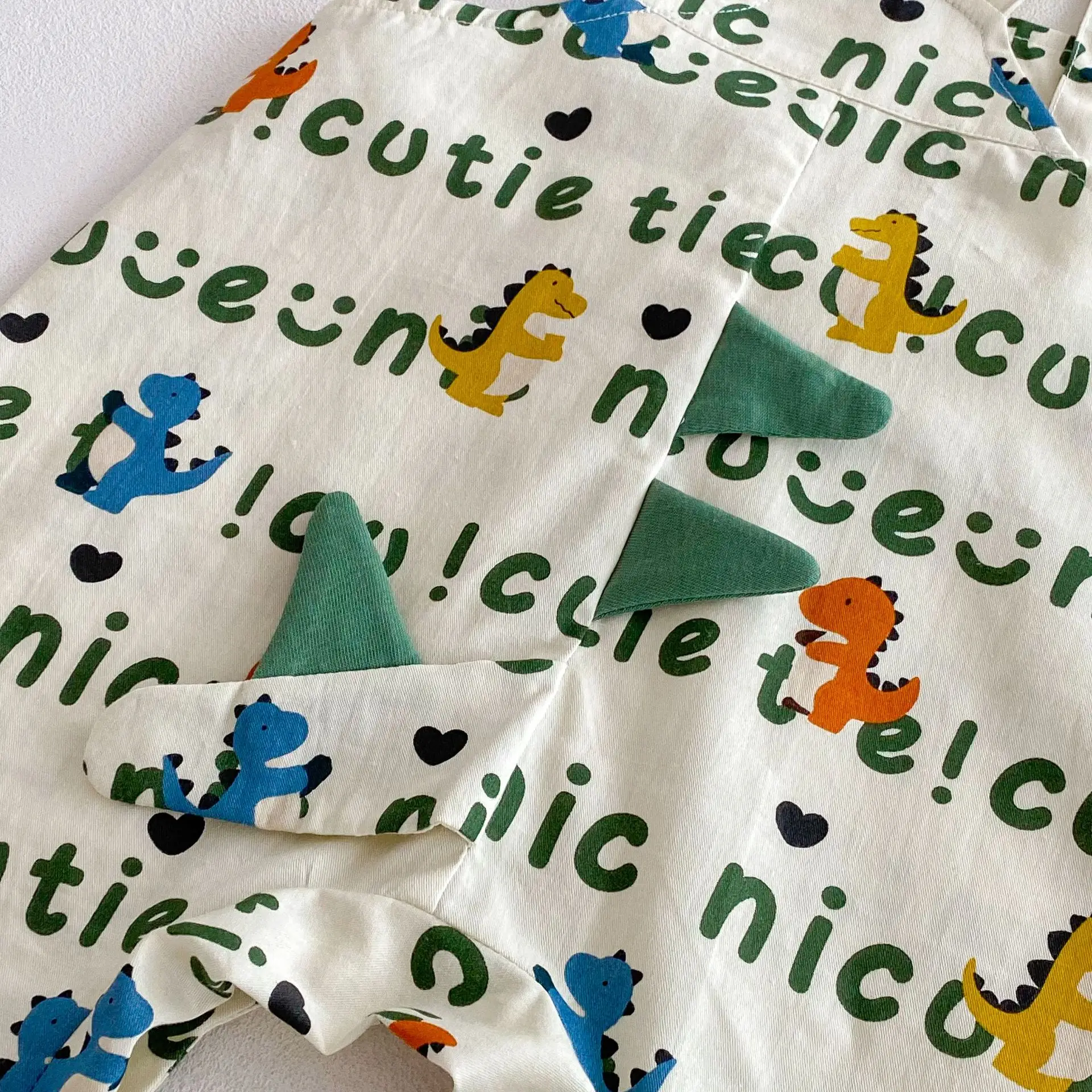 1.**Elegante estampado de dinosaurios**:El mono presenta un estampado completo de dinosaurios coloridos como los amarillos, azules y naranjas, junto con texto verde y corazones negros, lo que lo hace muy atractivo para los niños.2.**Linda decoración 3D**: Un cocodrilo verde tridimensional, como decoración en el bolsillo del mono, agrega un toque divertido y único.3.**Tela suave y cómoda**: Tanto la camisa sin mangas como el mono parecen estar hechos de tela suave, adecuada para mantener a los niños cómodos en verano.4.**Práctico diseño de botones**: Botones en las correas del mono y en la parte inferior para facilitar su uso y cambio de pañales (si es necesario para niños más pequeños).5. **Conjunto a juego**: La camiseta sin mangas con cuello verde recortado y un bolsillo estampado de dinosaurio combina perfectamente con el mono, creando un look coordinado y moderno.