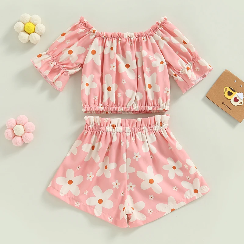 Conjunto de verano para niñas y bebés, Tops de manga corta con hombros descubiertos, pantalones cortos con cinturón, conjunto de ropa para niños