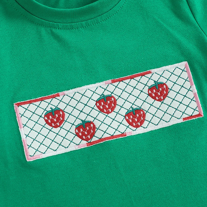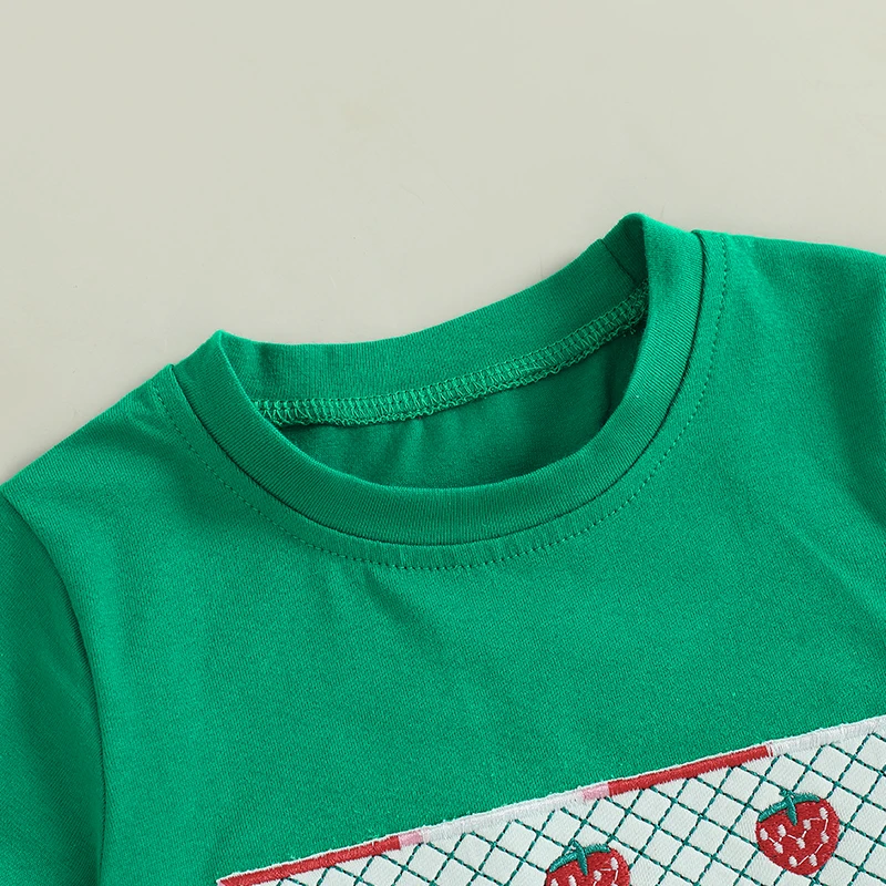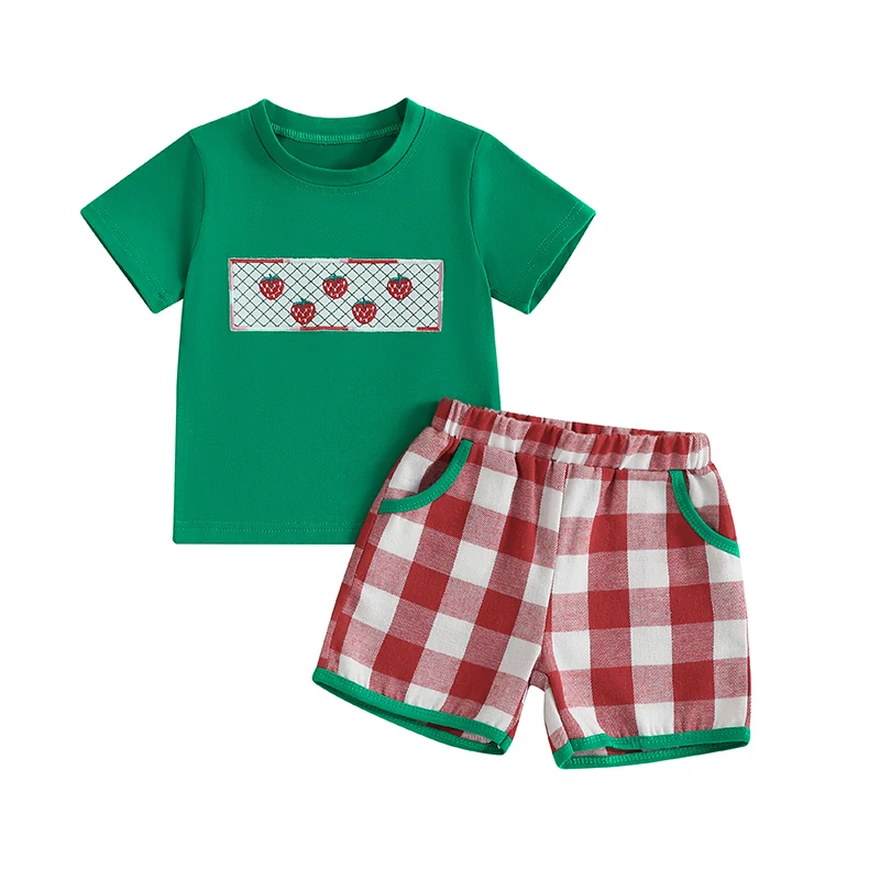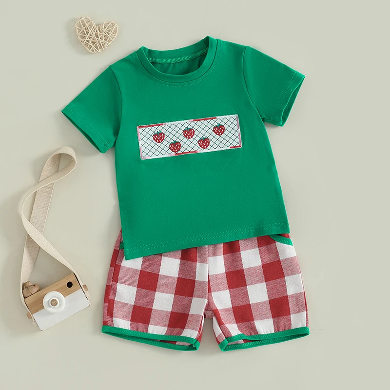 Especificación Nombre del artículo: Traje para niños Color verde Material: Tops: 95% Algodón y 5% Elastano; Pantalón corto: 67%Poliéster y 33%Algodón Patrón: bordado de fresa y estampado a cuadros.