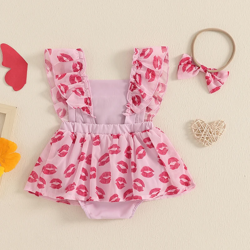 Conjunto de verano para niña con volantes, sin mangas, cuello cuadrado, estampado de labios, mameluco con diadema, ropa para recién nacido