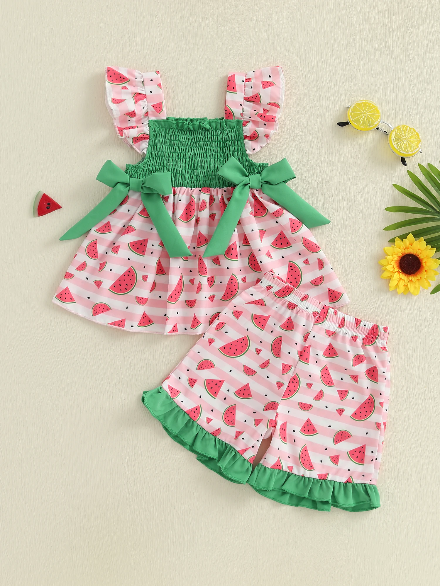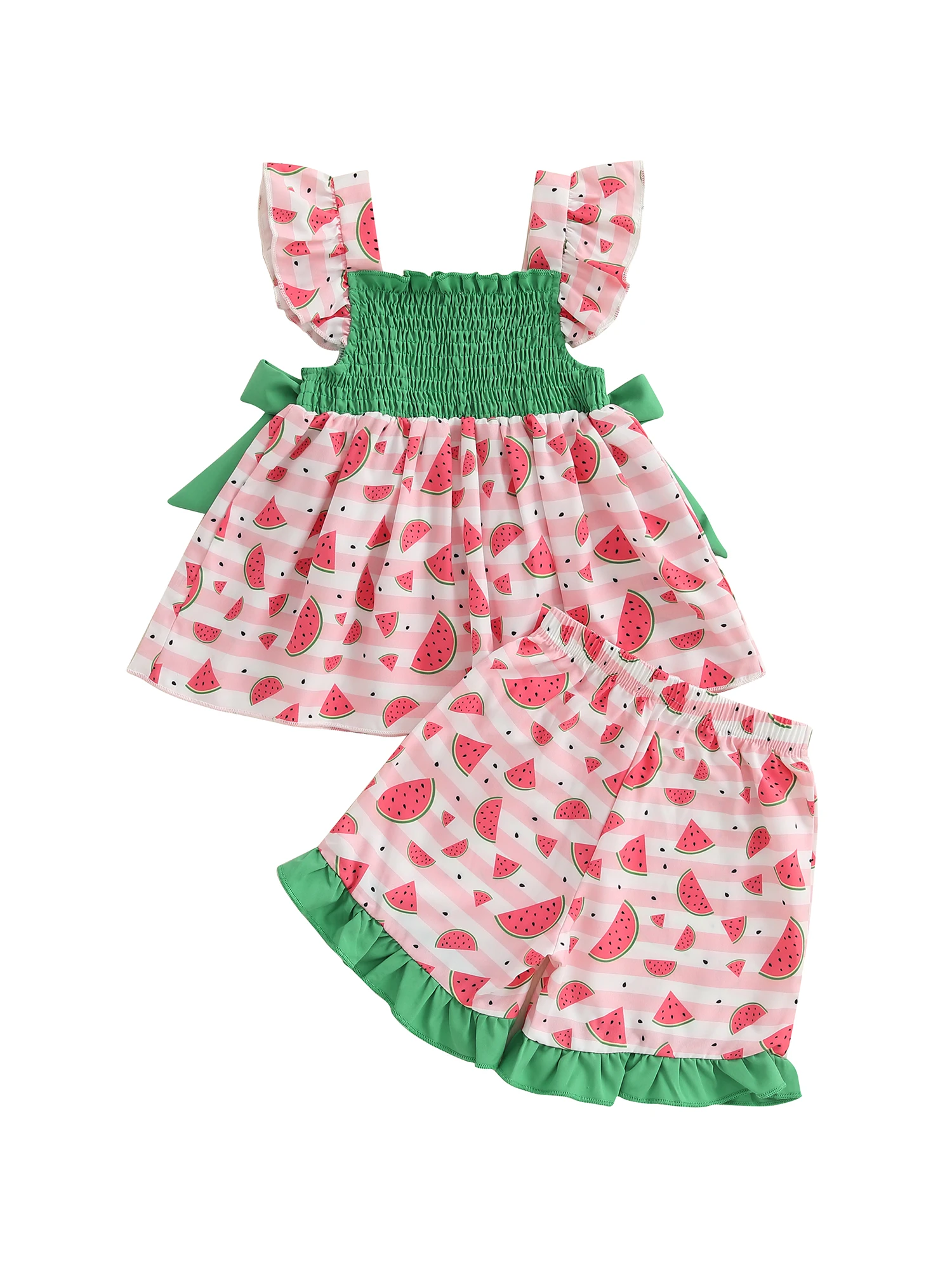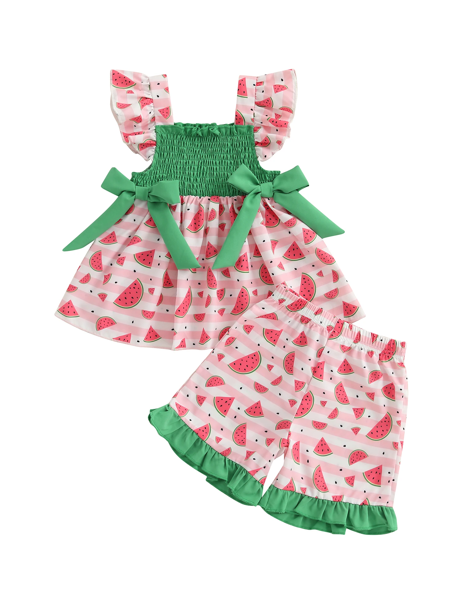 Trajes de verano para niñas con estampado de sandía/cereza, camisetas con mangas volantes y pantalones cortos elásticos, conjunto de ropa linda de moda