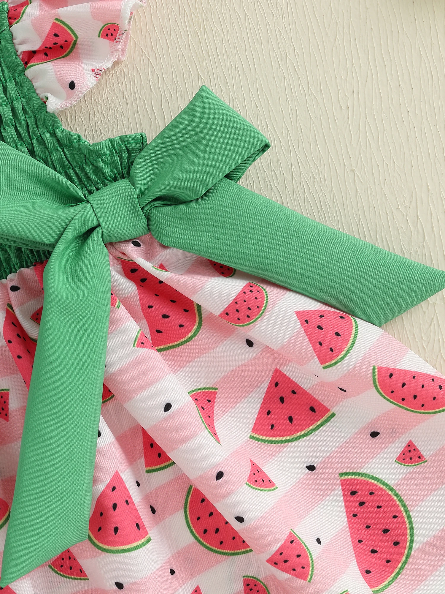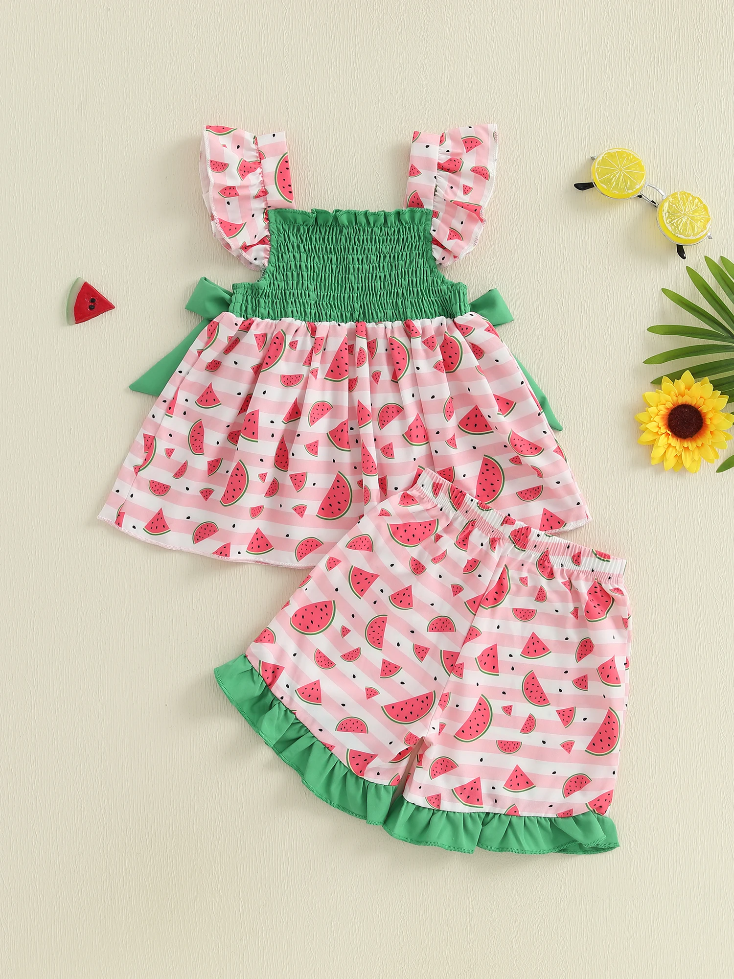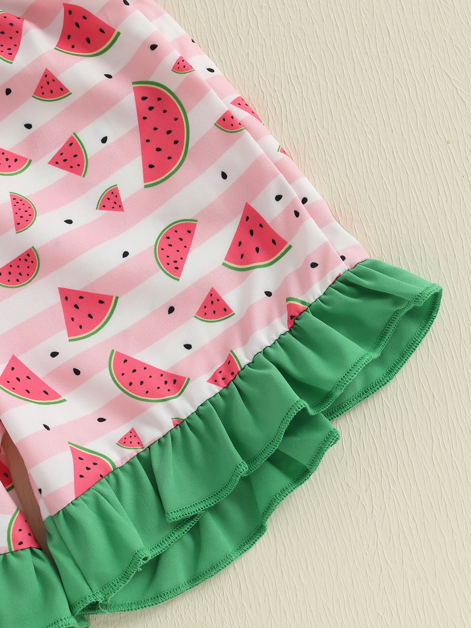 Trajes de verano para niñas con estampado de sandía/cereza, camisetas con mangas volantes y pantalones cortos elásticos, conjunto de ropa linda de moda