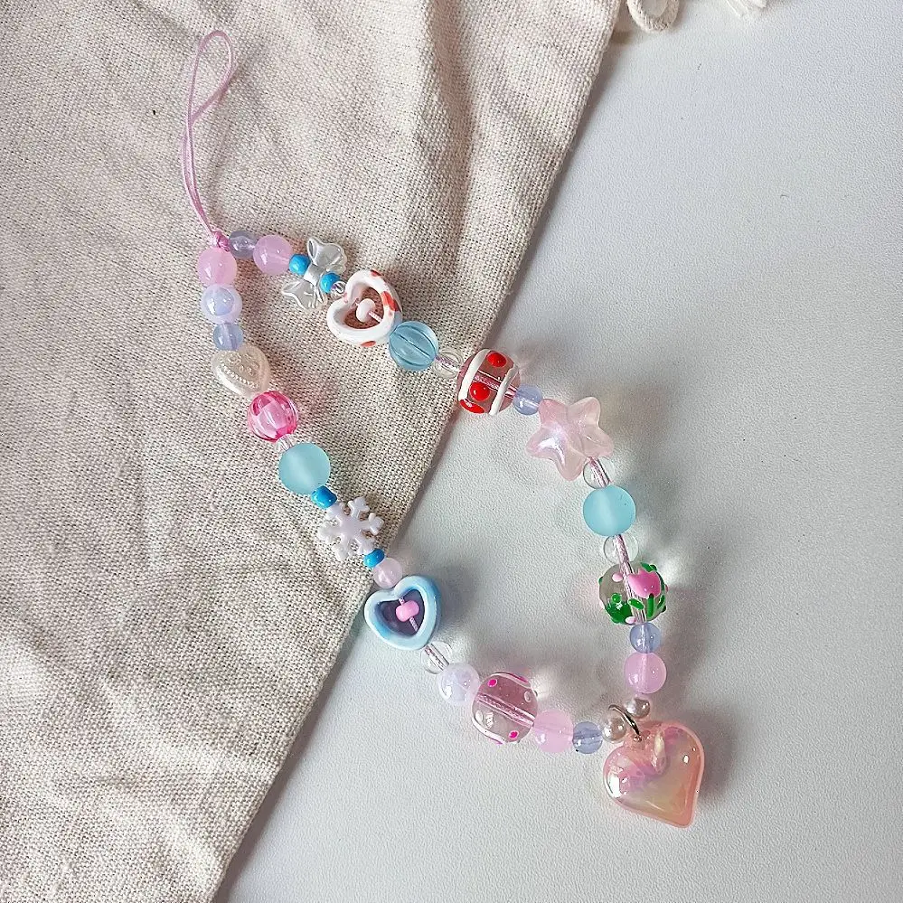 Cordón coreano bonito con cuentas de corazón de amor rosa y azul para teléfono, cordón con abalorio para cámara CCD de iPhone decorado con cordón antipérdida