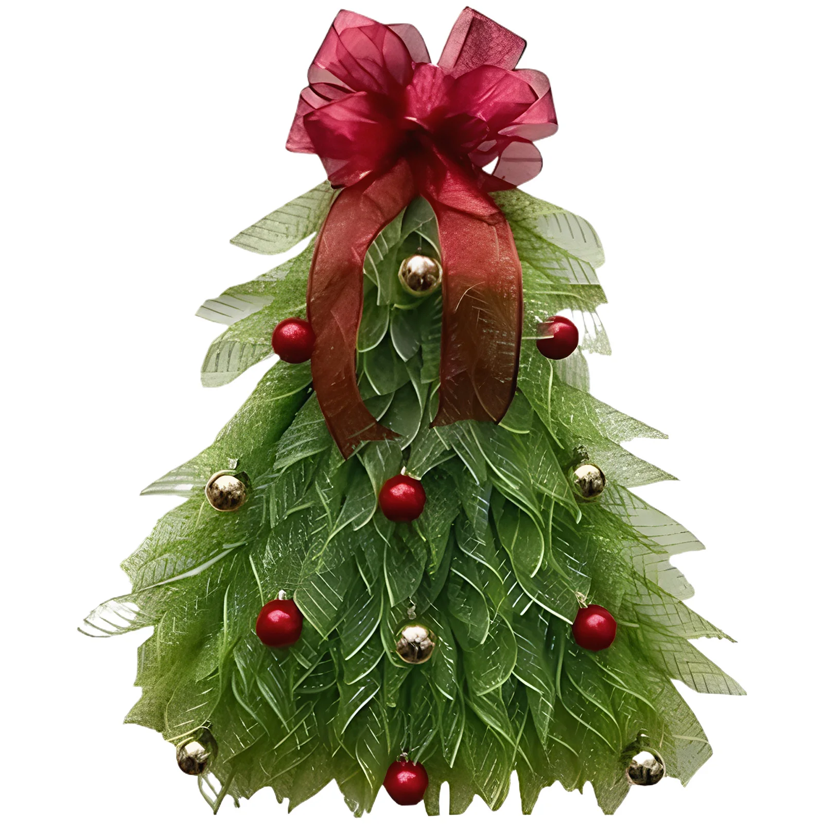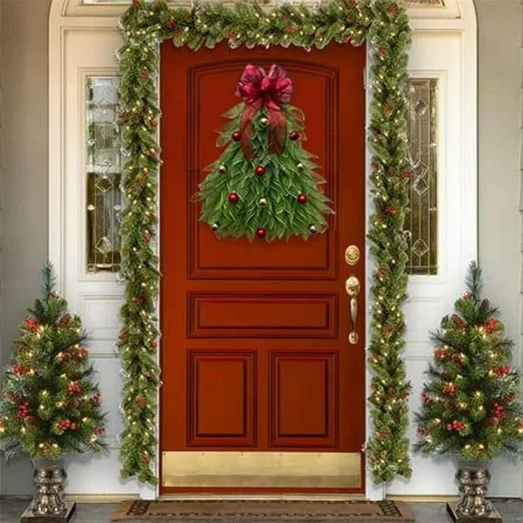 Corona de árbol de Navidad para puerta delantera, adorno colgante para jardín, habitación, corona de árbol de Navidad con lazo rojo, decoración navideña