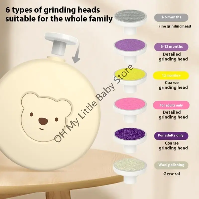 Cuenta con 6 cabezales de amoladora intercambiables para varios grupos de edad y un agarre ergonómico antideslizante para un control preciso durante el cuidado de las uñas del bebé.