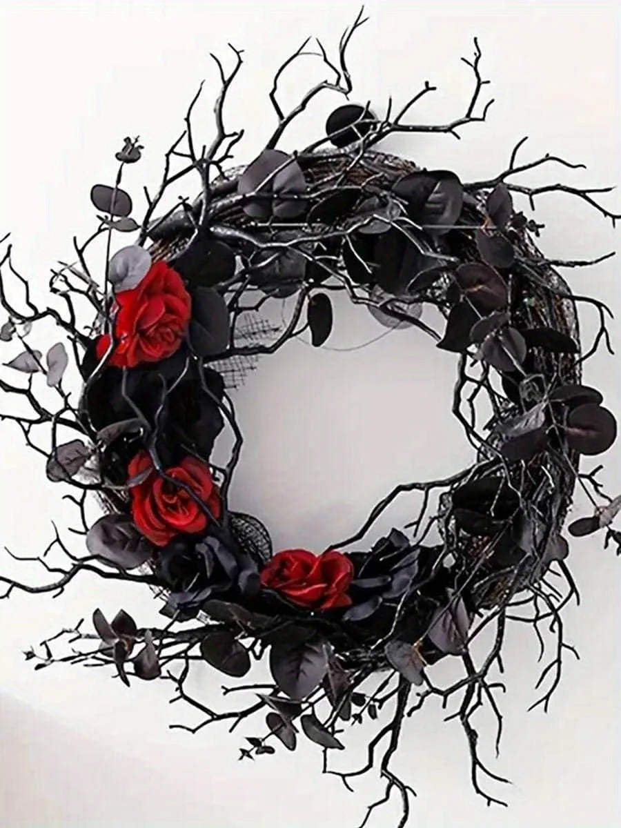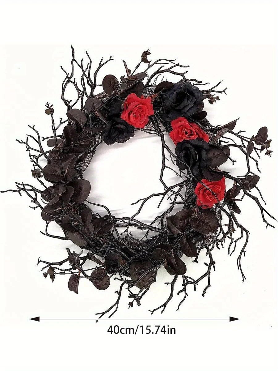 Couronne de porte d'halloween 15.7 pouces, feuilles d'eucalyptus, Rose rouge, noire, joyeux Halloween, couronne artificielle, décoration gothique pour la maison