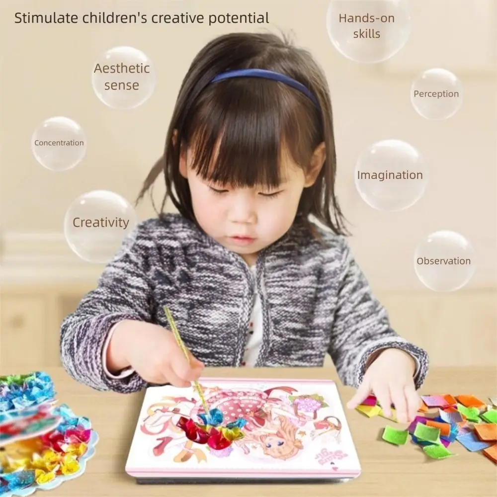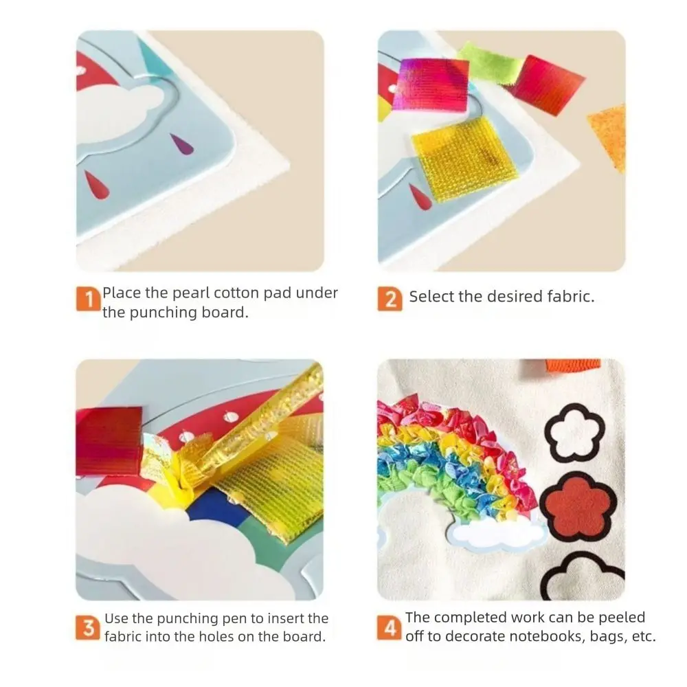 Accessories: Color Card*8, Dress Up Sticker*3, Poking Board*3, Hollow Paper Mold*1, Decorative Board*2, Human Template*4, DIY Board*2, Pearl Cotton*1, Fabric Package*1, Pigment*4, Paintbrush*1, Poking Pen*1, Watercolor Plate*1; 1. Educational Craft Toy: Art DIY toys allows kids to create a magical world through manual poking to form various cartoon designs. This hands-on activity improves hand-eye coordination, creativity, and concentration, making it a beneficial toy for intellectual development.