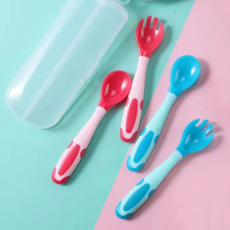 Cuchara para bebé sin BPA, entrenamiento de alimentación de bebé, tenedor giratorio Flexible antideslizante, vajilla para niños con caja de almacenamiento