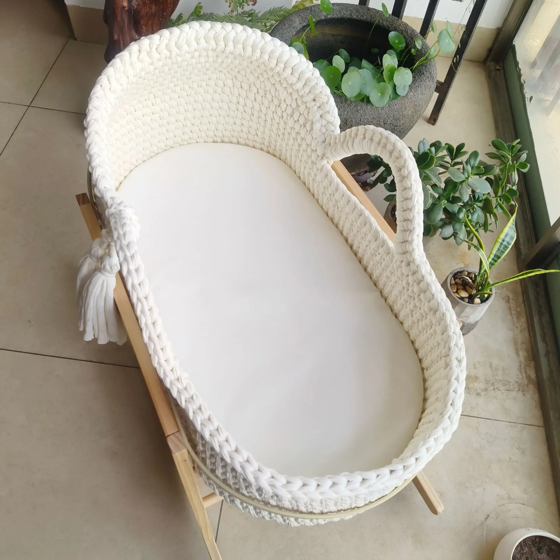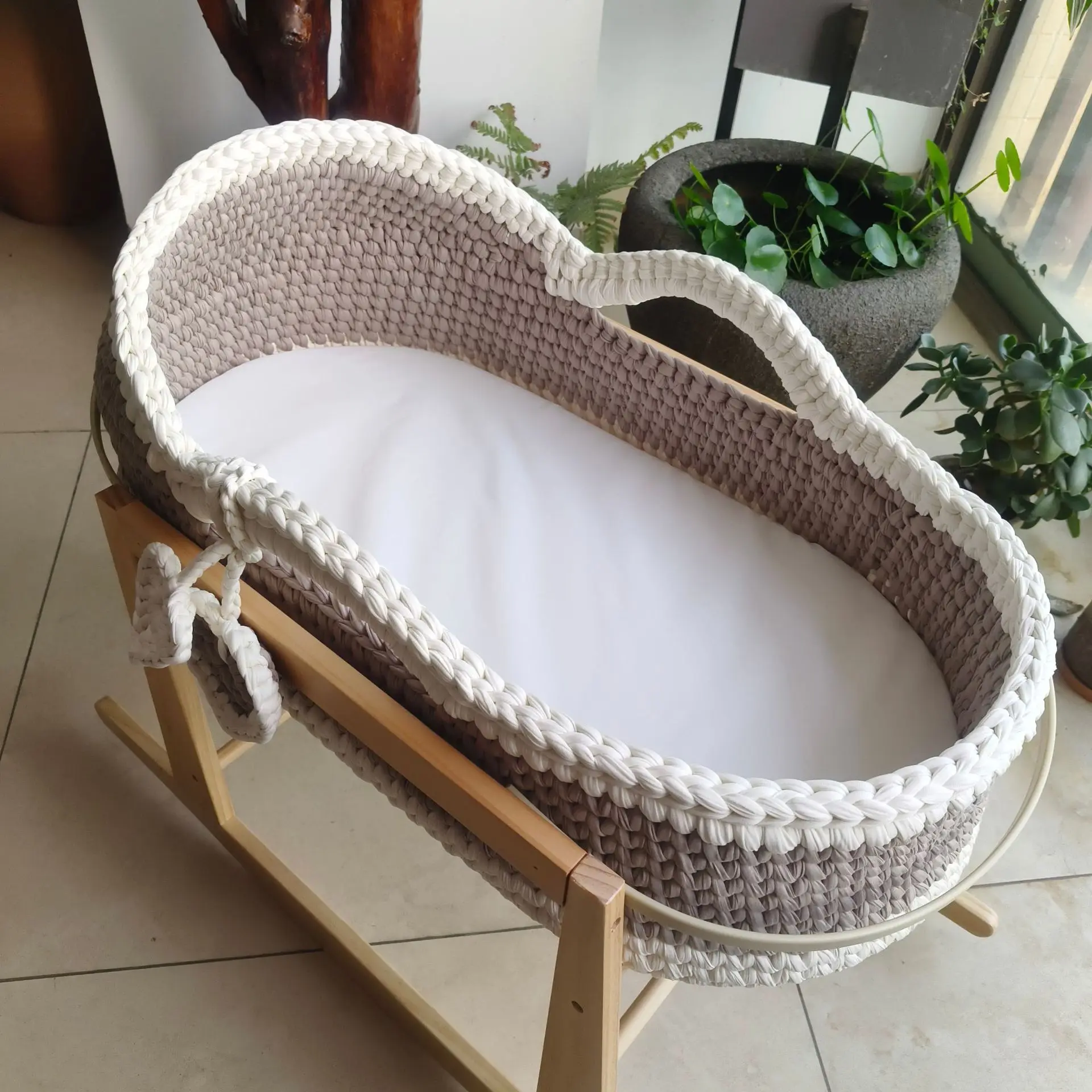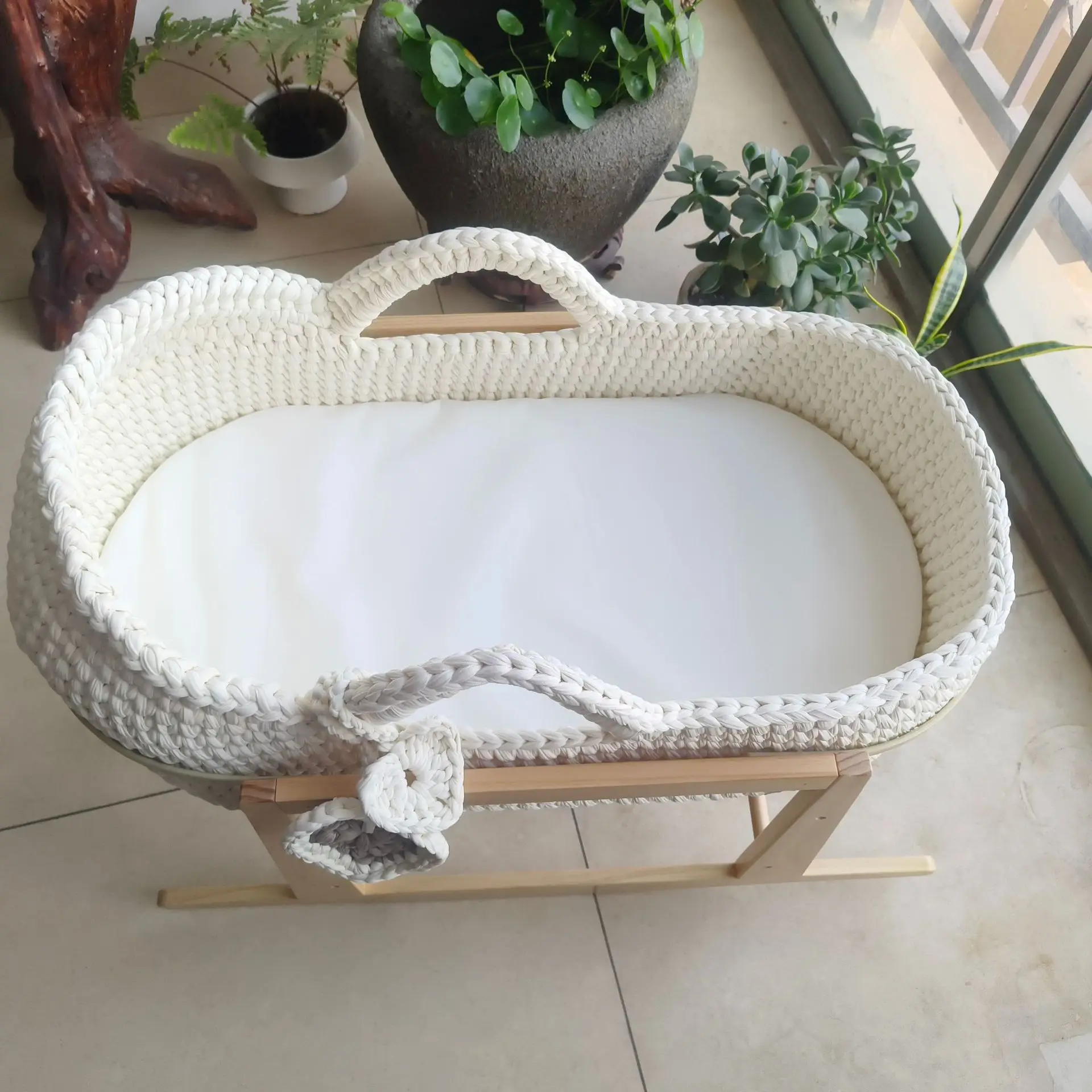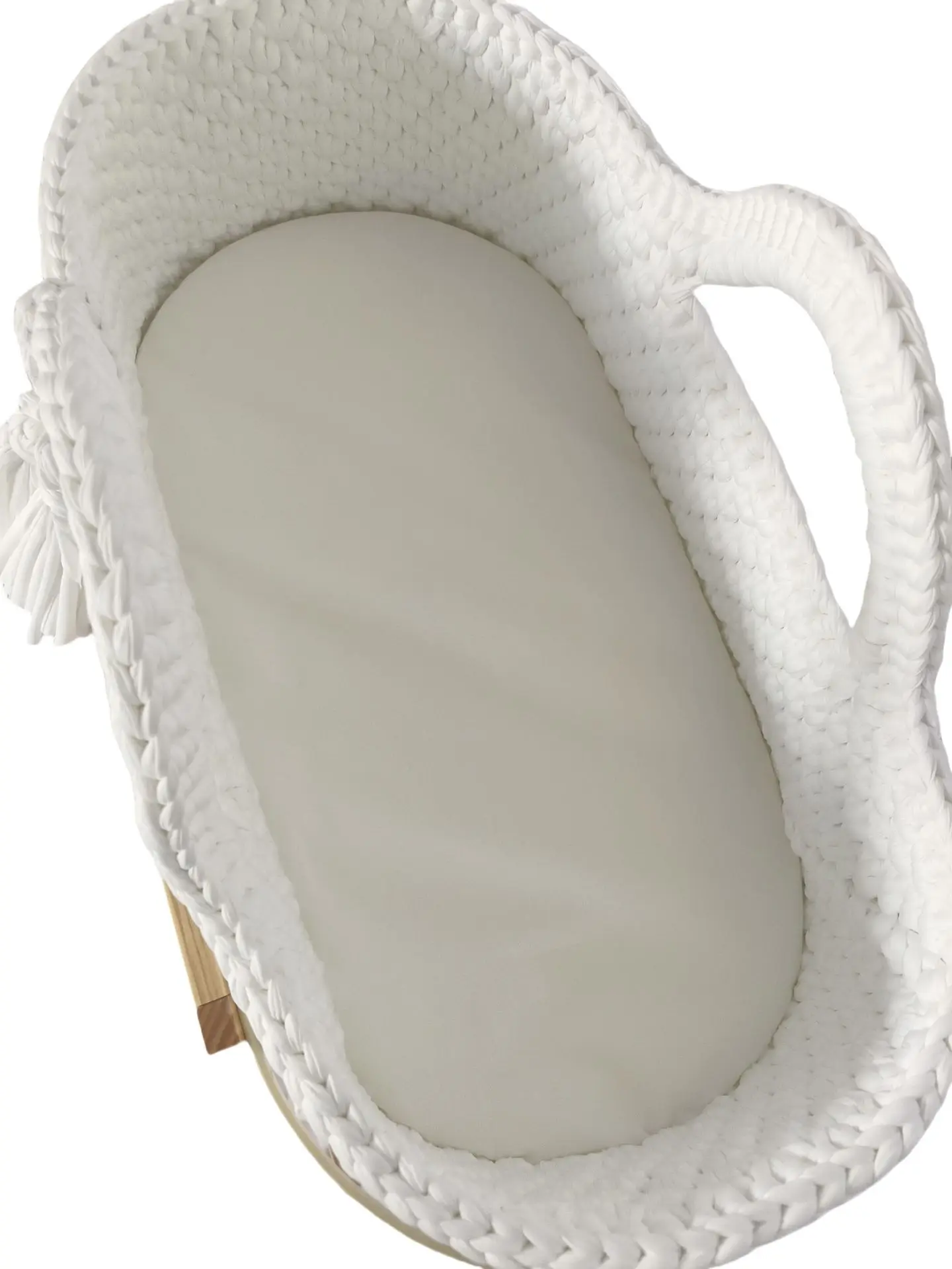 Cuna de una sola capa de ganchillo a mano, marco de mano, cuerda de algodón tejida, tira de tela para cuna, mano tejida para recién nacido