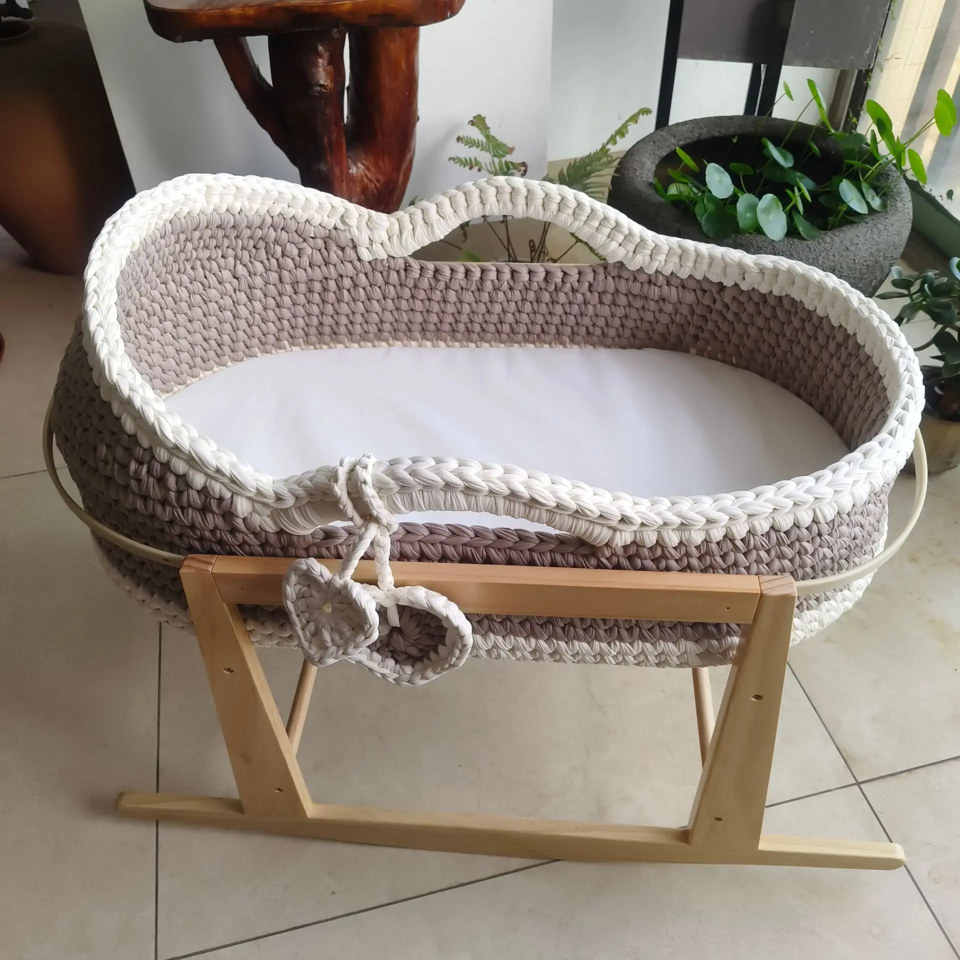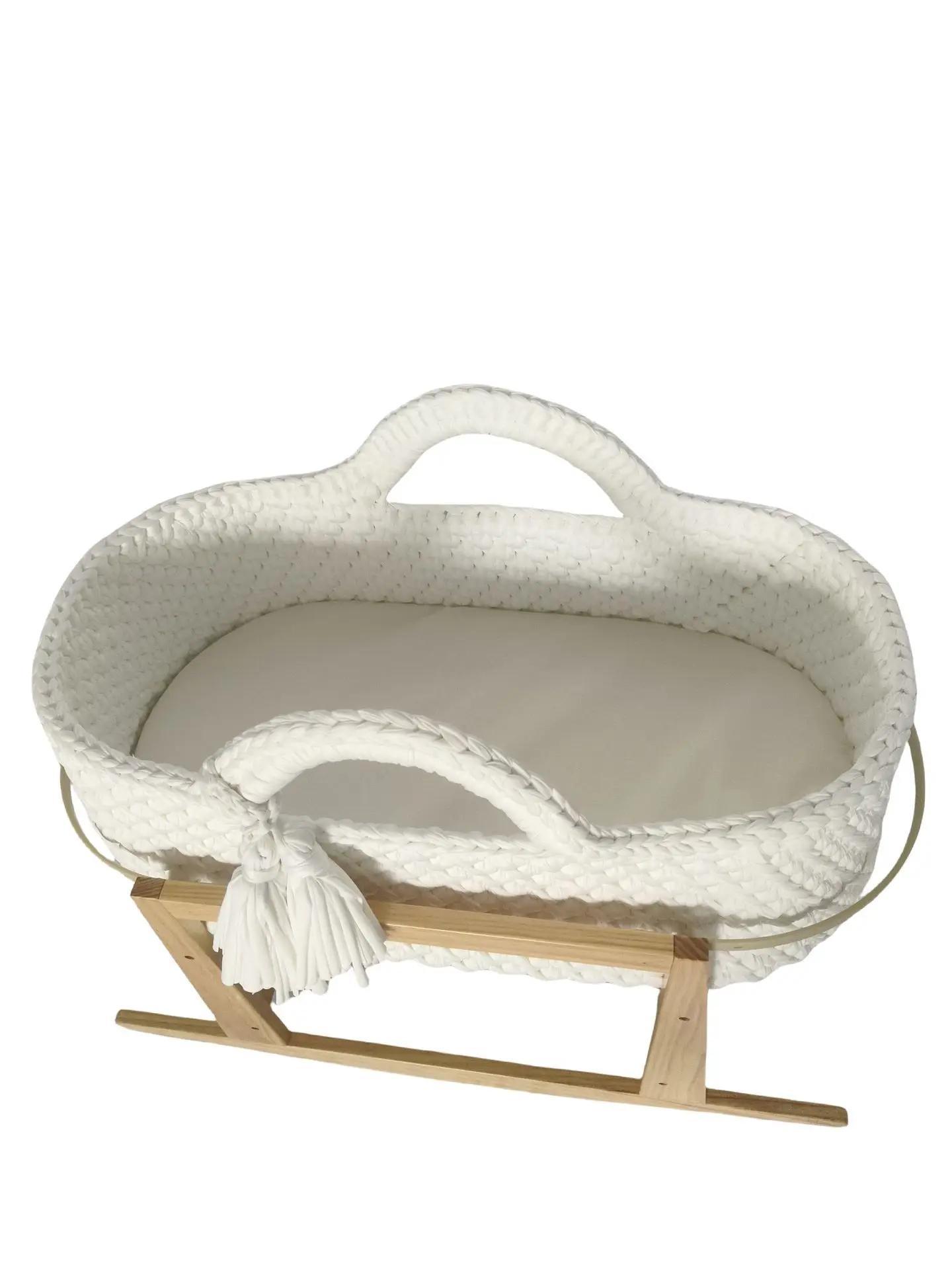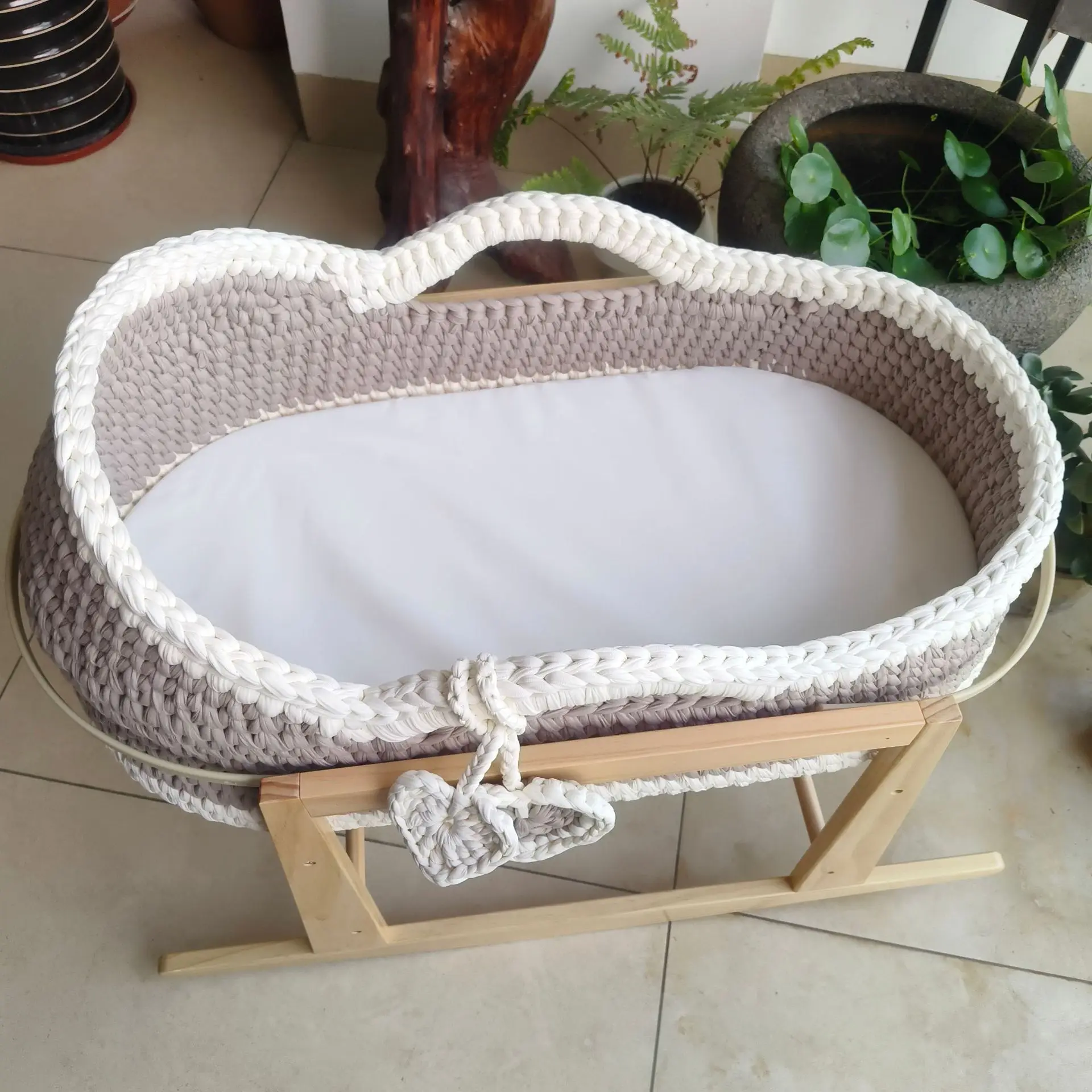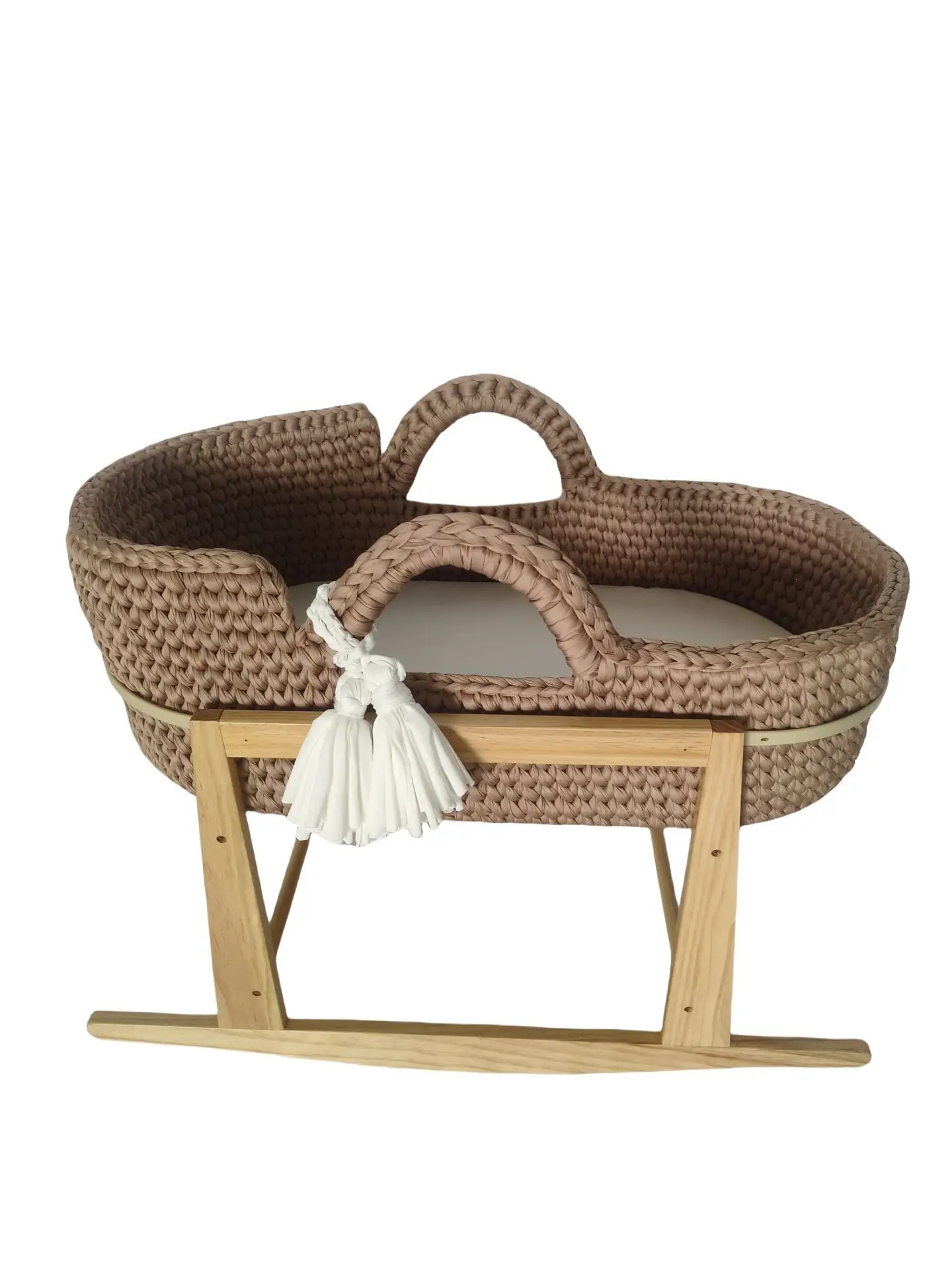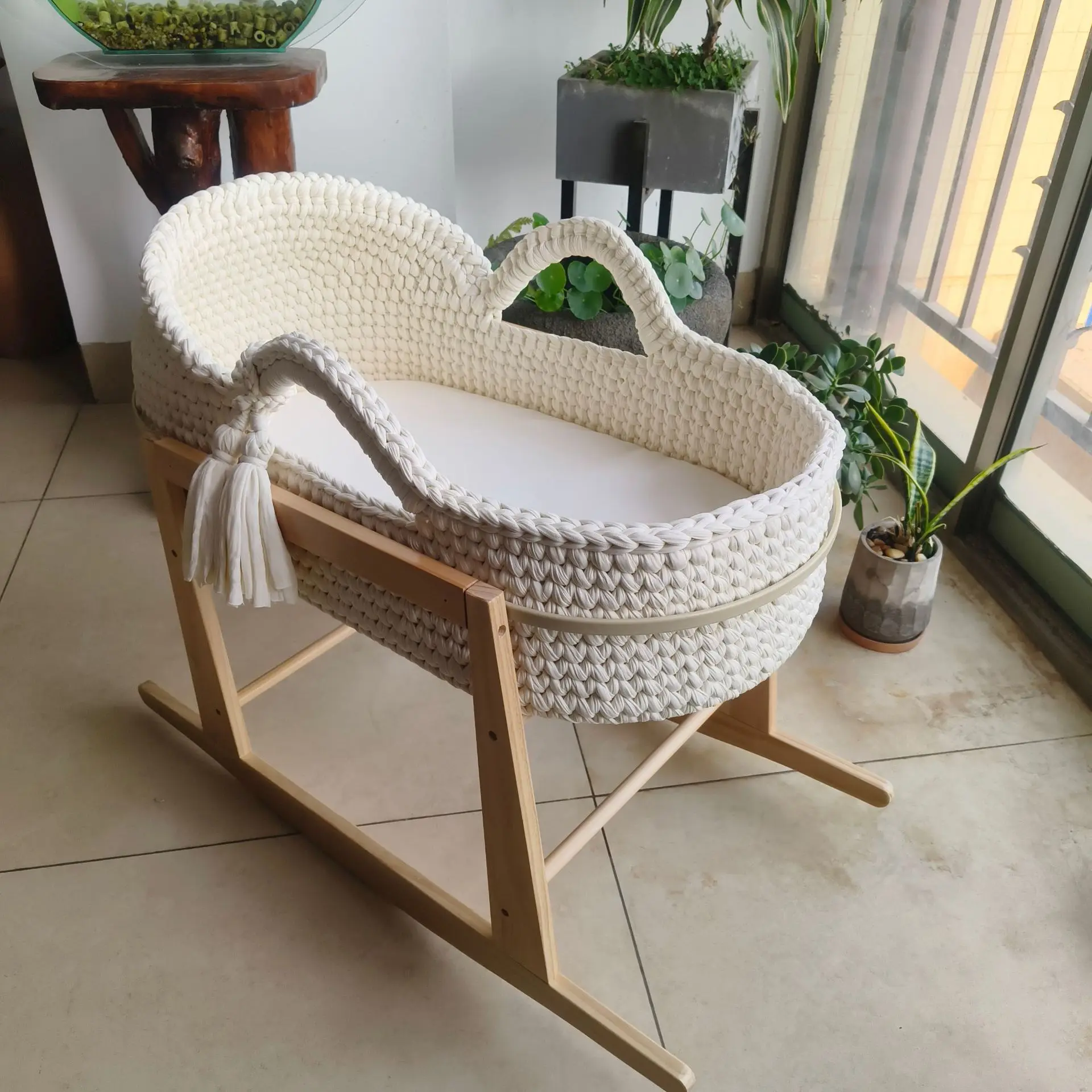 Cuna de una sola capa de ganchillo a mano, marco de mano, cuerda de algodón tejida, tira de tela para cuna, mano tejida para recién nacido