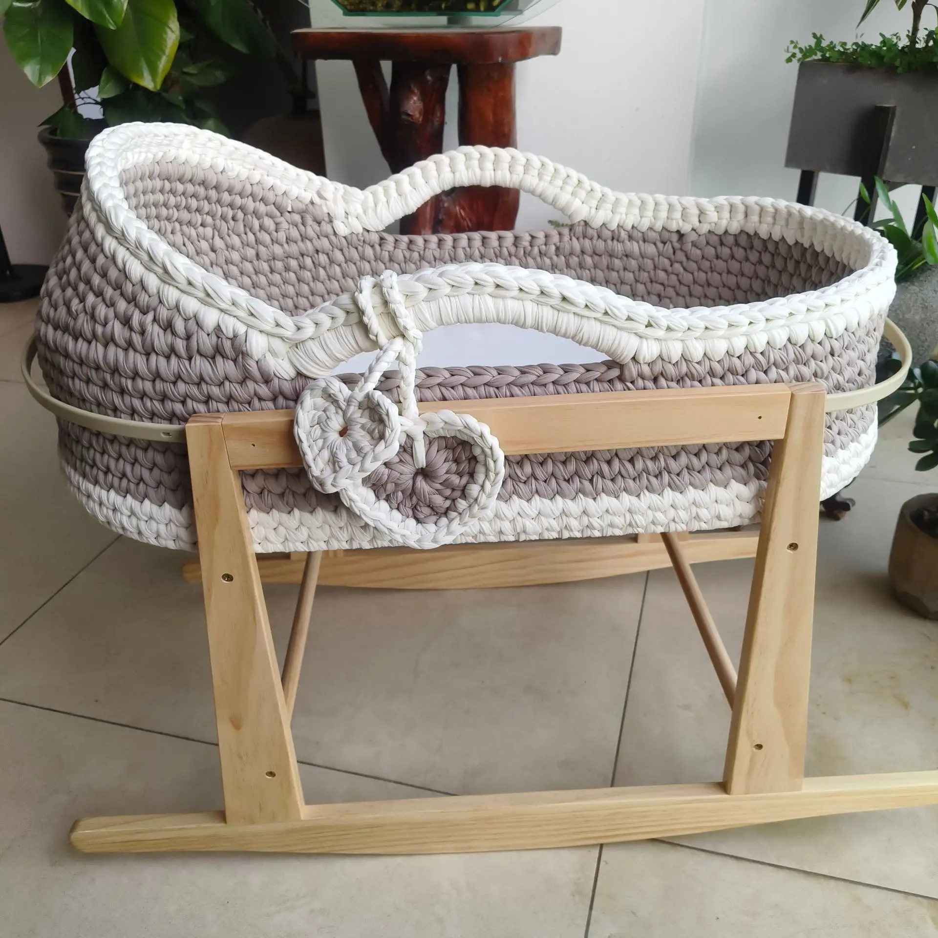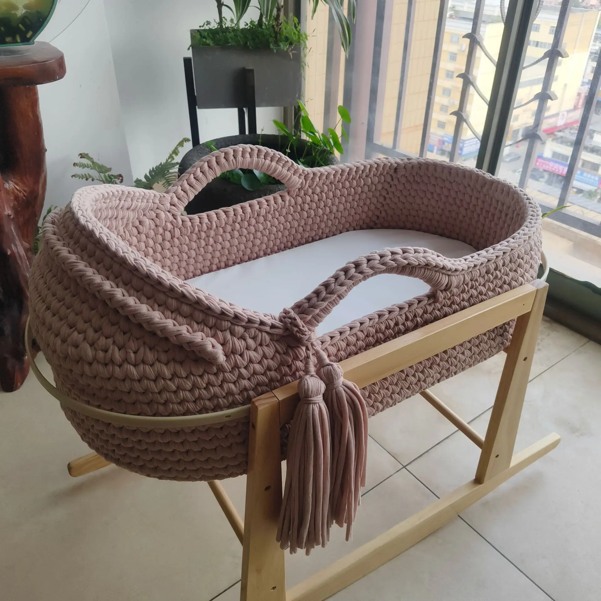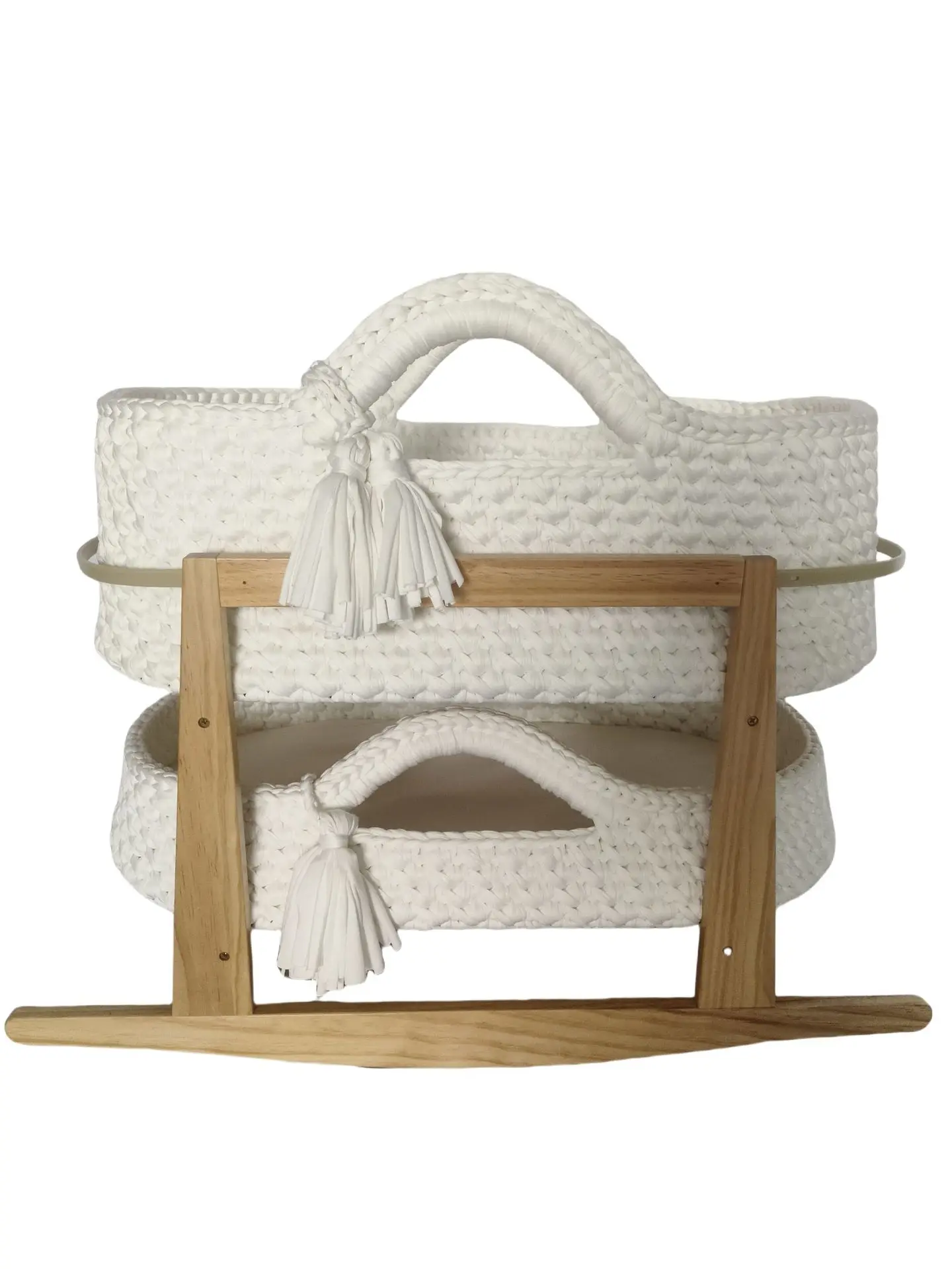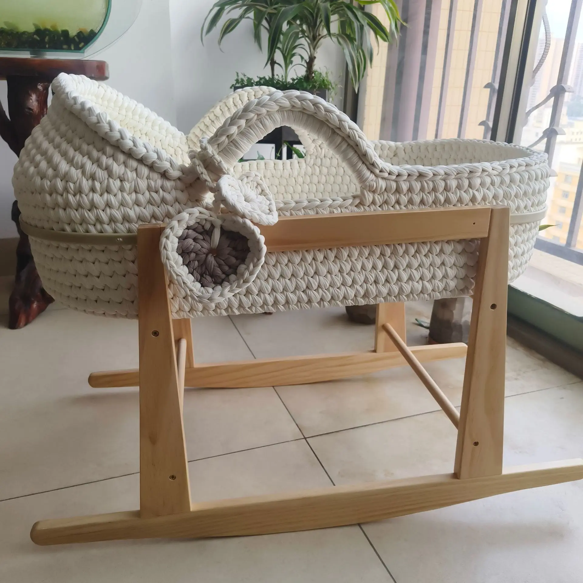 Cuna de una sola capa de ganchillo a mano, marco de mano, cuerda de algodón tejida, tira de tela para cuna, mano tejida para recién nacido