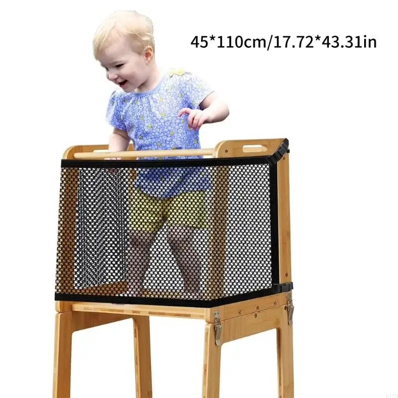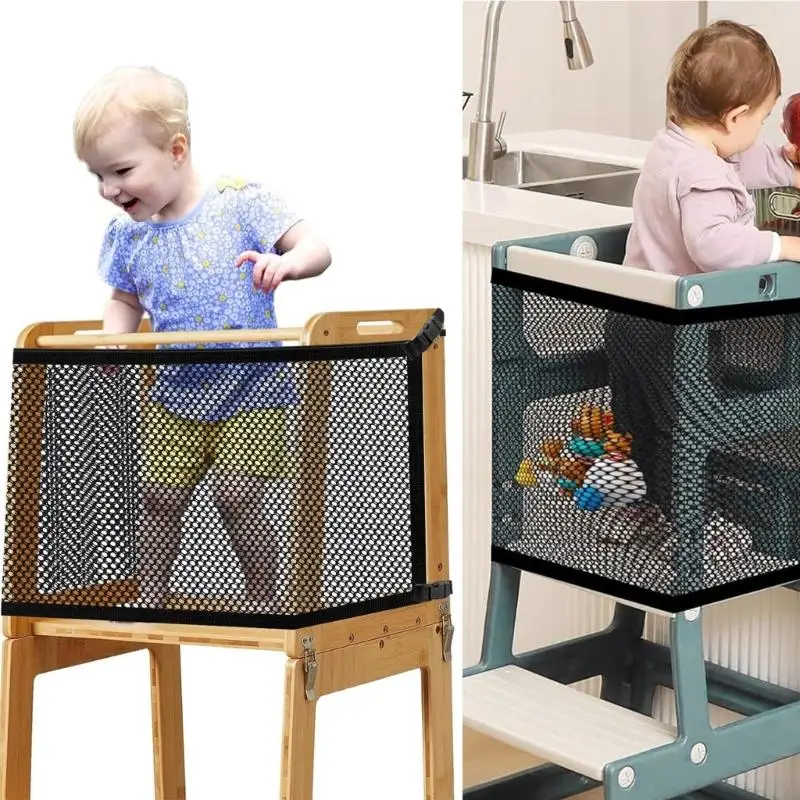 La red de seguridad de doble capa con malla densa brinda protección de 360 grados para los niños pequeños, lo que garantiza visibilidades sin obstáculos y un juego seguro alrededor de torres plegables o taburetes de aprendizaje para ayudantes de cocina.