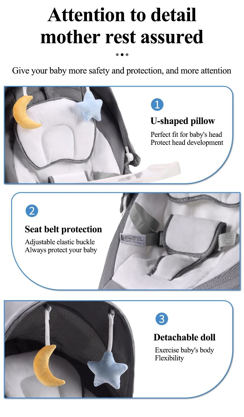 DEAREST tiene muchas características atractivas, incluyendo música incorporada para la cuna, + USB Bluetooth inalámbrico, tela Oxford y terciopelo de cuero melocotón, ajuste de bloqueo de balanceo de un botón, mosquitera extraíble y capacidad de control remoto. Un cinturón de seguridad ajustable y un cojín en forma de U proporcionan protección adicional para los bebés, y una bandeja extraíble hace que sea fácil comer. La capacidad de peso es de 12 kg, y tres modos de ajuste del respaldo le ayudan a ajustar el columpio para obtener la máxima comodidad para su pequeño.