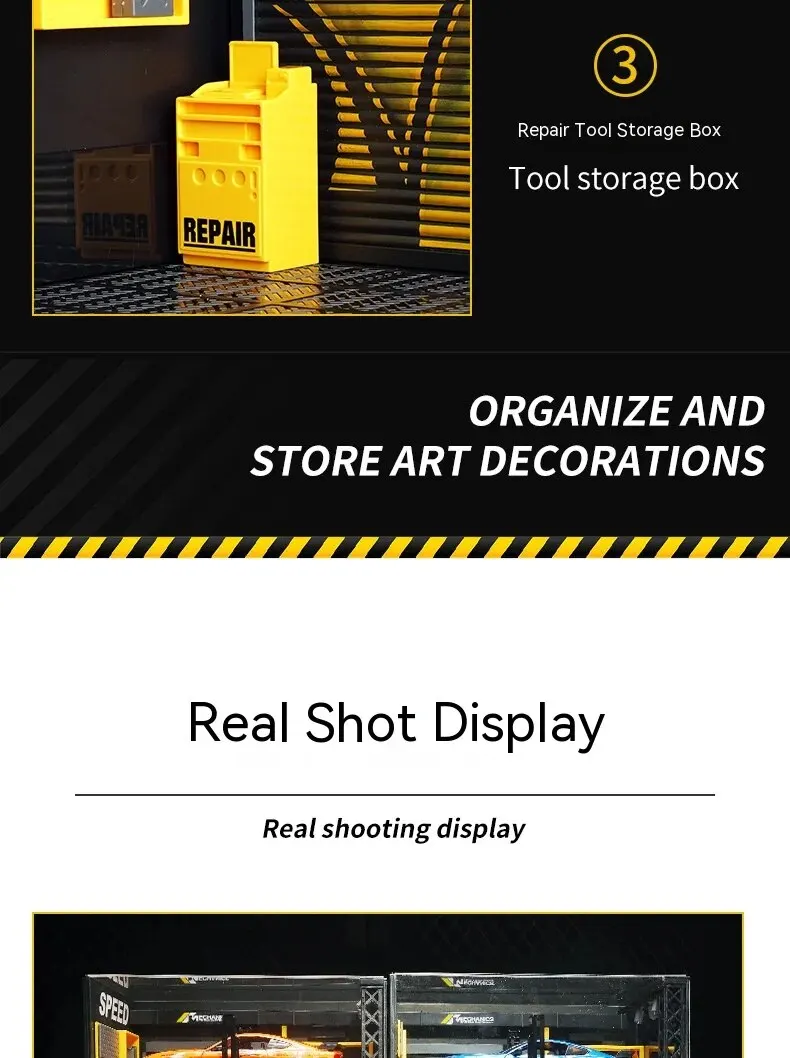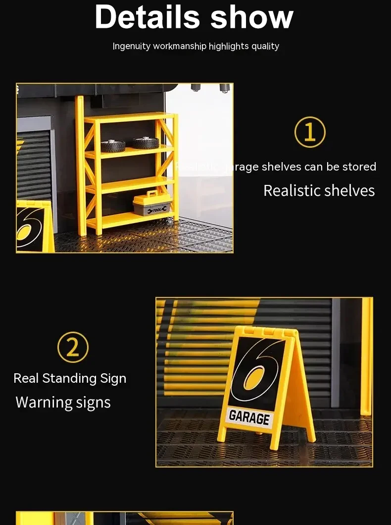 estantes * 1, señales de advertencia * 1, caja de almacenamiento de herramientas * 1, neumático * 2, caja de herramientas * 1, botella de aceite * 1, marco de aleación * 1, cubierta acrílica * 1 (sin modelo de automóvil)