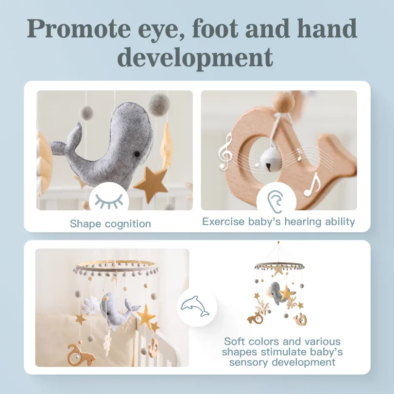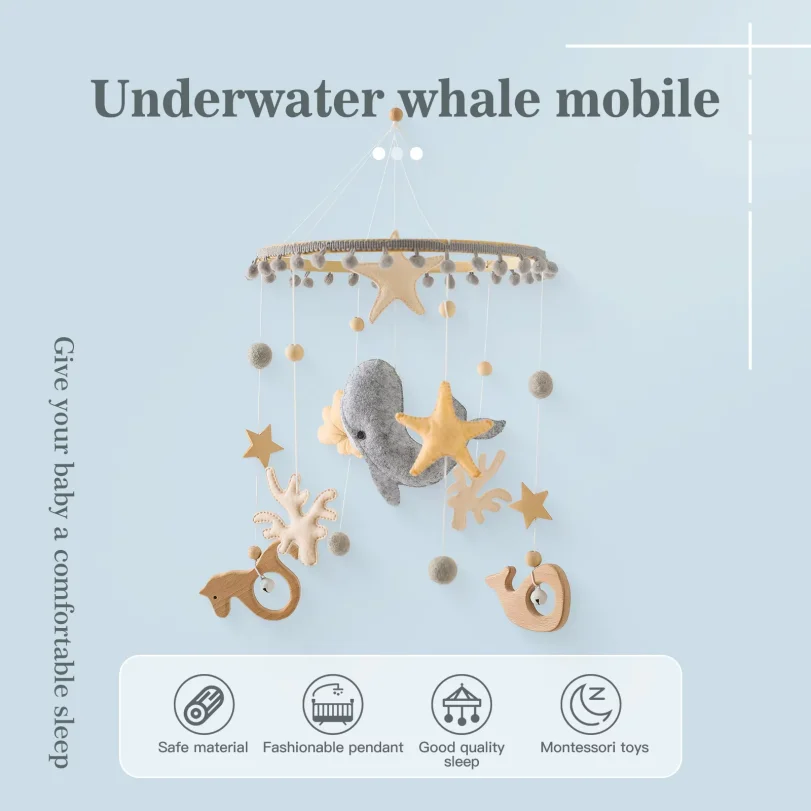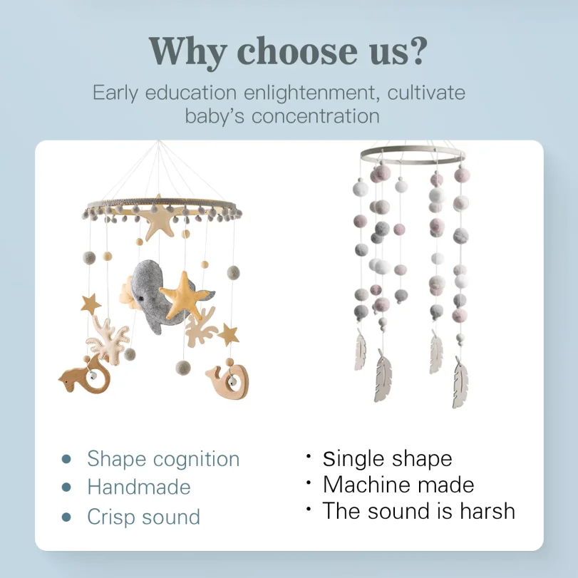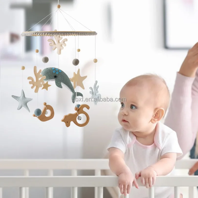 Comprar Decoración de guardería de fieltro hecha a mano, marco de madera, juguete colgante, móvil para bebé con campana de cama Musical, tamaño personalizable
