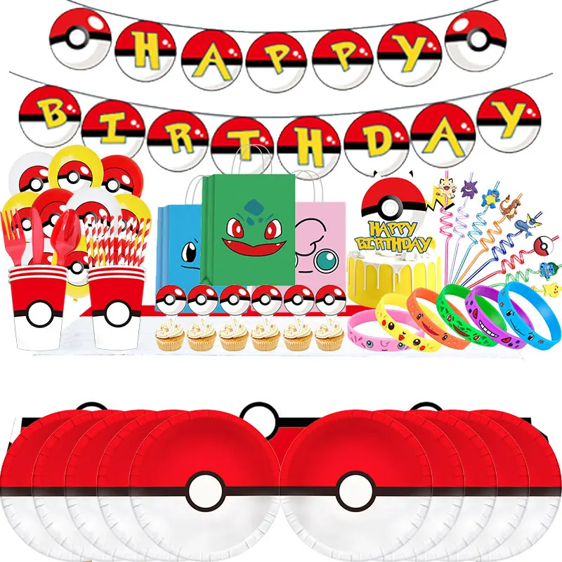 Decoraciones para fiesta de cumpleaños de Pokémon, vajilla, mantel, platos, servilleta, pancarta, decoración de cumpleaños, globos, regalos para niños