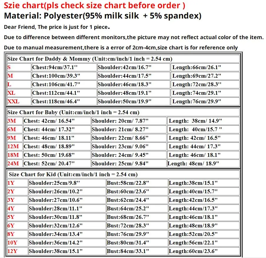 Consejos cálidos para ti ~Estimado amigo, el precio es solo por 1 pieza..Debido a la diferencia entre diferentes monitores, es posible que la imagen no refleje el color real del artículo.Debido a la medición manual, hay un error de 2 cm a 4 cm, la tabla de tallas es solo como referencia.P: ¿Cómo realizar pedidos para toda la familia (¿mamá+papá+niños+bebé?)