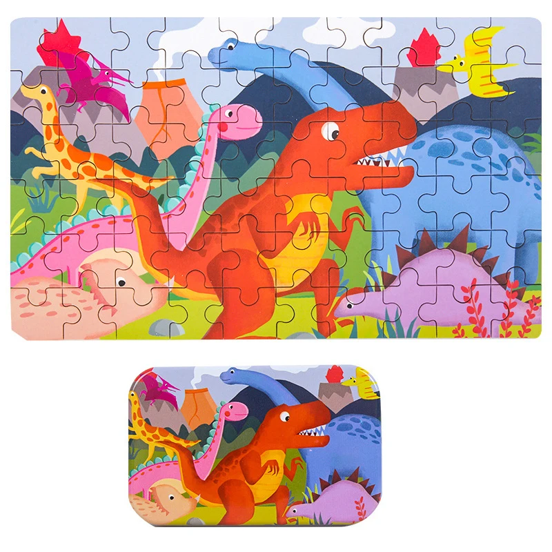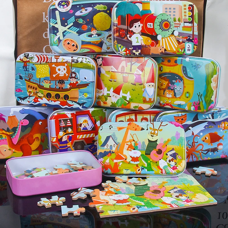 Dibujos animados niña niño niños niño juego de madera rompecabezas papel rompecabezas caja de hierro 60 caja de lata de Metal rompecabezas para niños juguete regalo de vacaciones