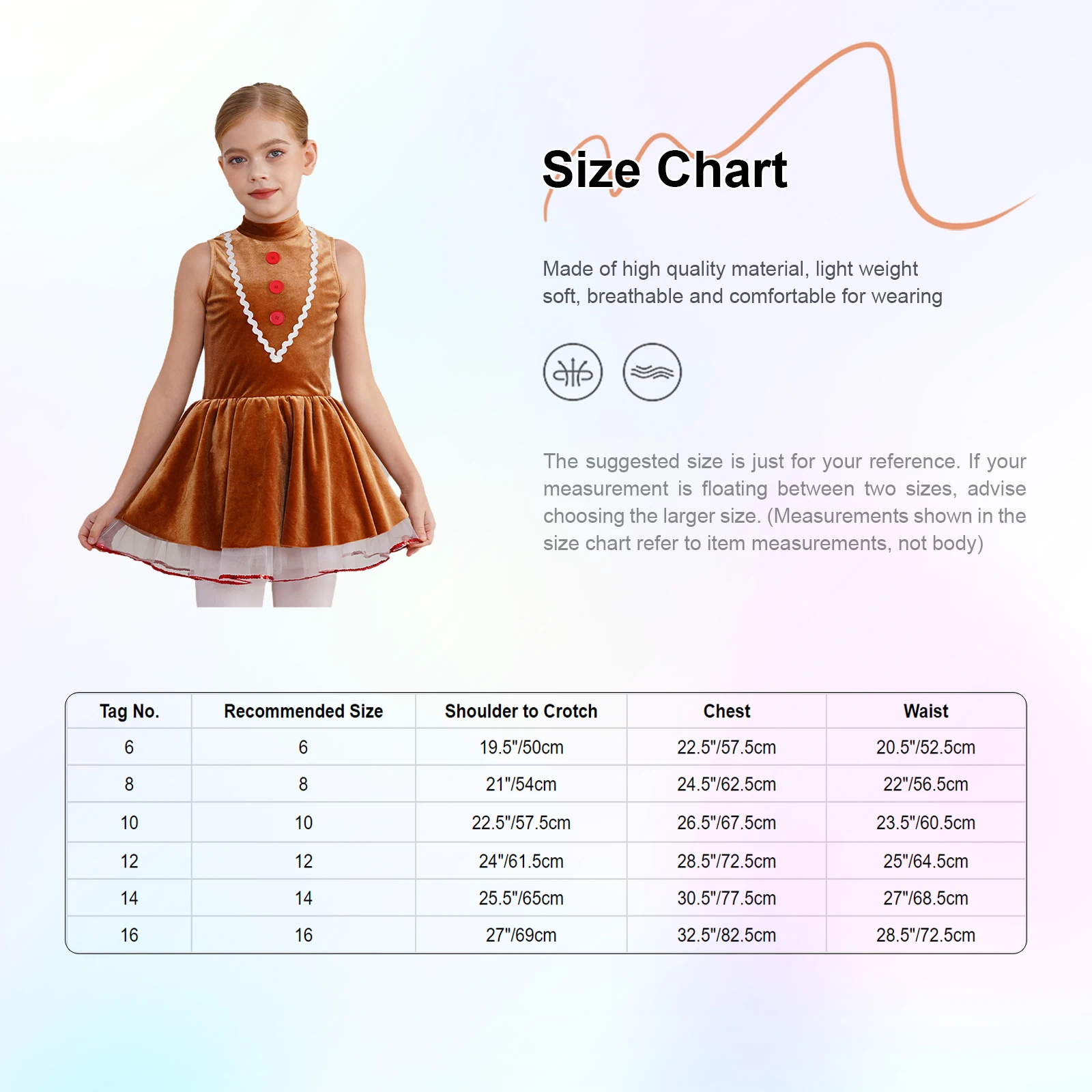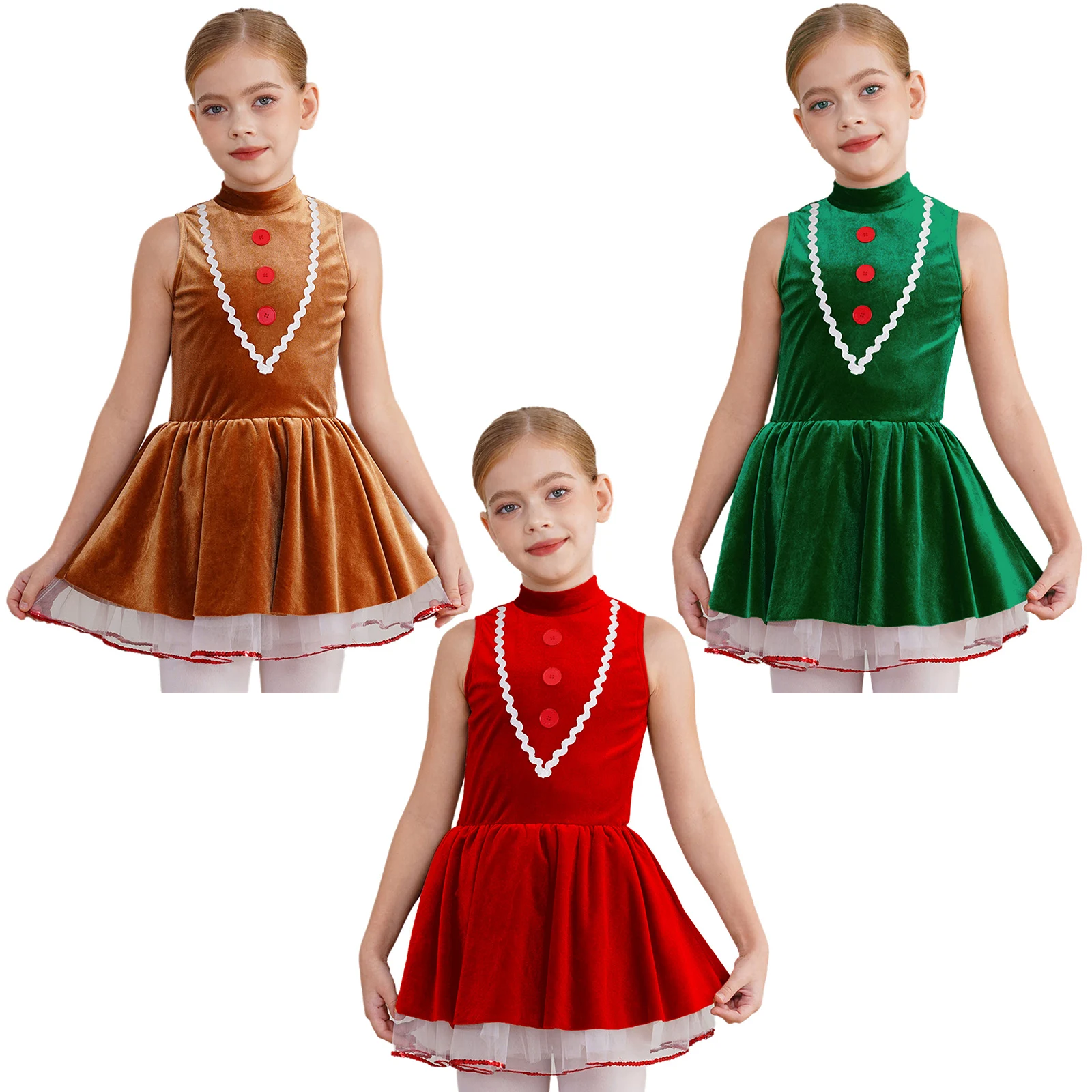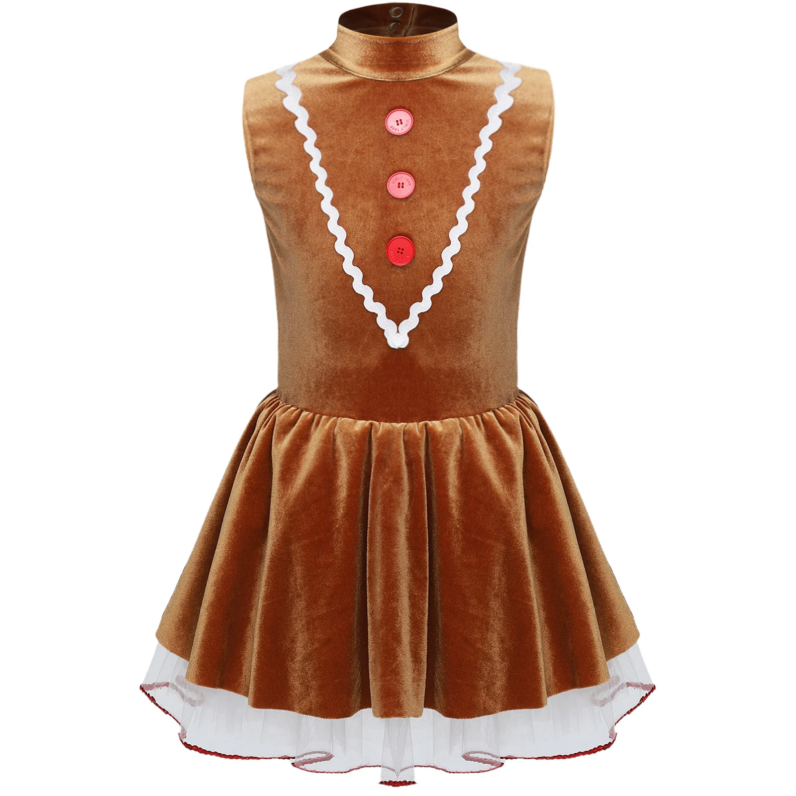 Disfraz navideño de hombre de jengibre de una pieza para talla infantil, es estilo leotardo con vestido de terciopelo y dobladillo tutú.