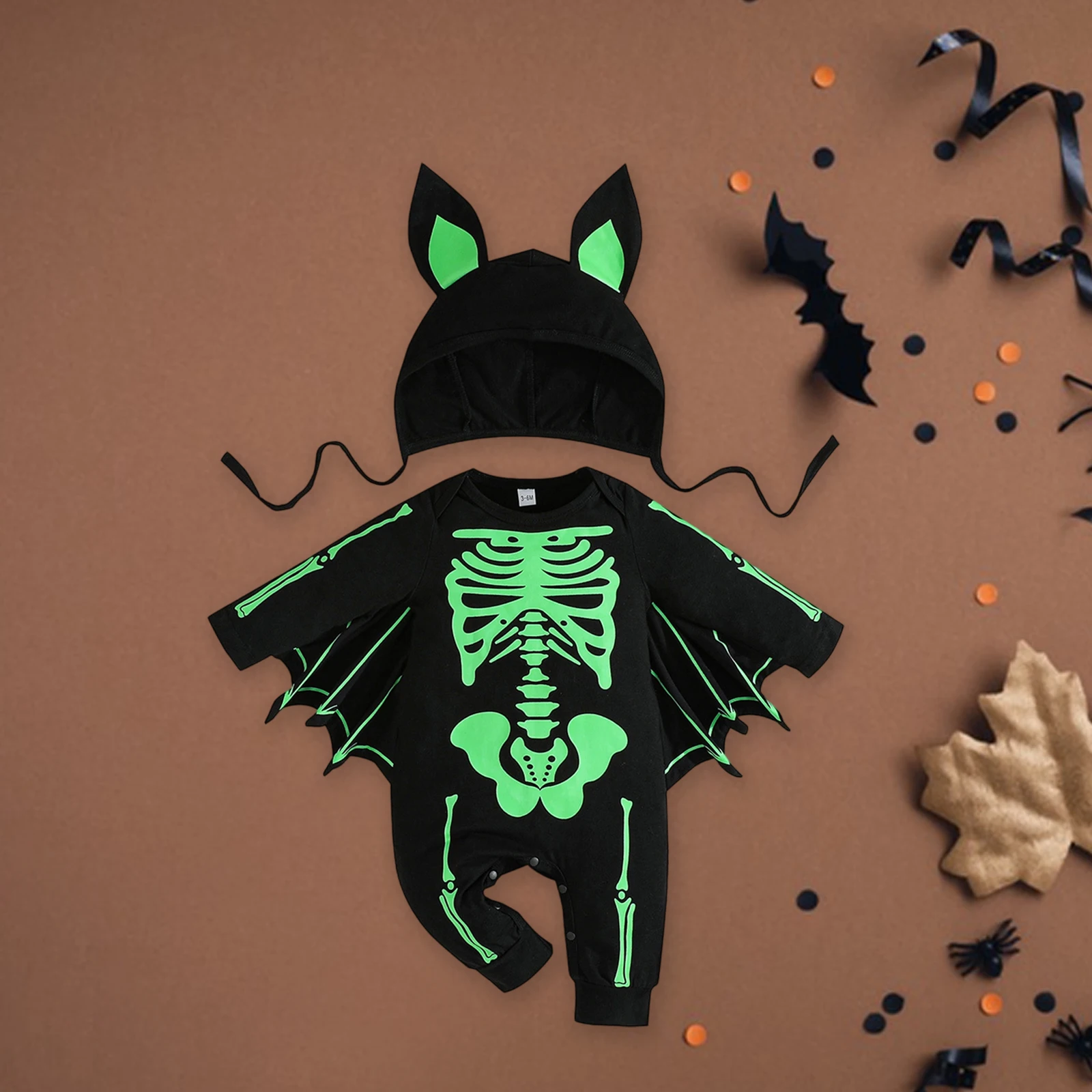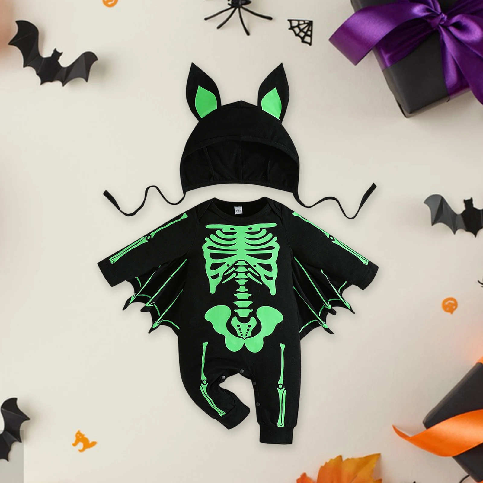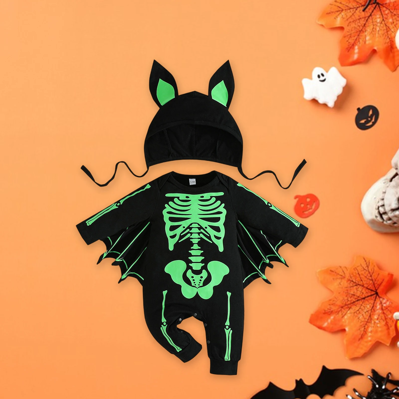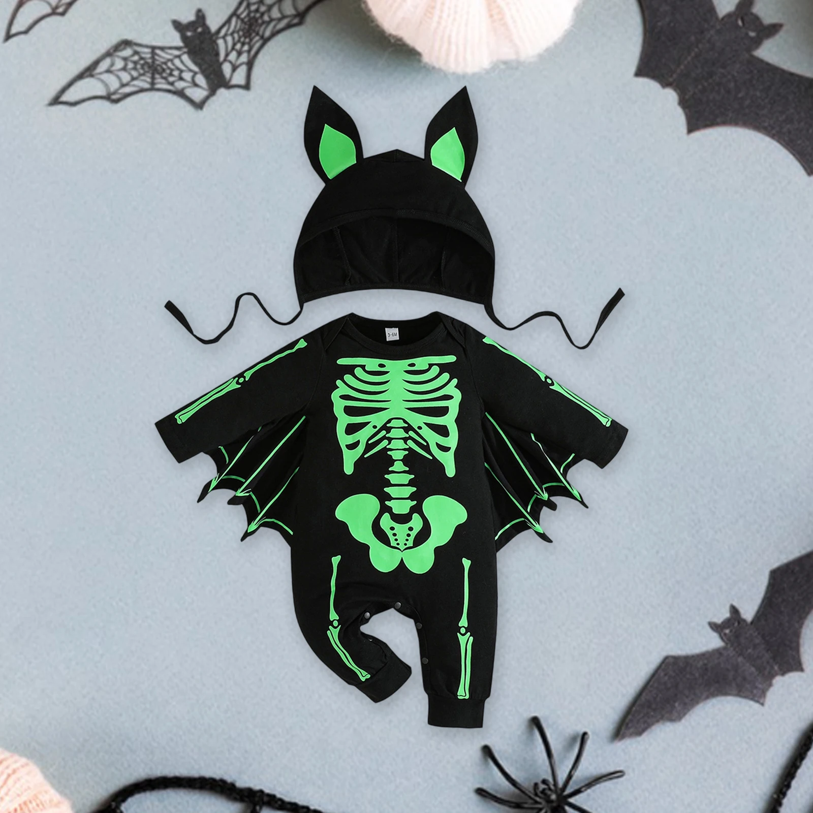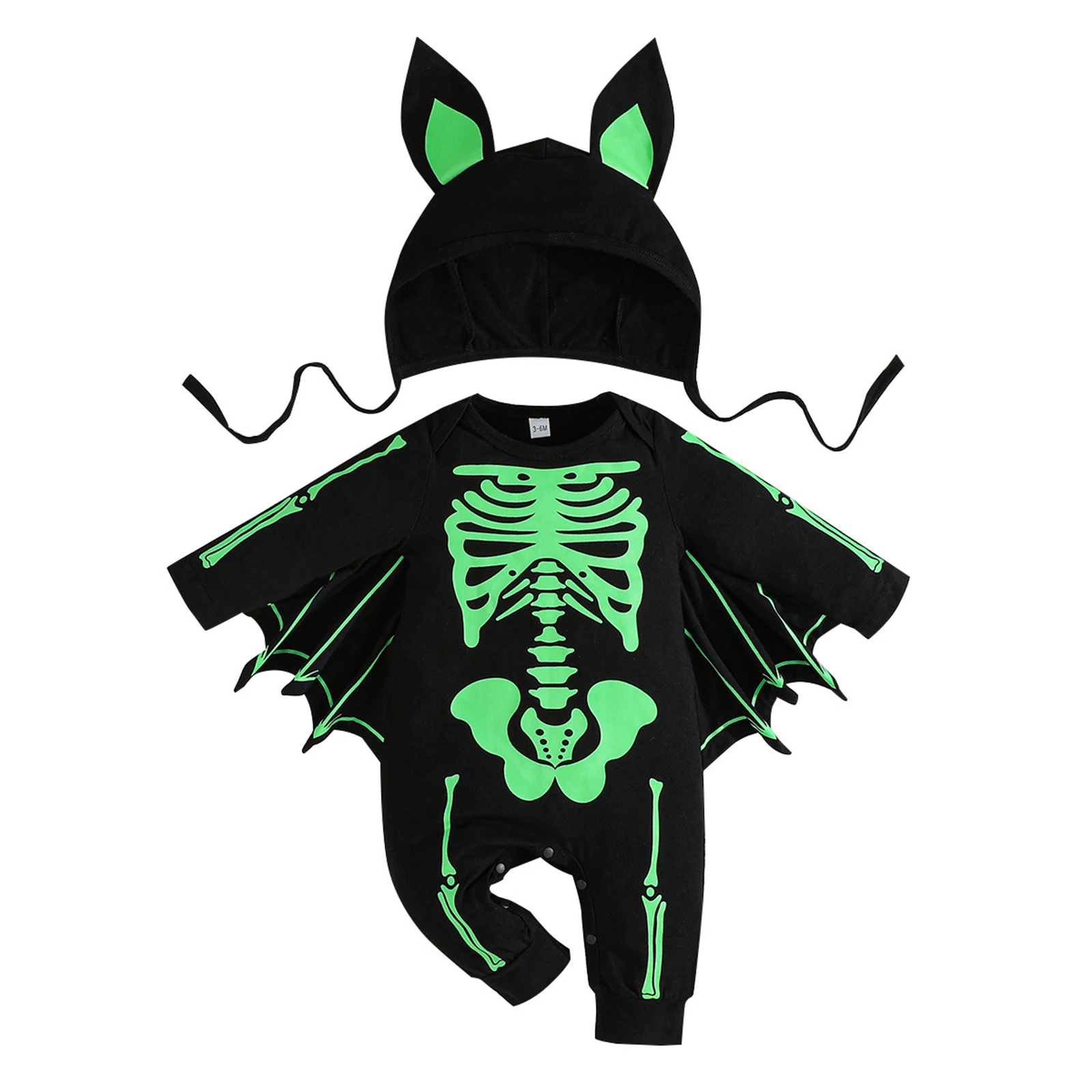 Comprar Disfraz de murciélago para bebé, mono de manga larga con estampado de esqueleto de Halloween a la moda y sombrero