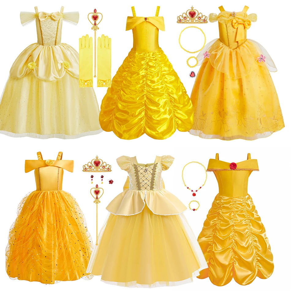 Comprar Disfraz de princesa para niños, disfraz de Bella amarilla para niñas, ropa de fiesta de actuación de cumpleaños, Carnaval y Halloween