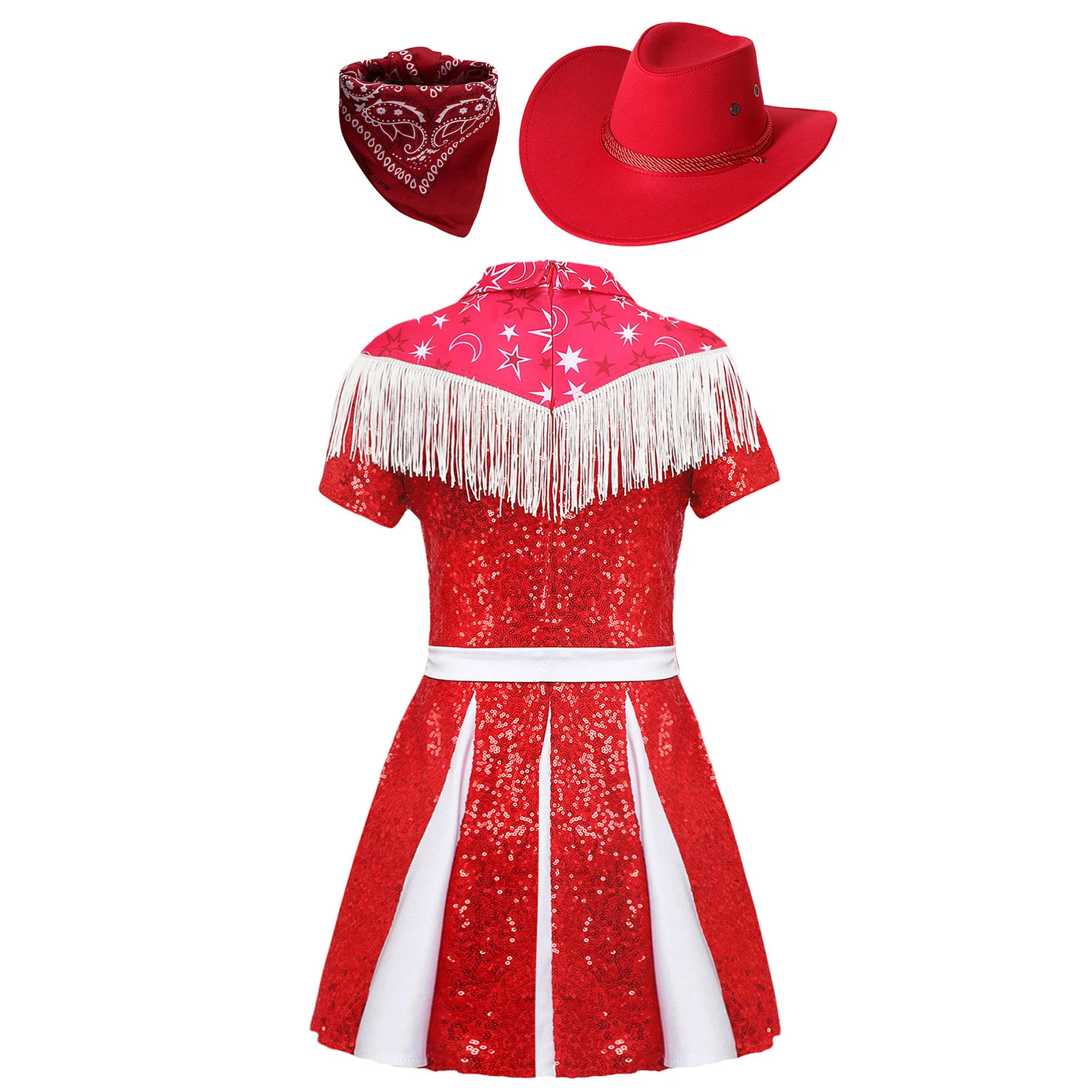 Comprar Disfraz de vaquera occidental para niñas, vestido plisado con lentejuelas y flecos para Halloween, Carnaval, con sombrero y pañuelo, vestido de juego de rol