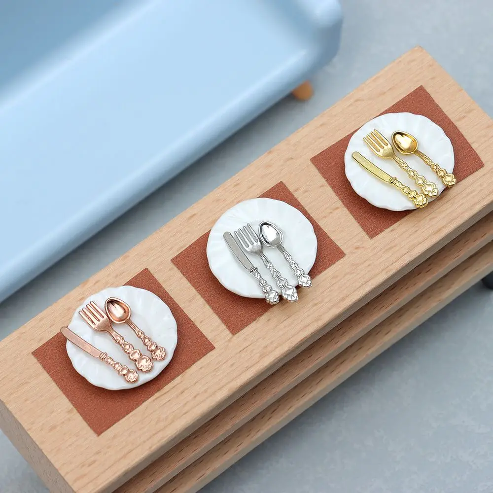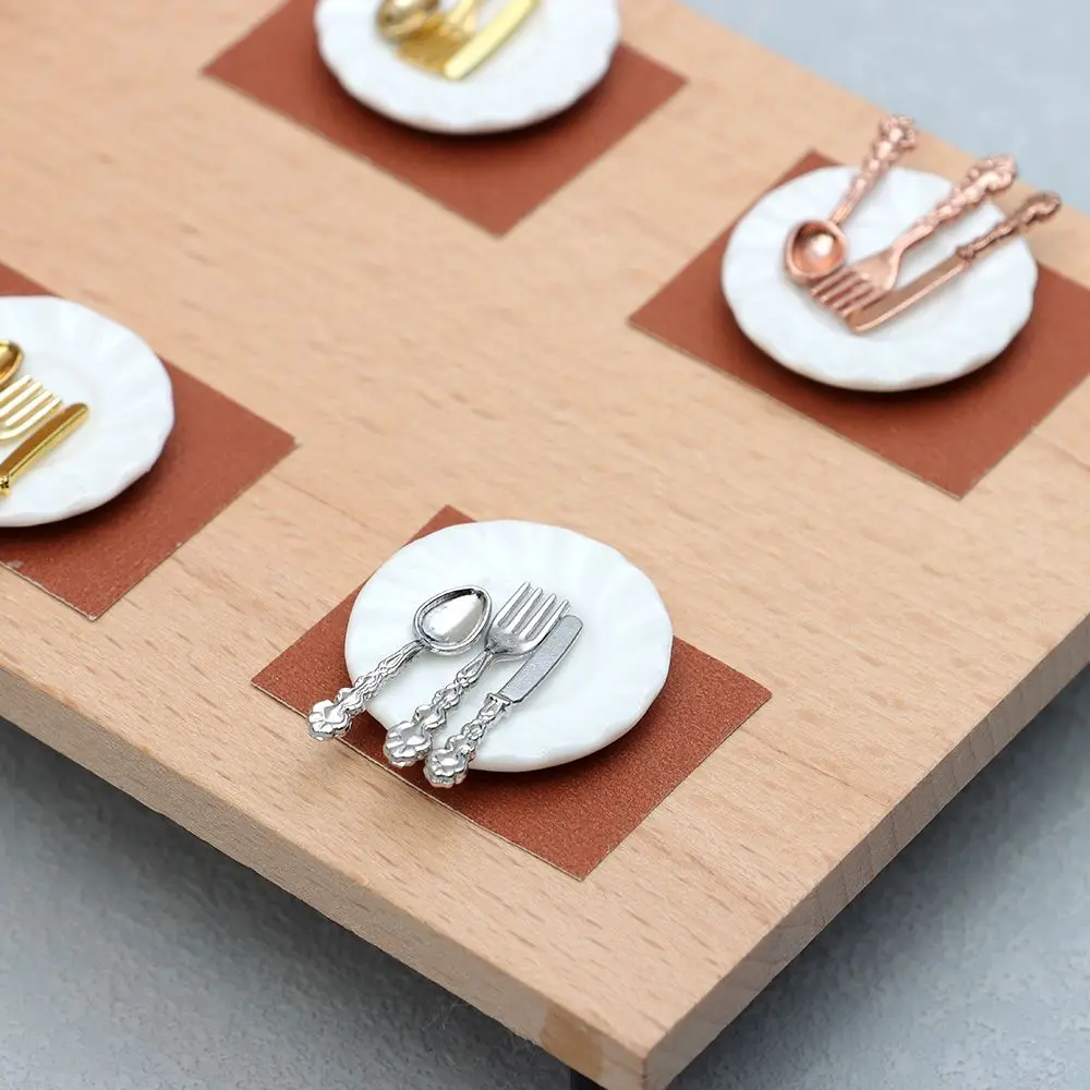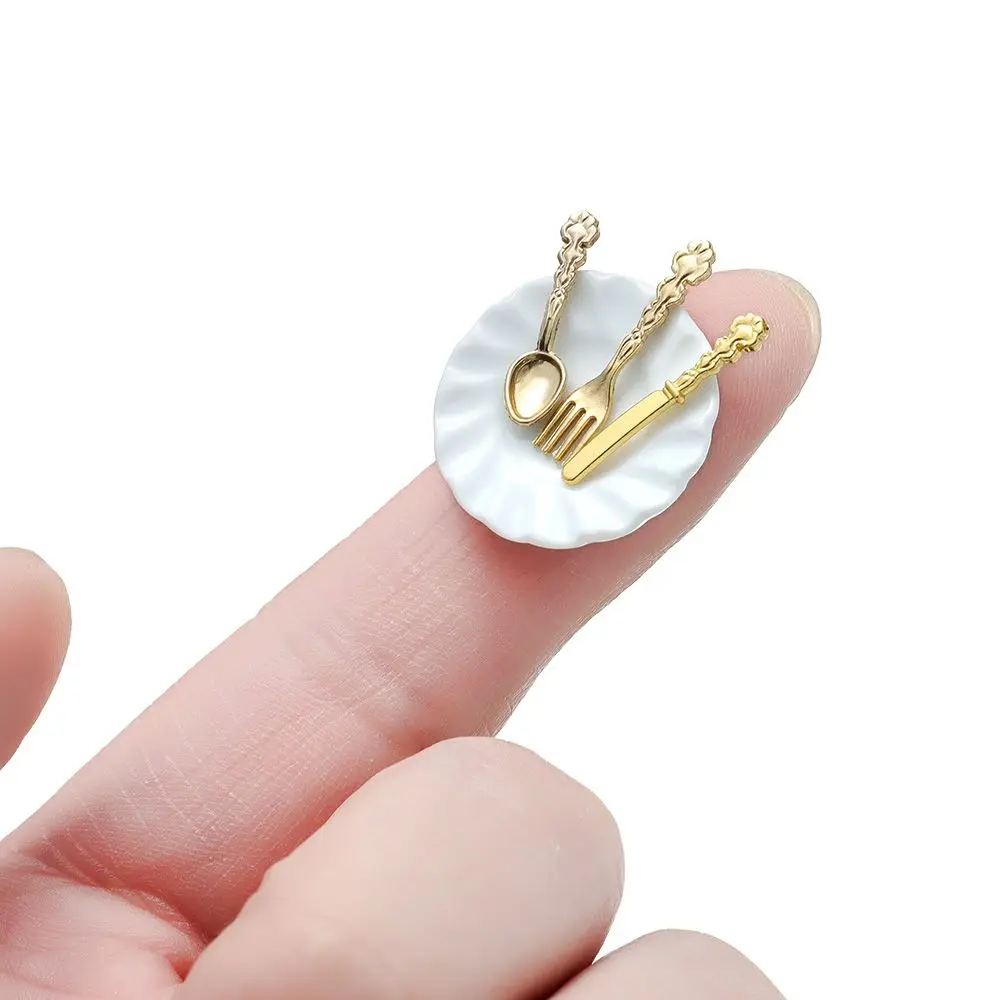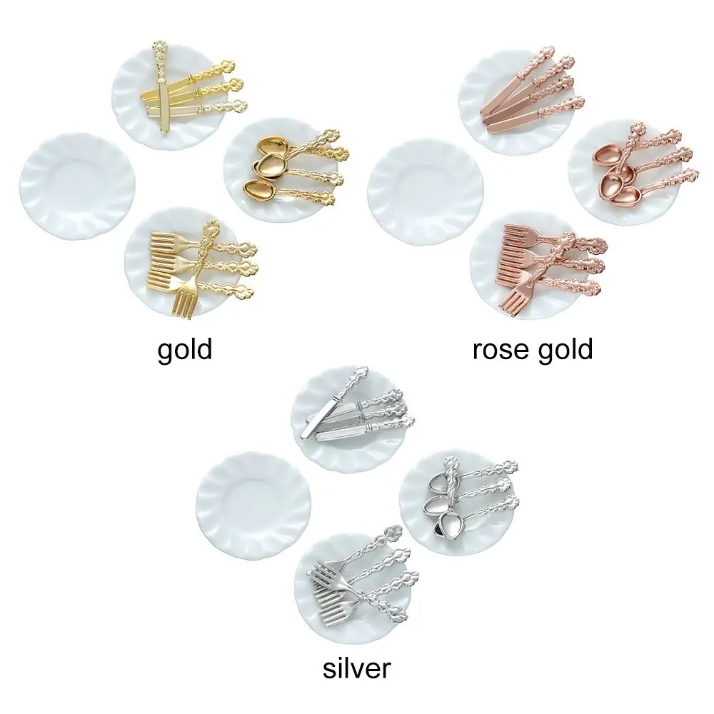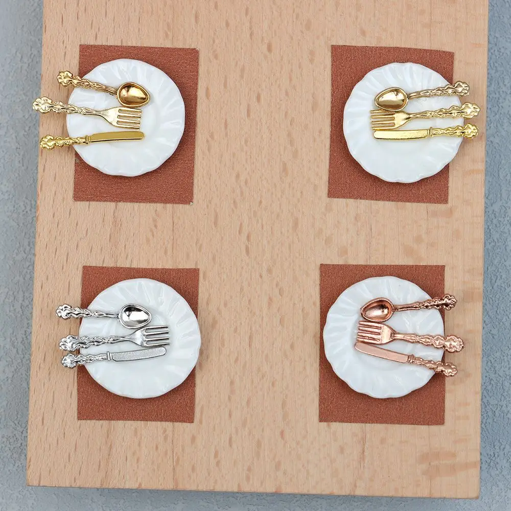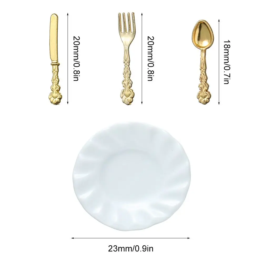 Description: 100% Brand New and High Quality. Material: Alloy+ceramics Color: Gold/Silver/Rose gold Size: As the picture shows(Approx.) Packing list: 4 * Fork 4 * Knife 4 * Spoon 4 * Plate Please attention: it is really small miniature, please study the size before you buy it to avoid misunderstanding, thanks! Notice: 1. Please allow 1-3mm error due to manual measurement. pls make sure you do not mind before your purchase. 2. The colors may have different as the difference display,pls understand.