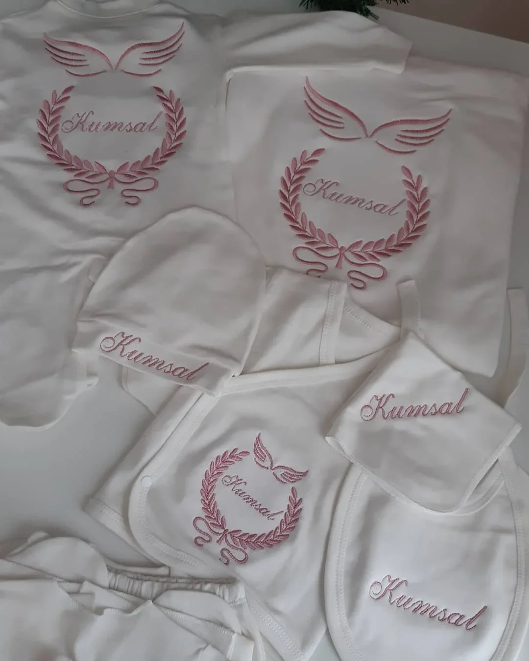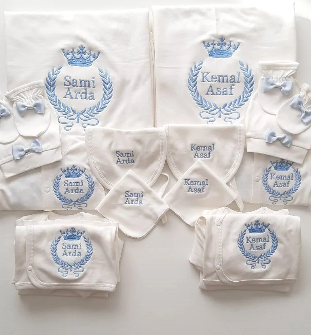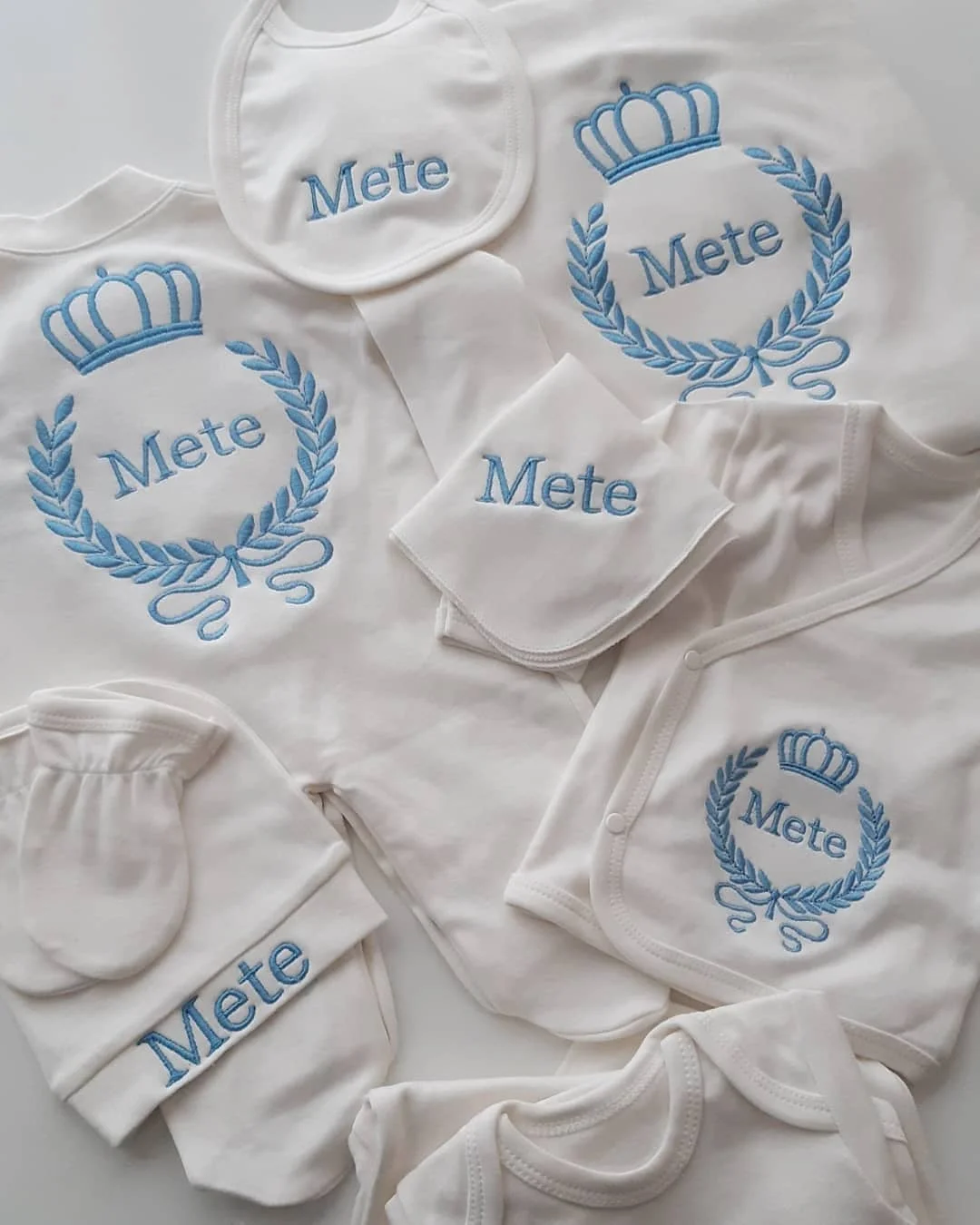 Nuestro juego de 10 piezas está hecho de algodón suave y grueso.Ofrecemos un servicio personalizado con nombres para trabajos de bordado.