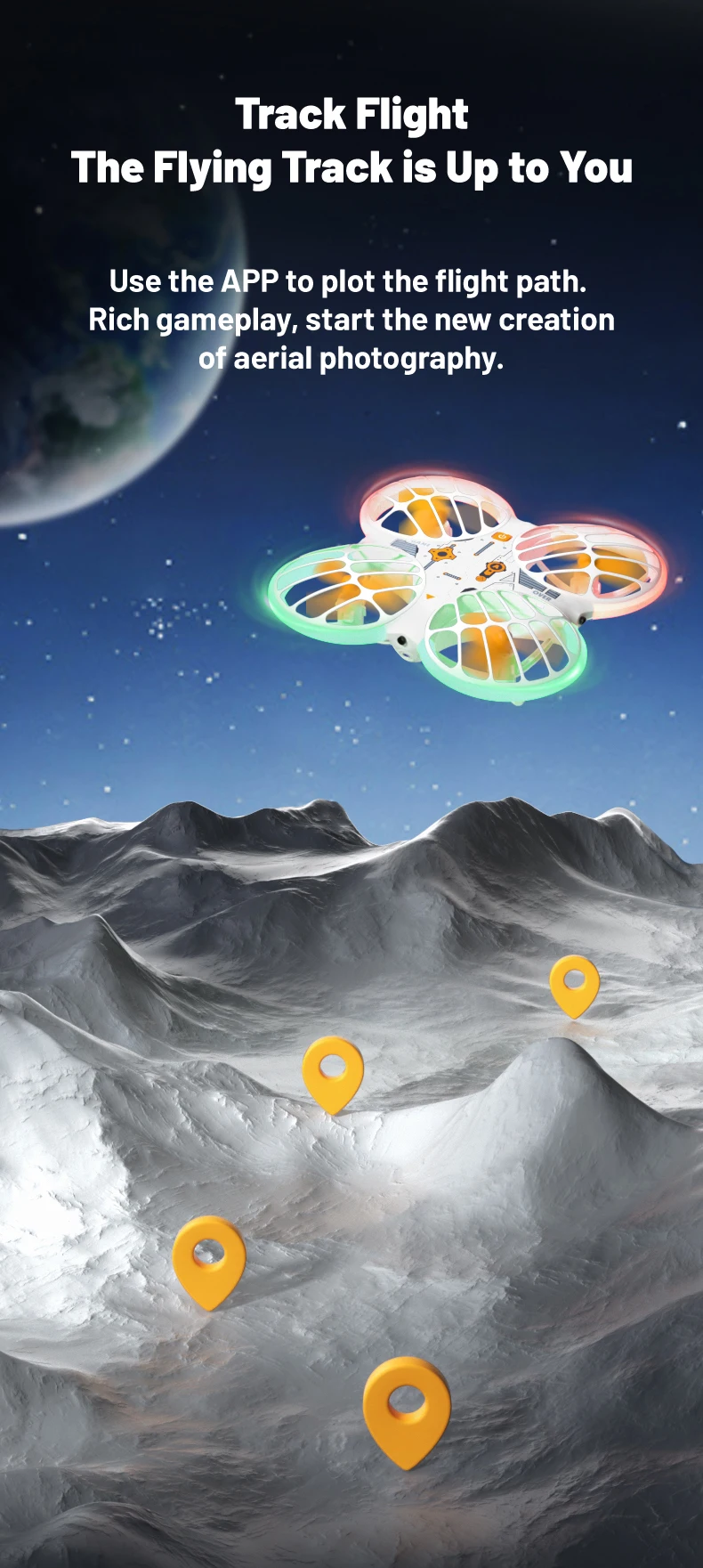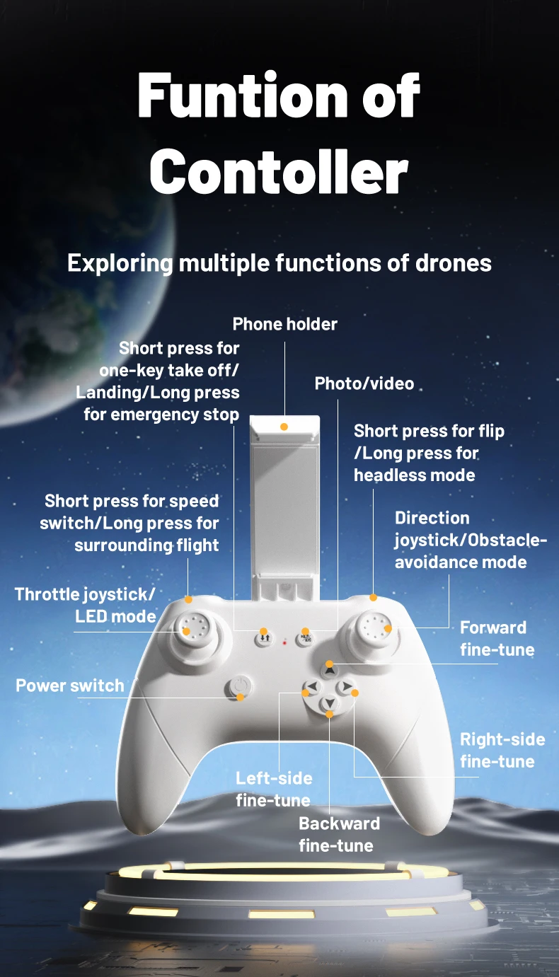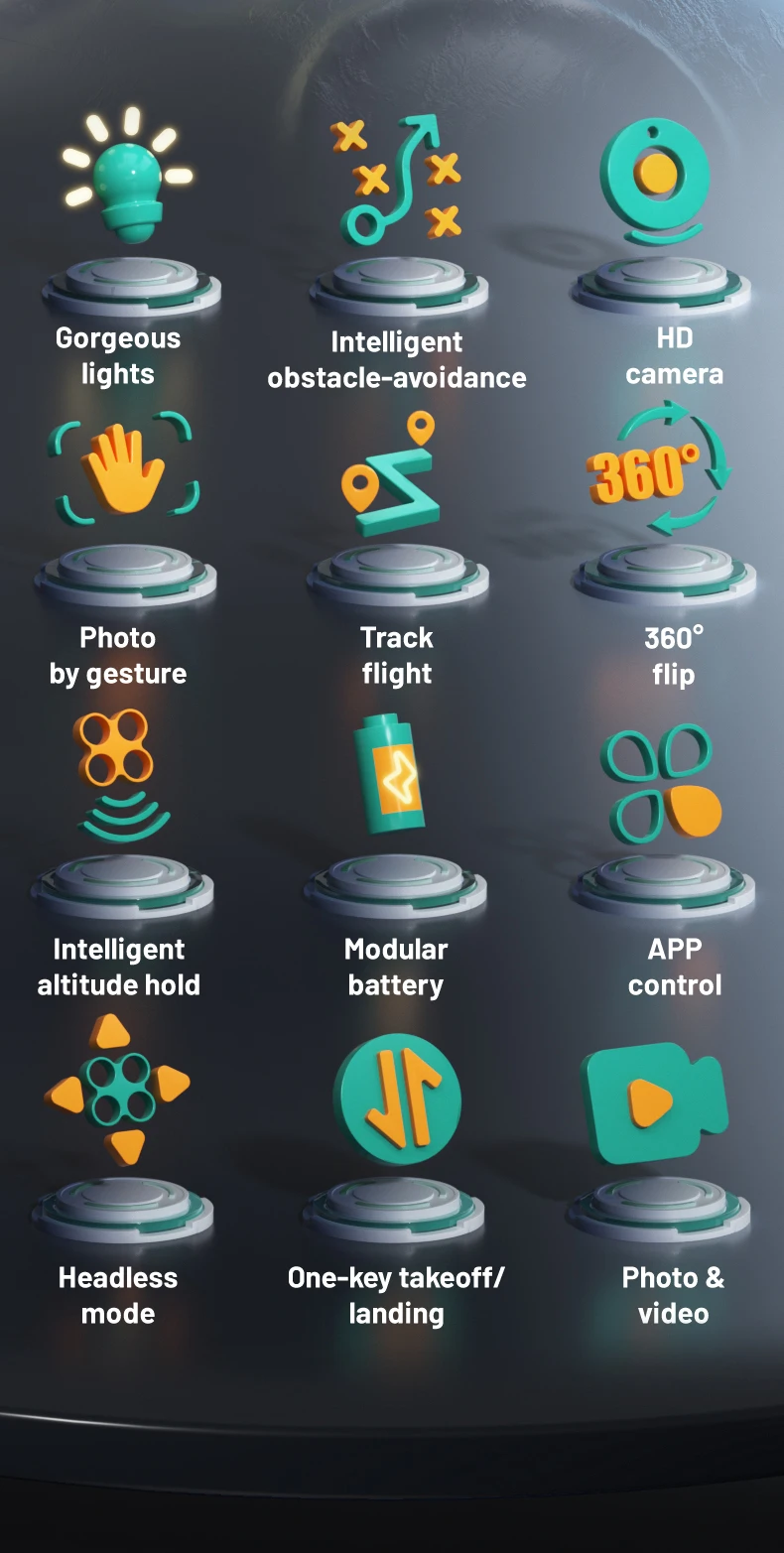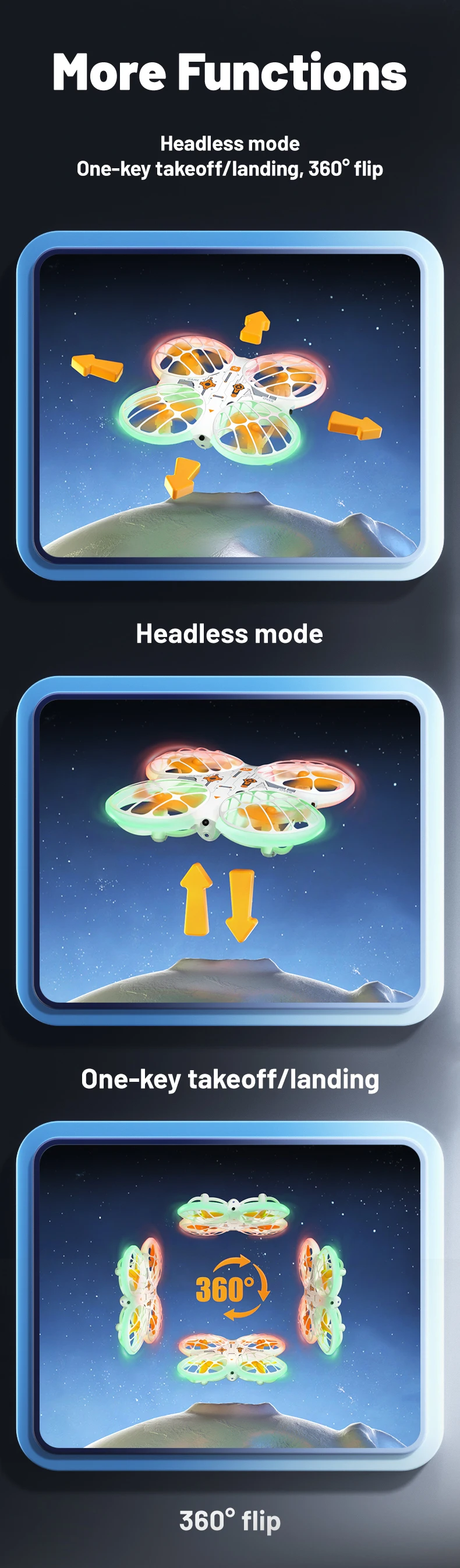 Despegue con un solo botón/tierra con un solo botón/subir/bajar/parada de emergencia/girar a la izquierda/derecha/360° roll/modo sin cabeza/Rápido/lento/surround de un botón/ajuste fino de dirección/función para evitar obstáculos/grabación de cámara (se requiere versión de cámara)