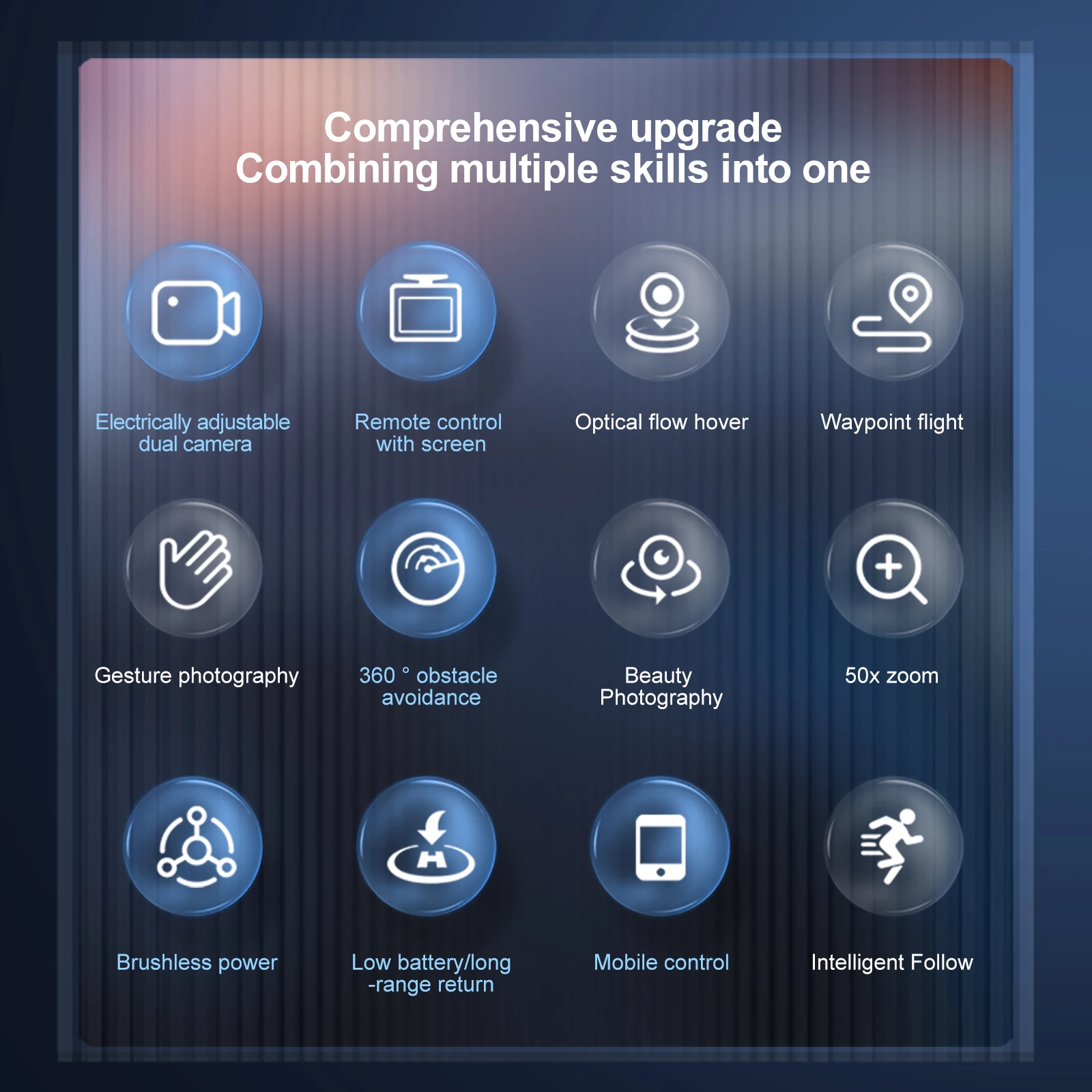 3. Funciones del sistema de conexión WIFI: tomar fotografías, grabar videos y transmitir en tiempo real, parada de emergencia, vuelo de trayectoria, círculo con un solo clic, seguimiento inteligente, agregar música, rotación de imágenes.