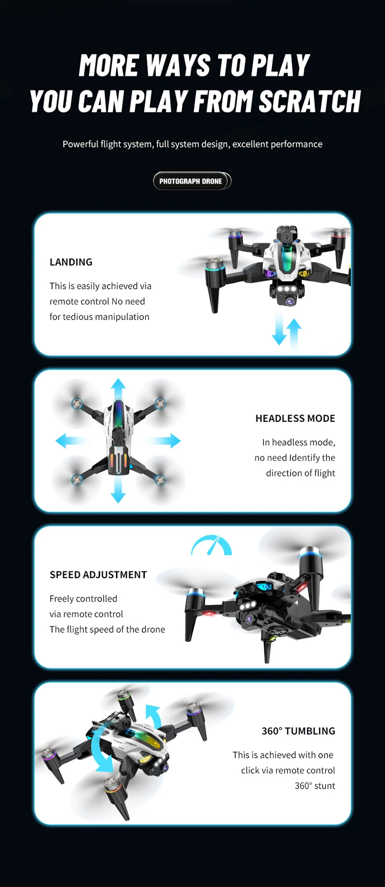 1.Evitación de obstáculos en todos los lados, posicionamiento de flujo óptico para vuelo, plegable y portátil, seis direcciones con giroscopio, ascenso y descenso, avanzando y retroceso, volando hacia el lado izquierdo y derecho, girando, despegue con un clic, aterrizaje con un clic, dos Configuraciones de velocidad, modo sin cabeza.
