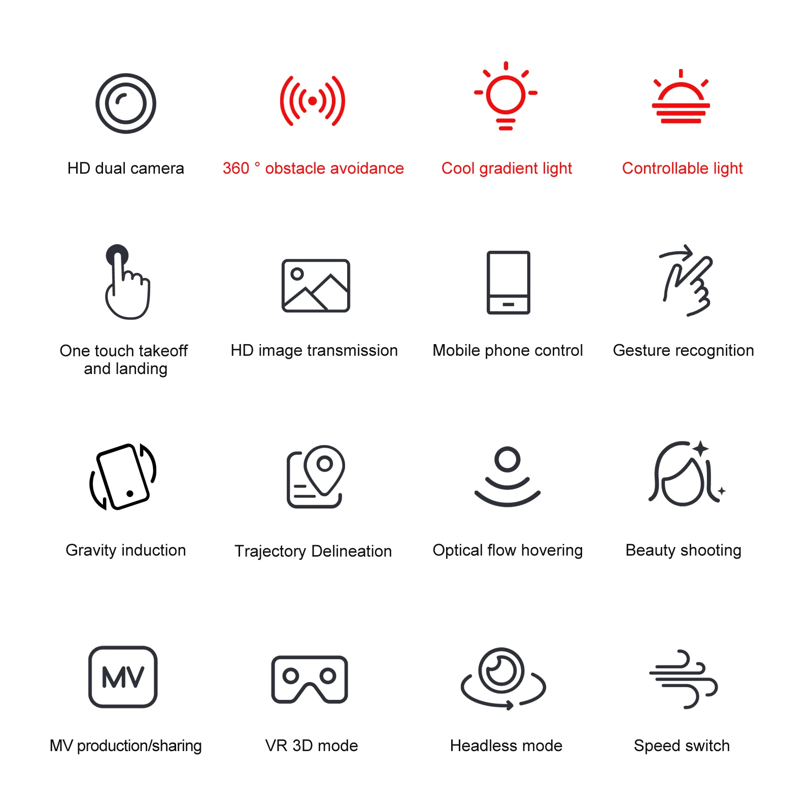 Velocidad máxima de ascenso: 3 km/hFunción:Luz de hoja de viento, hoja de viento transparente, evitación de obstáculos, plegado de aviones, giroscopio de seis bandas de paso; Despegue con un botón, aterrizaje con un botón, subida y bajada, hacia adelante y hacia atrás, vuelo del lado izquierdo y derecho, giro, modo sin cabeza, (con la cámara puede agregar funciones: Fotografía de gestos, video, modo sin cabeza, Parada de emergencia, trayectoria de vuelo, detección de gravedad, música, zoom 50x, fotografía automática)Características:Evitación de obstáculos, luz de pala de viento, súper resistencia a caídas, luz LED completaLista de embalajeAvión * 1